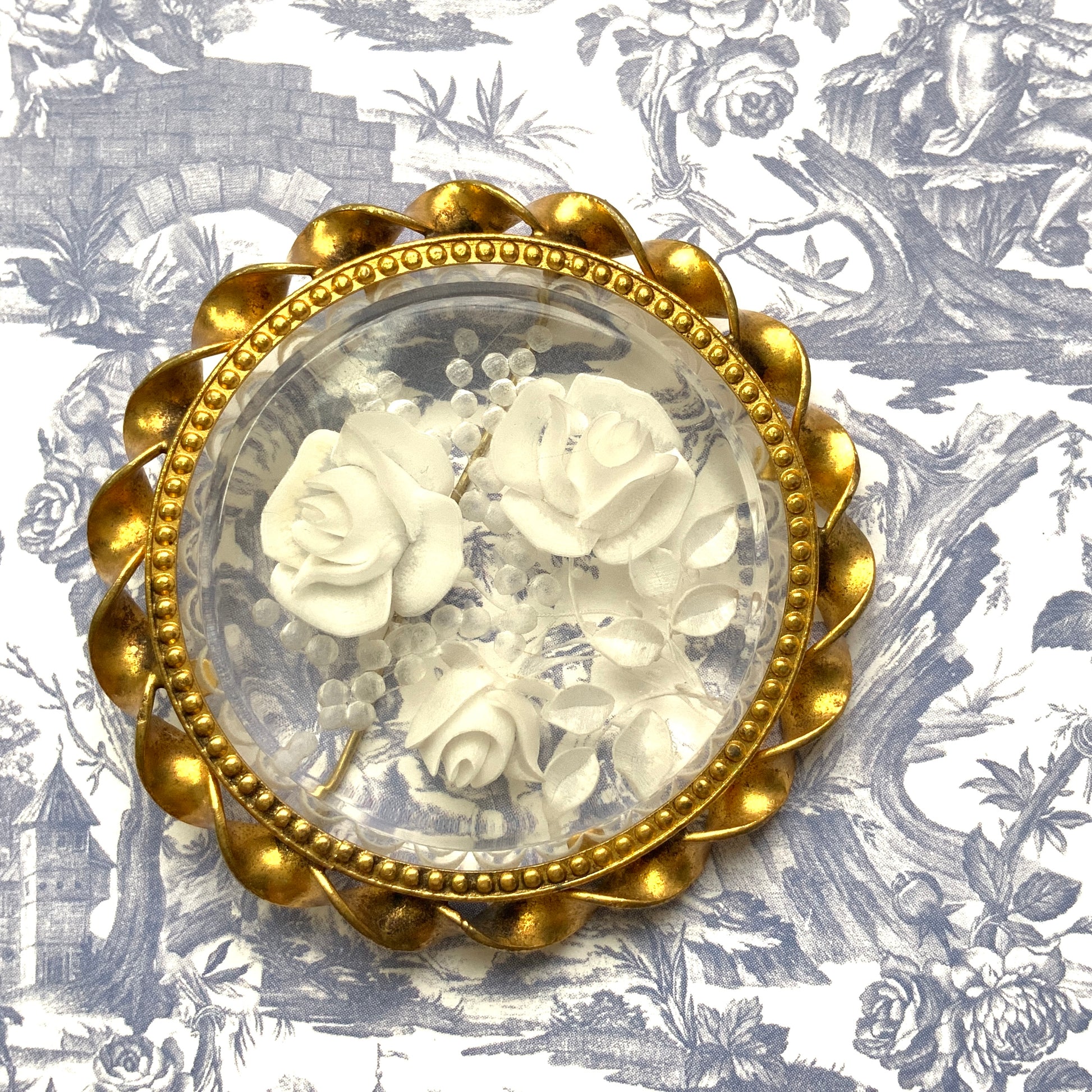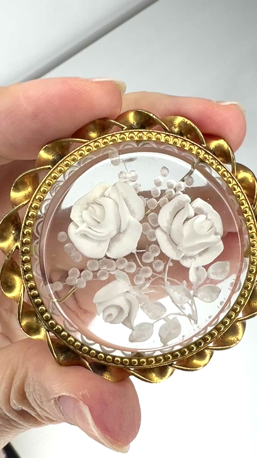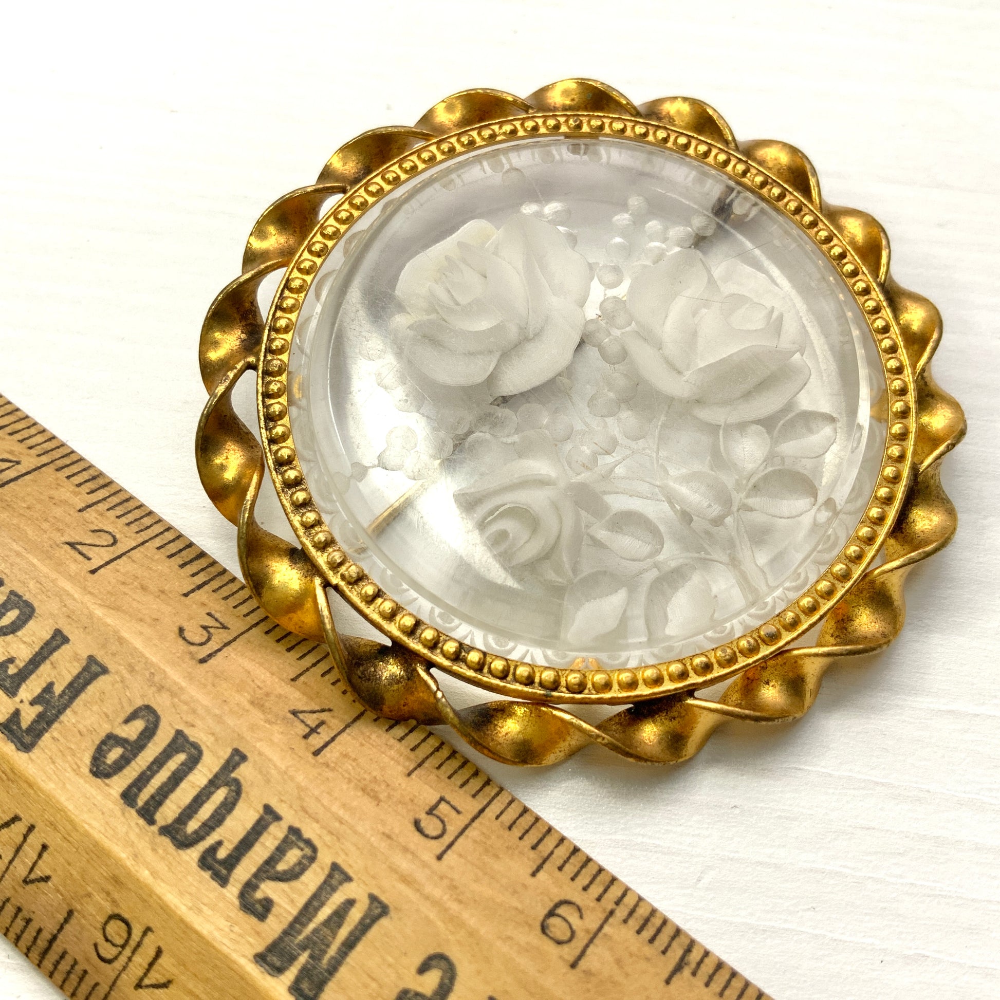 VINTAGE 1930-40's Reverse Carved White Rose Round Brooch
