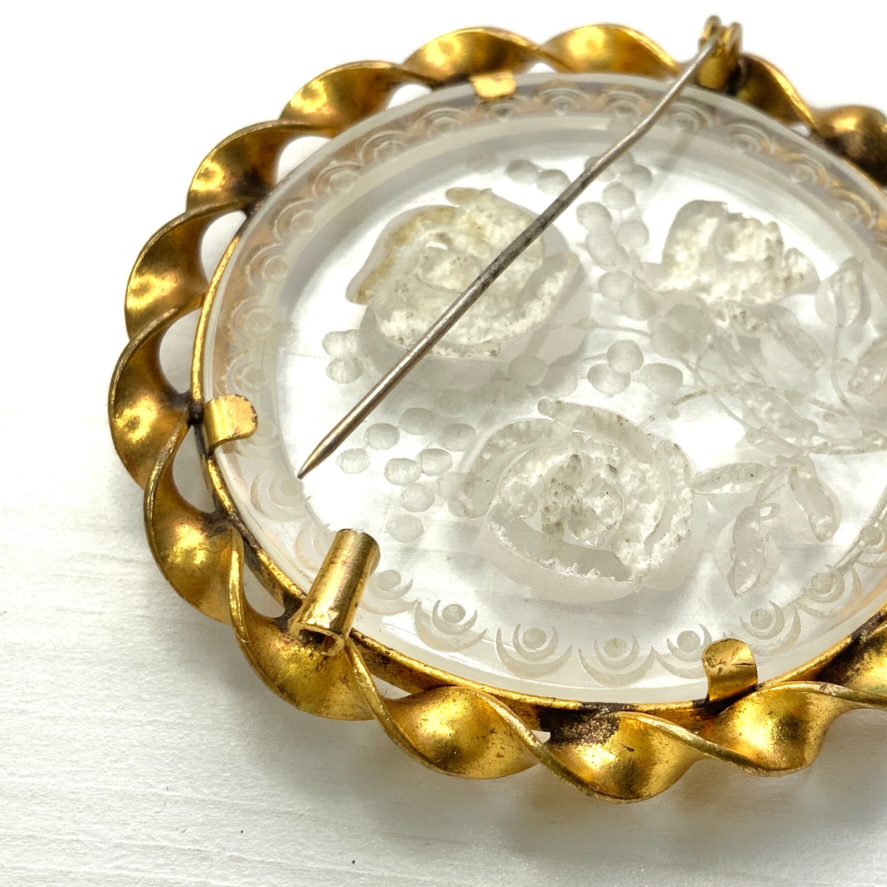 A plastic reverse carved brooch featuring beautiful rose branches and white berry-like fruits.
