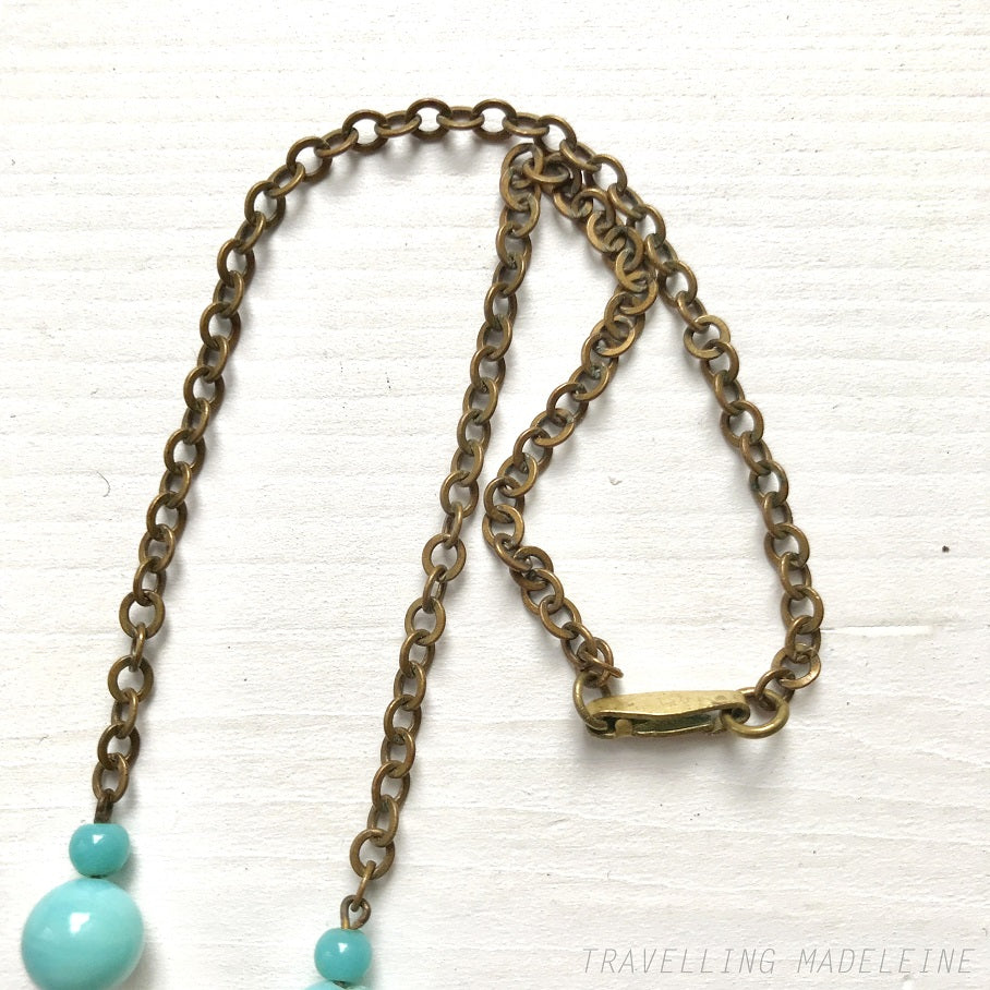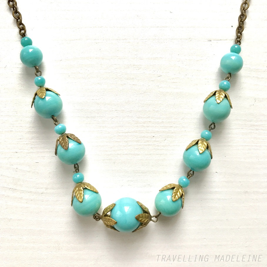 VINTAGE 1920's Turquoise Blue Glass & Gold Tone Leaf Necklace