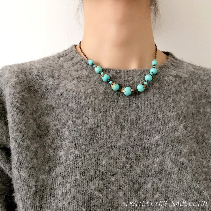 明るいターコイズブルーが美しいヴィンテージ のグラスネックレス。
