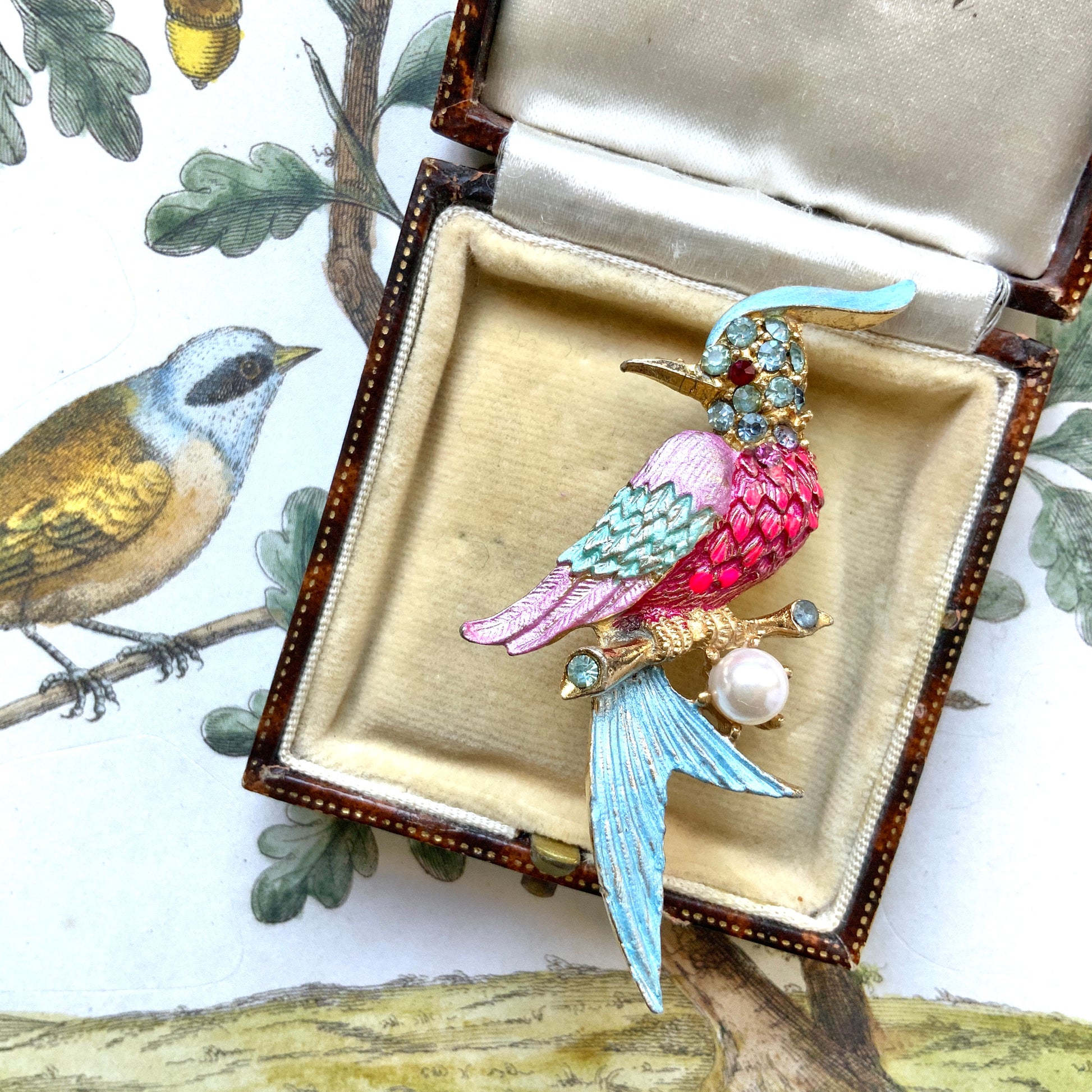 VINTAGE 1960s Colourful Enamel Parrot Bird on Branch Brooch