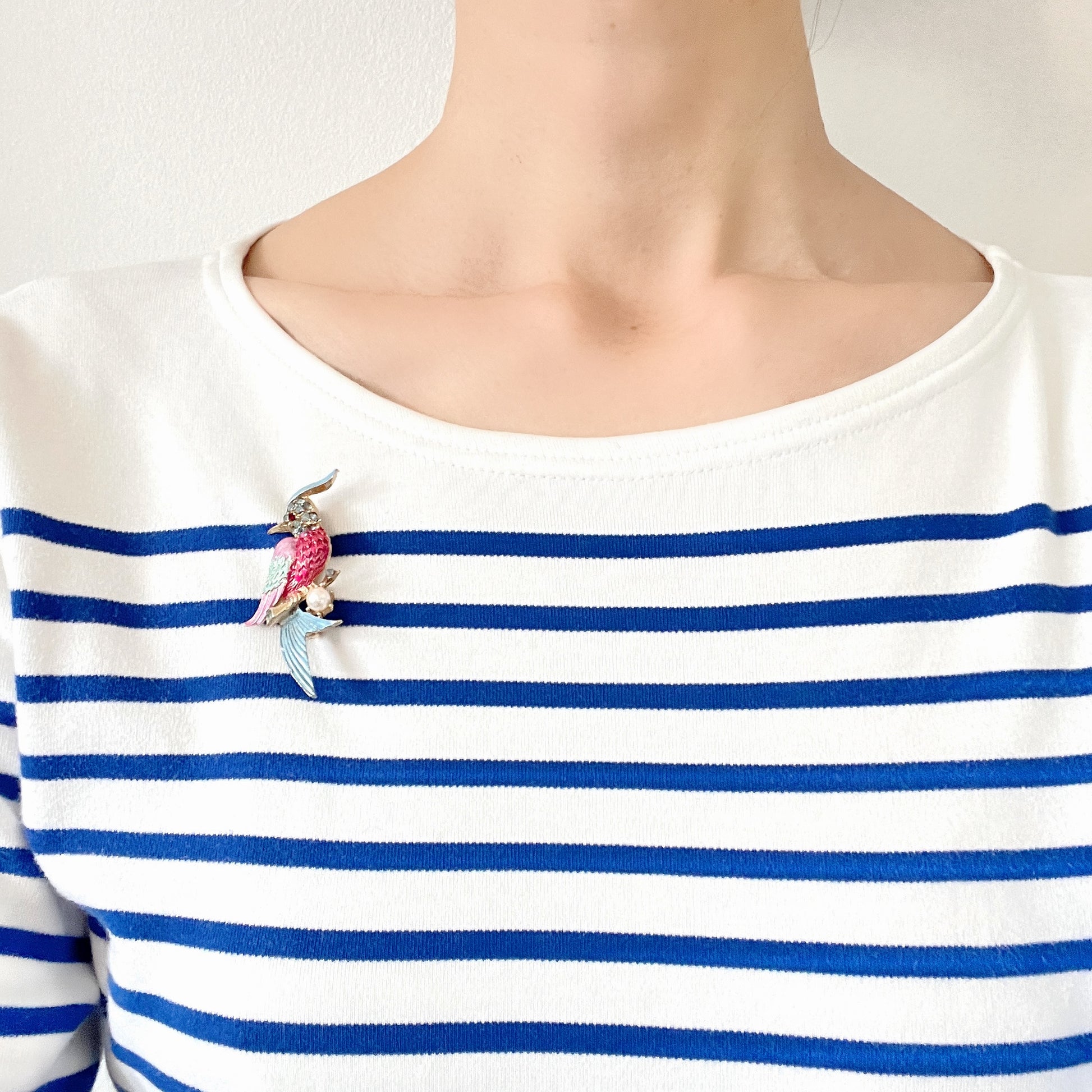 とても鮮やかでカラフルな色が羽にエナメルペイントされたオウムのブローチ。