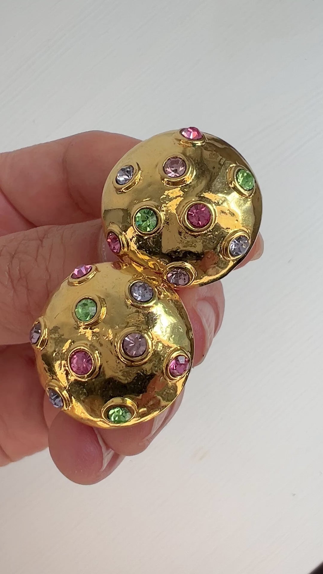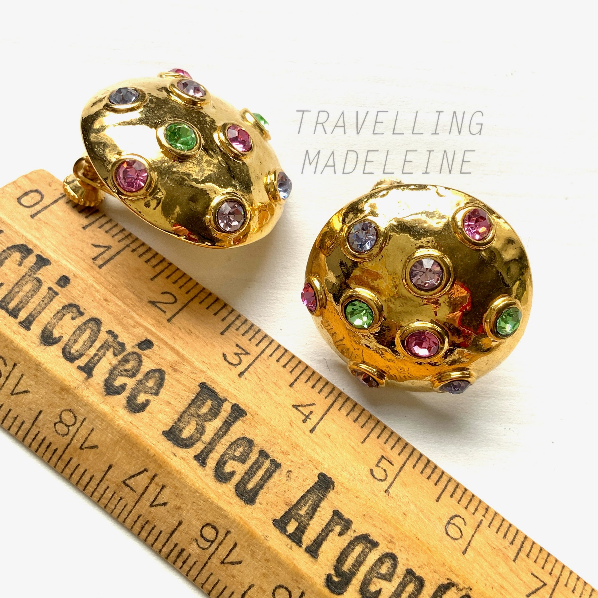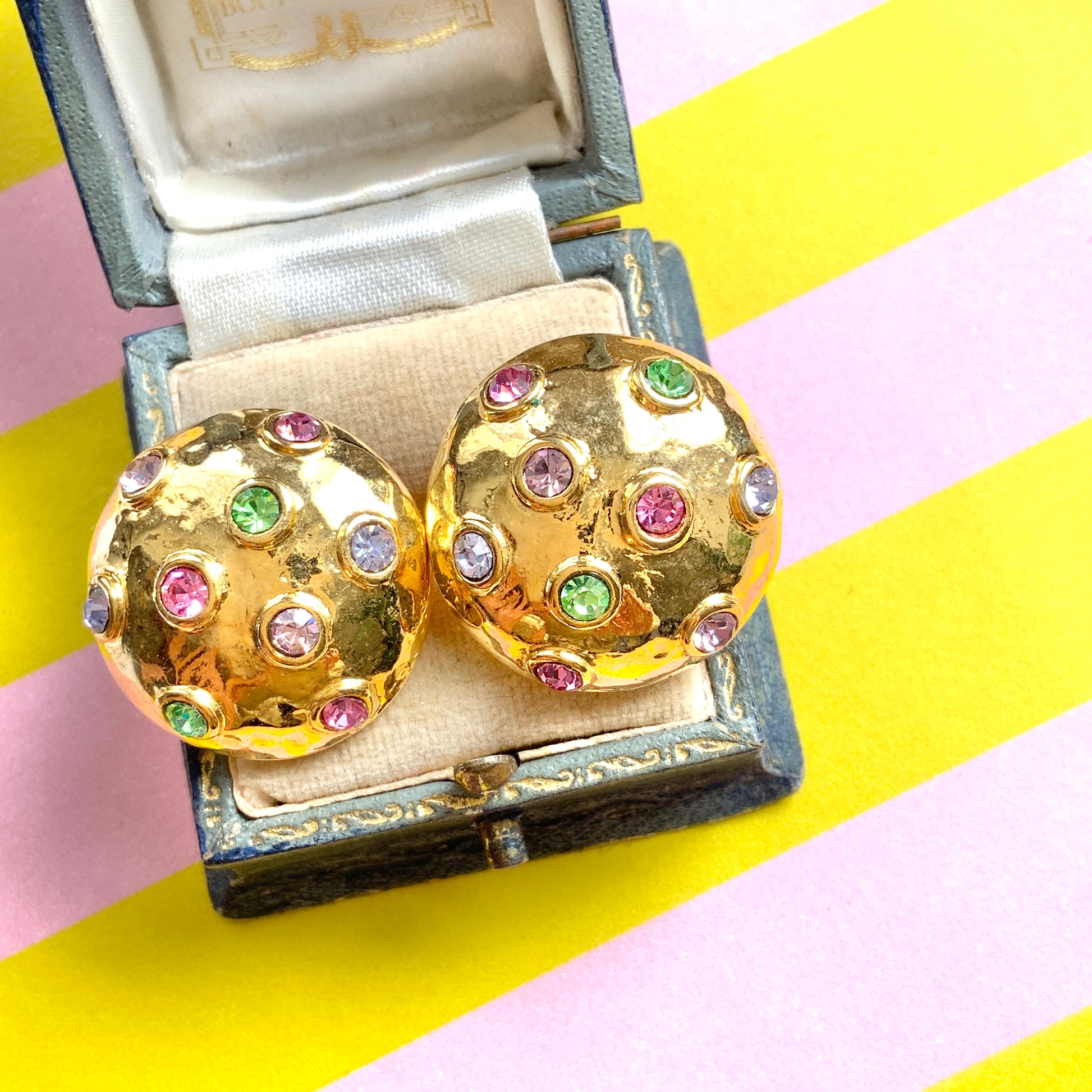 ゴールドトーンのドームにパステルカラーのラインストーンが光るクリップイヤリング。