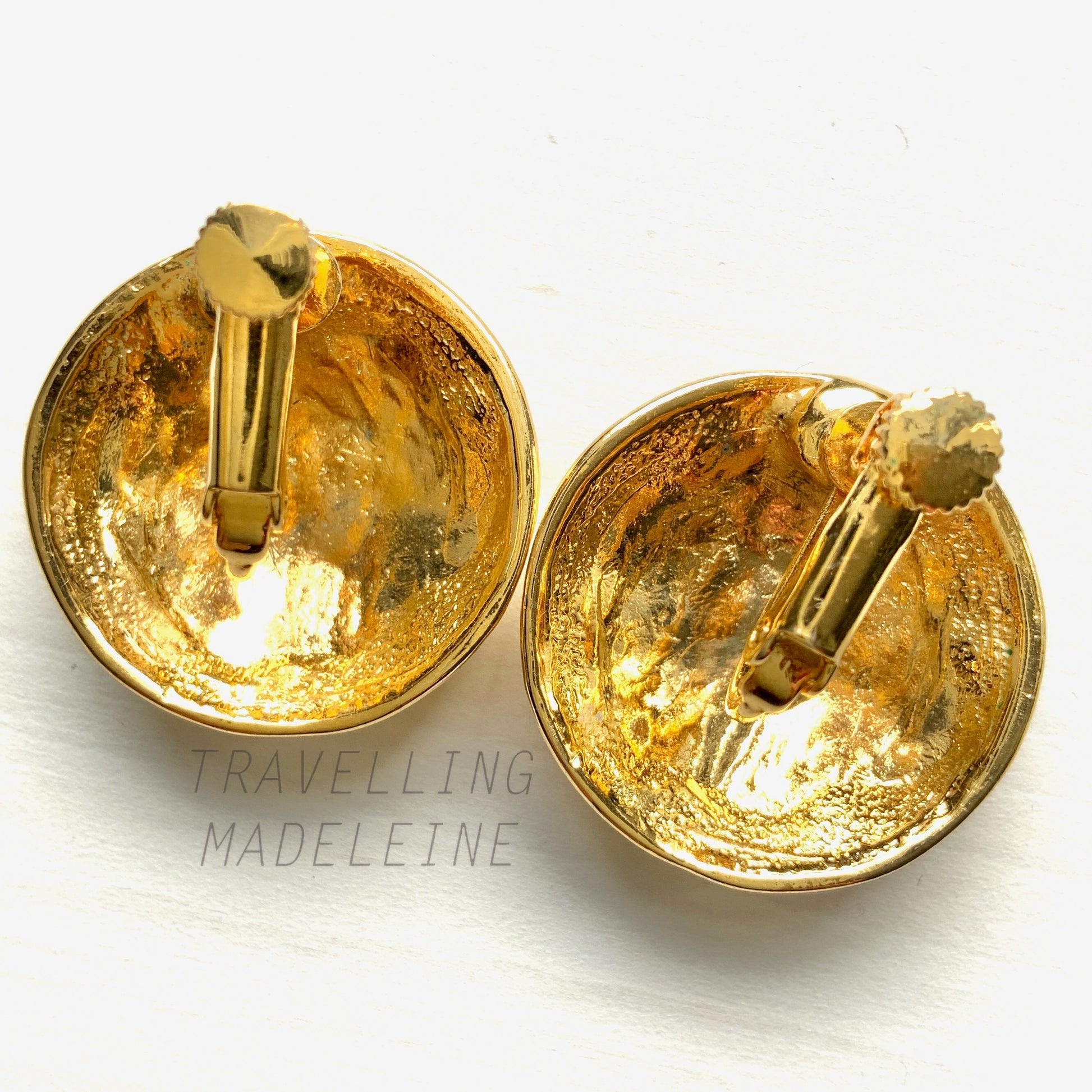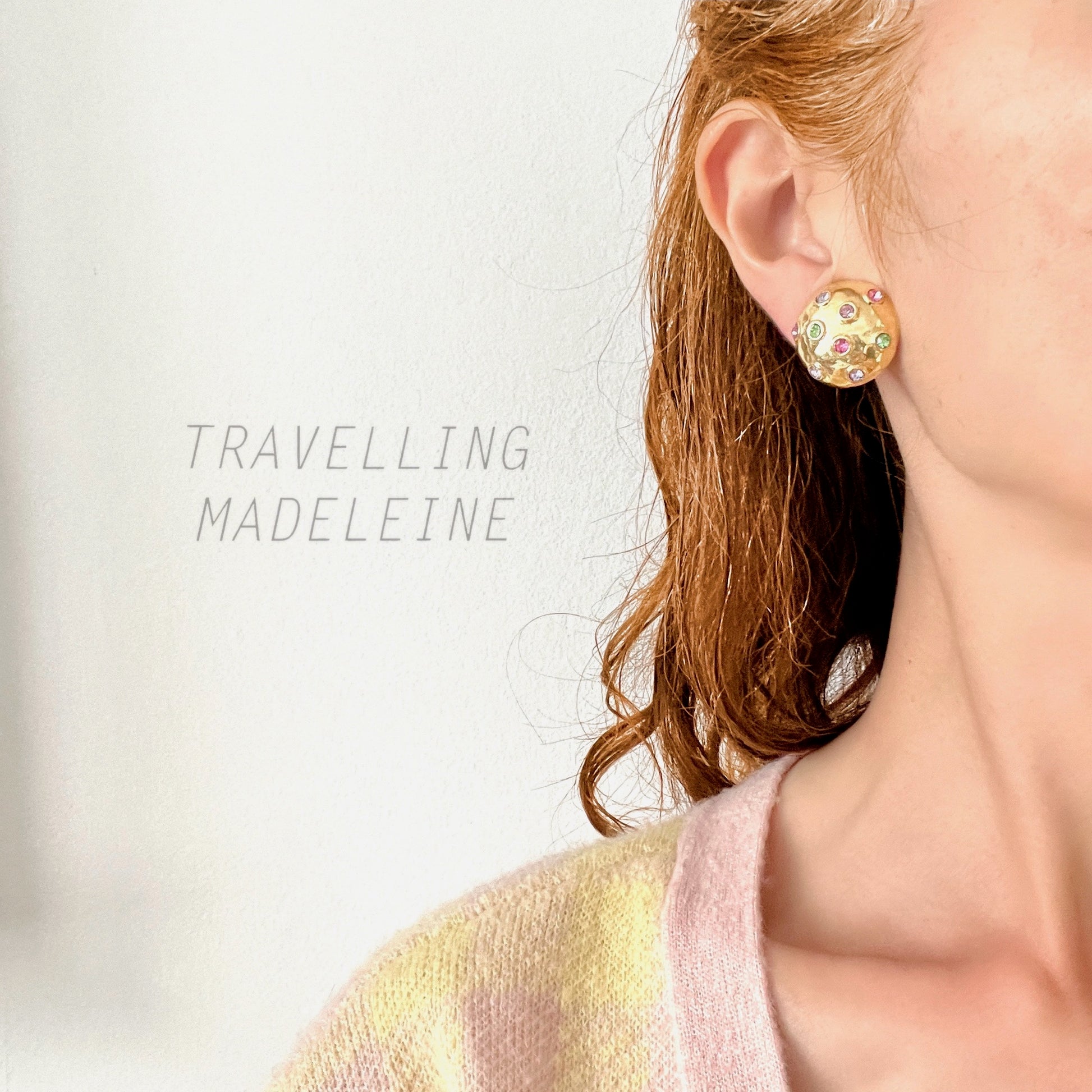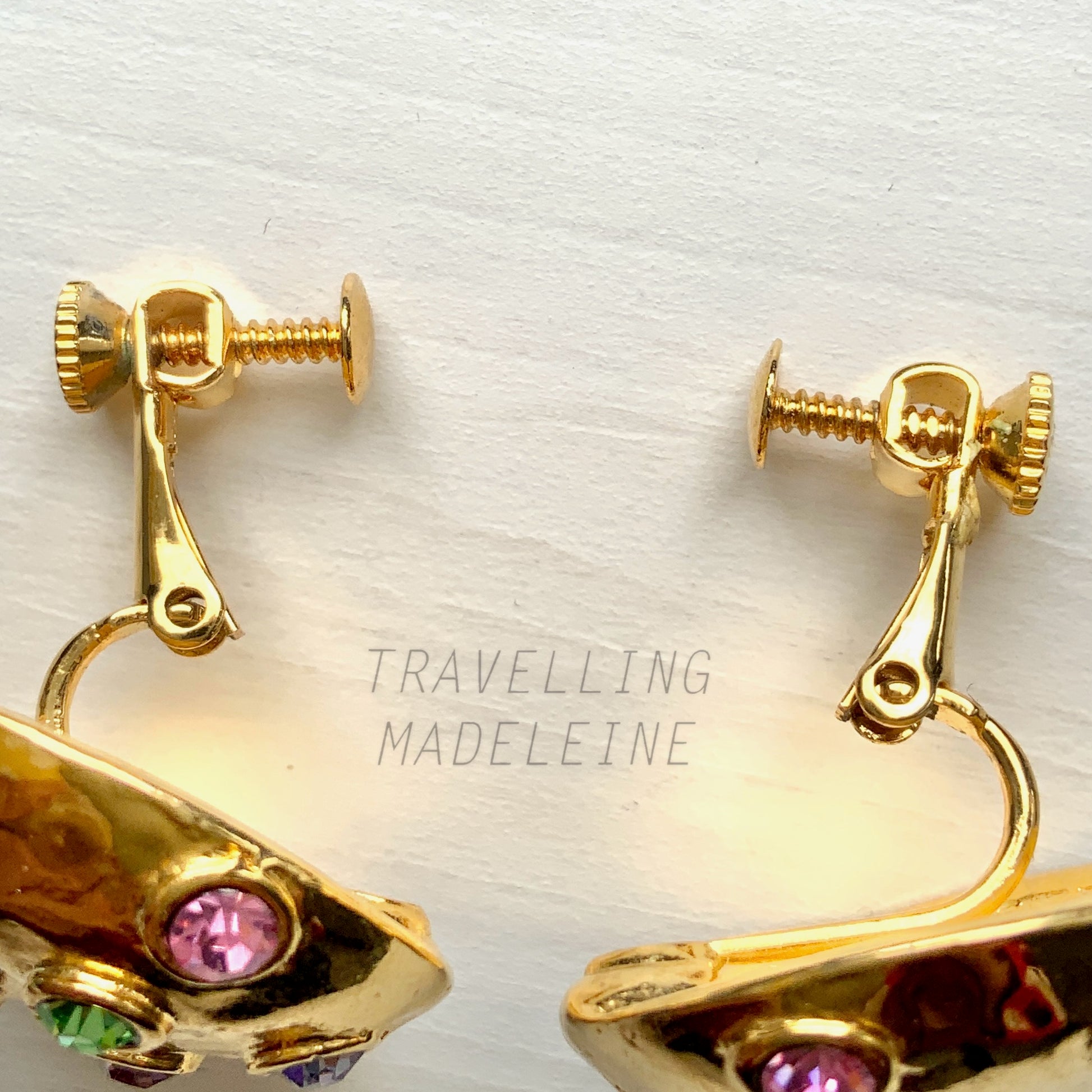 ゴールドトーンのドームにパステルカラーのラインストーンが光るクリップイヤリング。