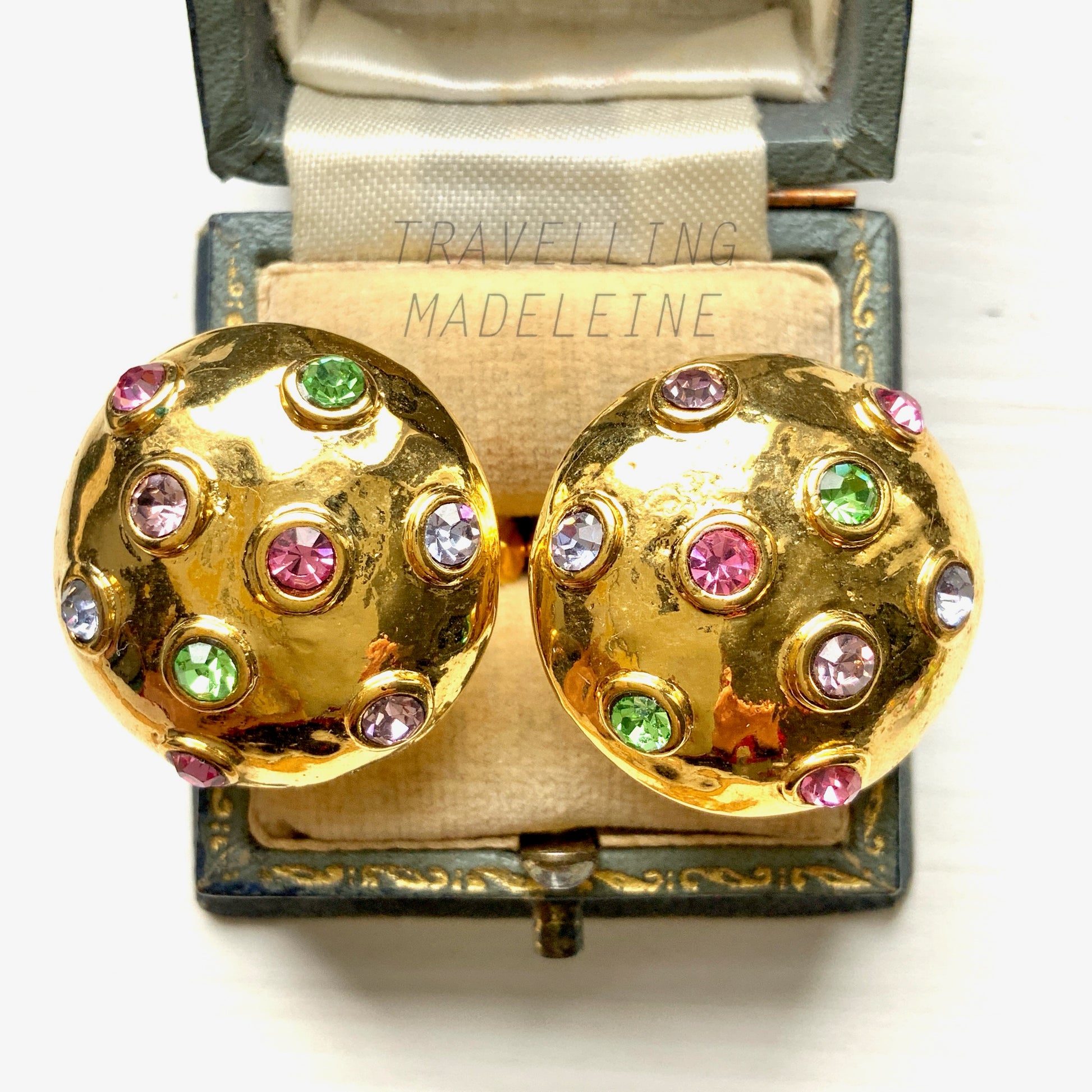 VINTAGE 1960-80's Gold Tone Dome & Multicolour Rhinestone Clip Earrings