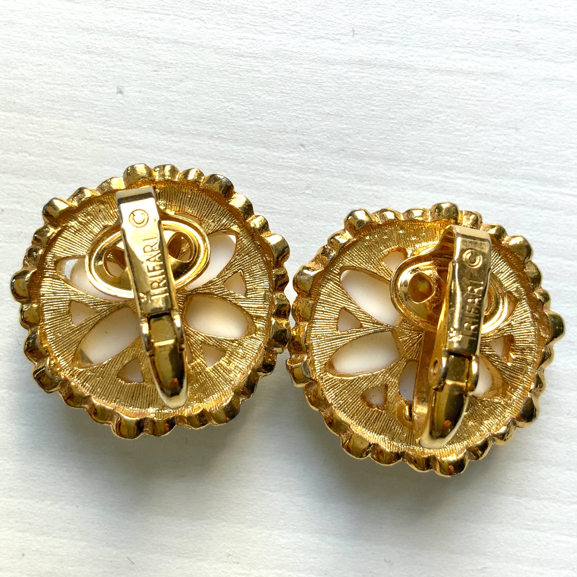 VINTAGE 1960s TRIFARI White Cabochon & Blue Flower Clip-On Earrings