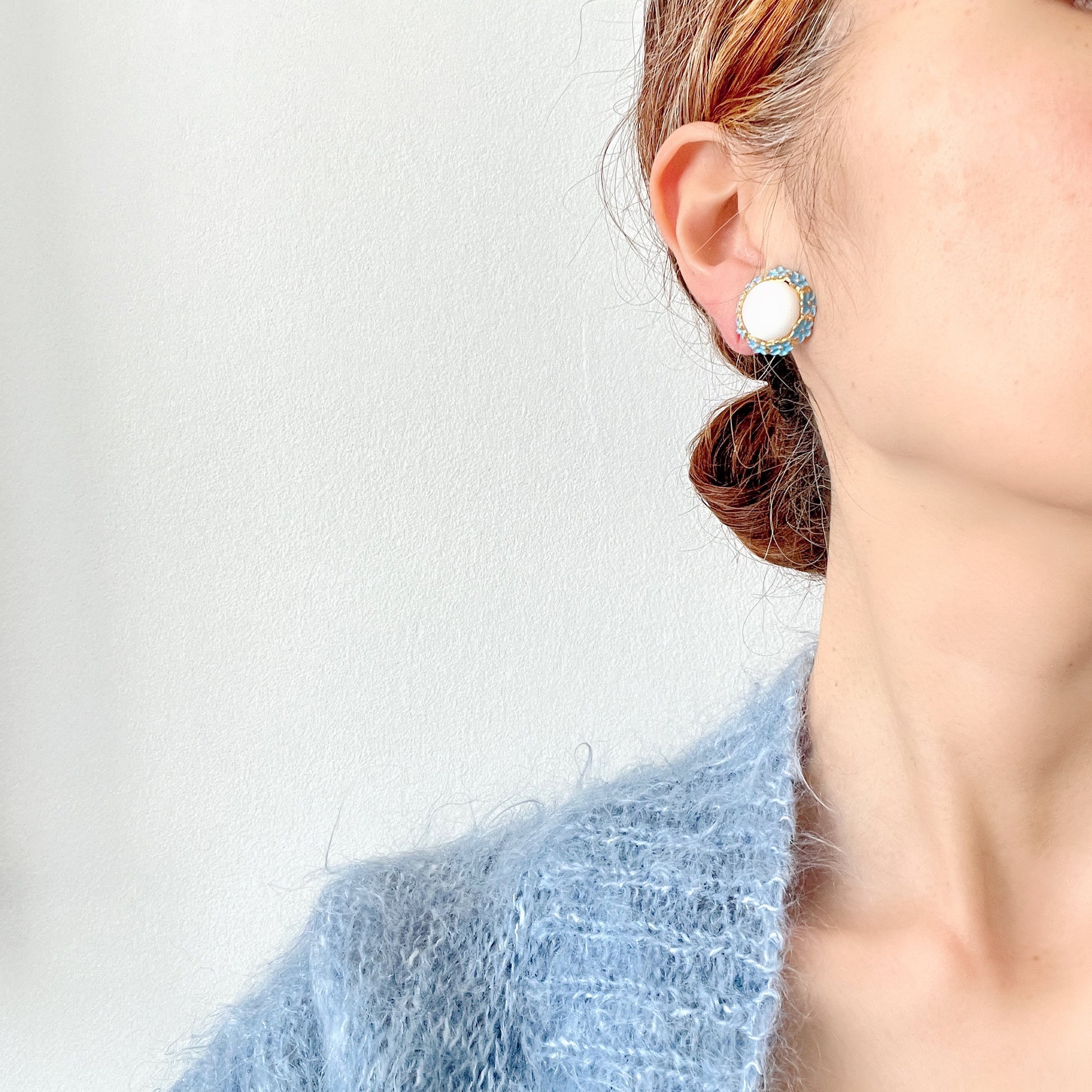 ホワイトのプラスチックカボションを、水色のエナメルフラワーが取り囲んだトリファリのクリップイヤリング。