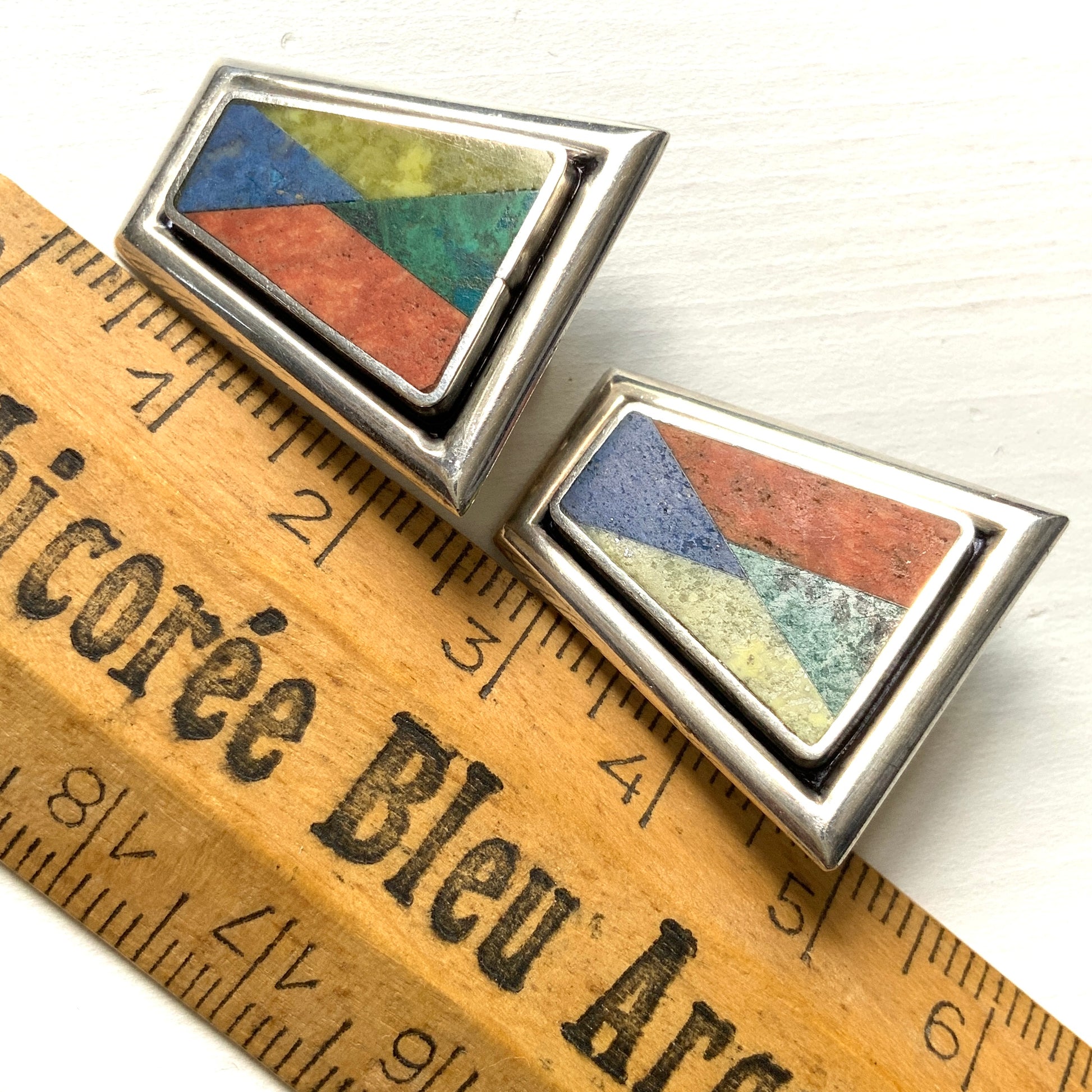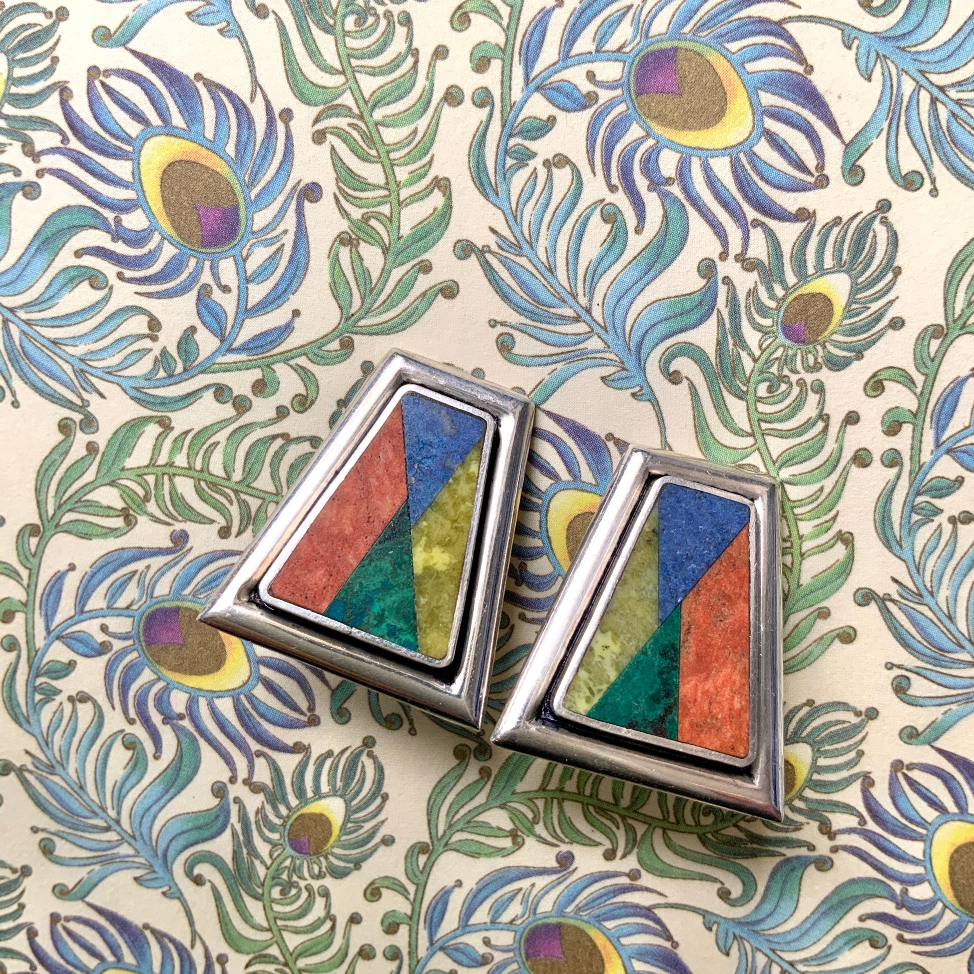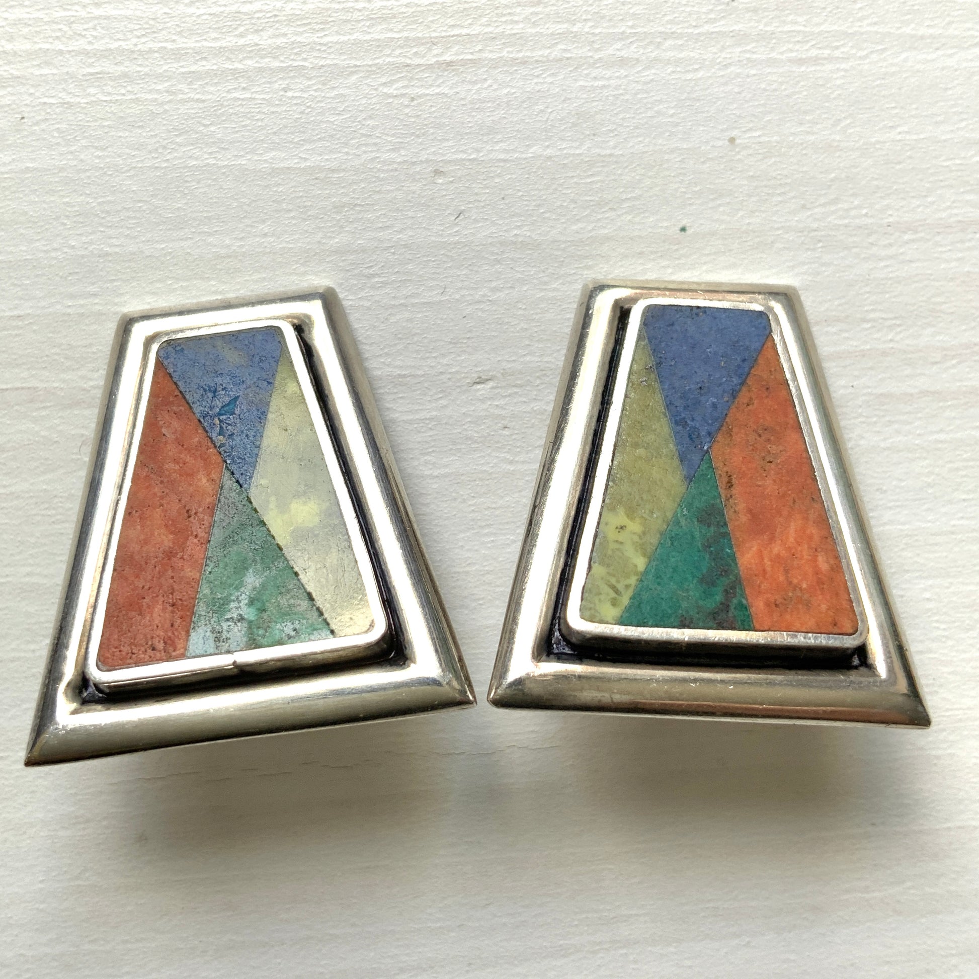 VINTAGE 1970's Multi Coloured Stone Inlay Trapezoid Shaped Silver Clip Earrings