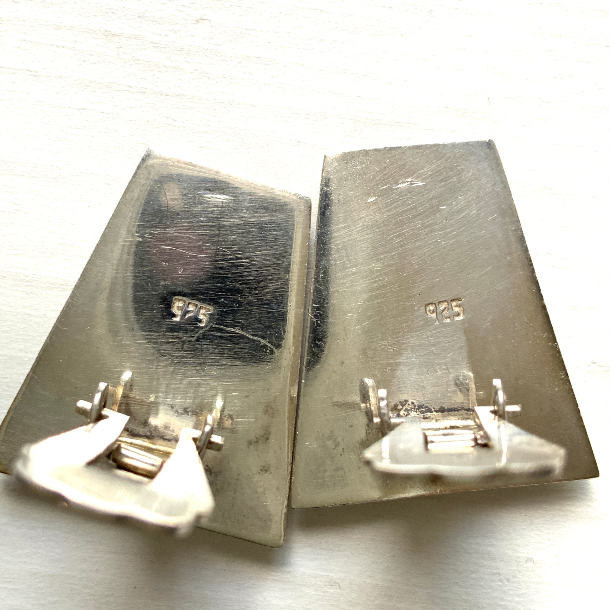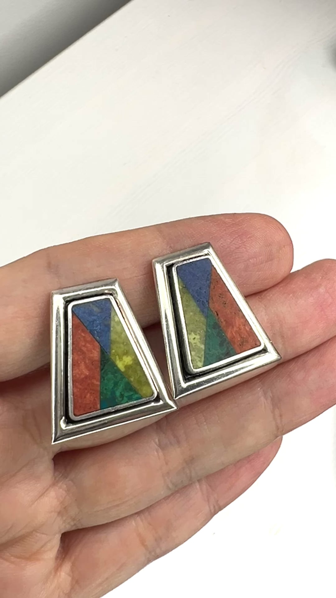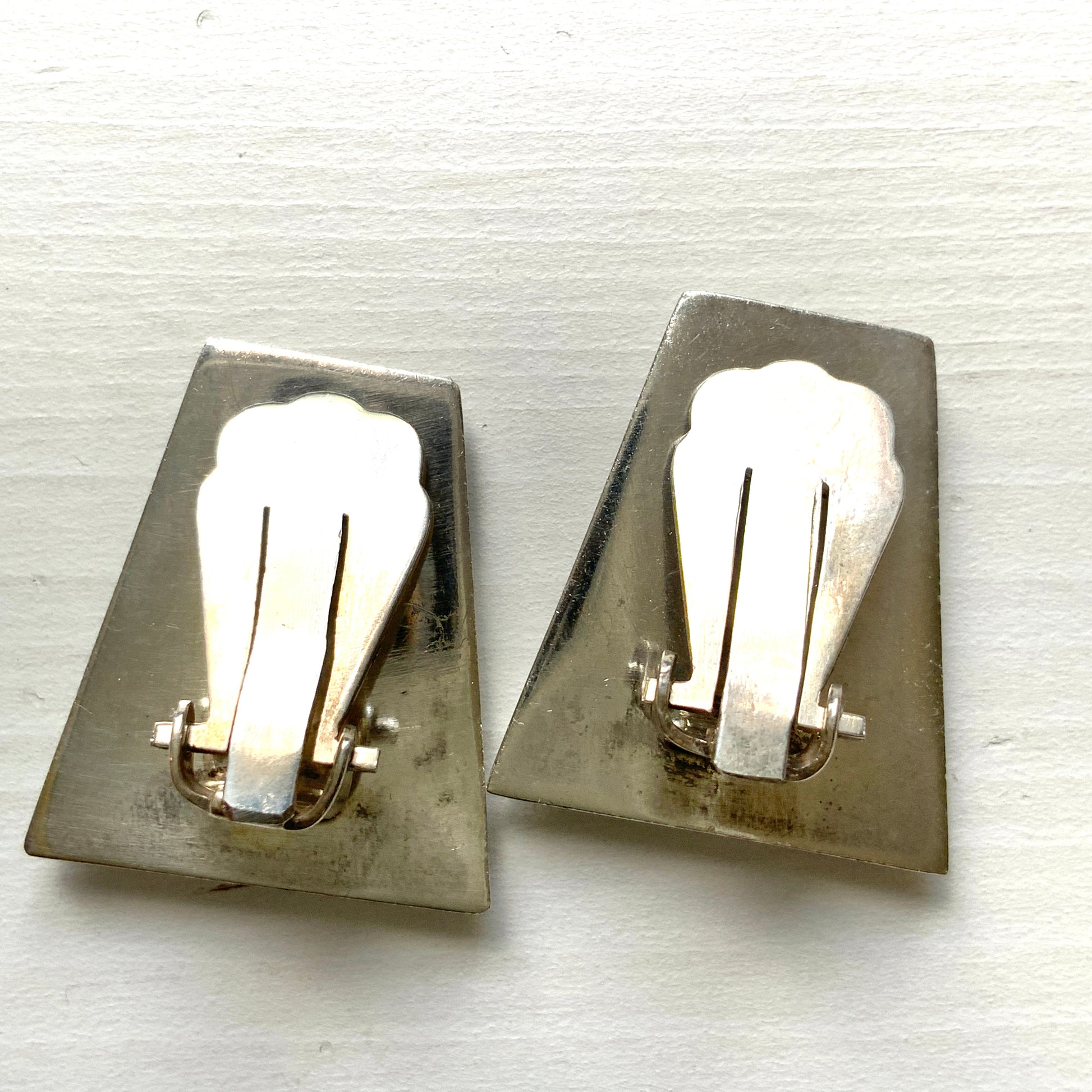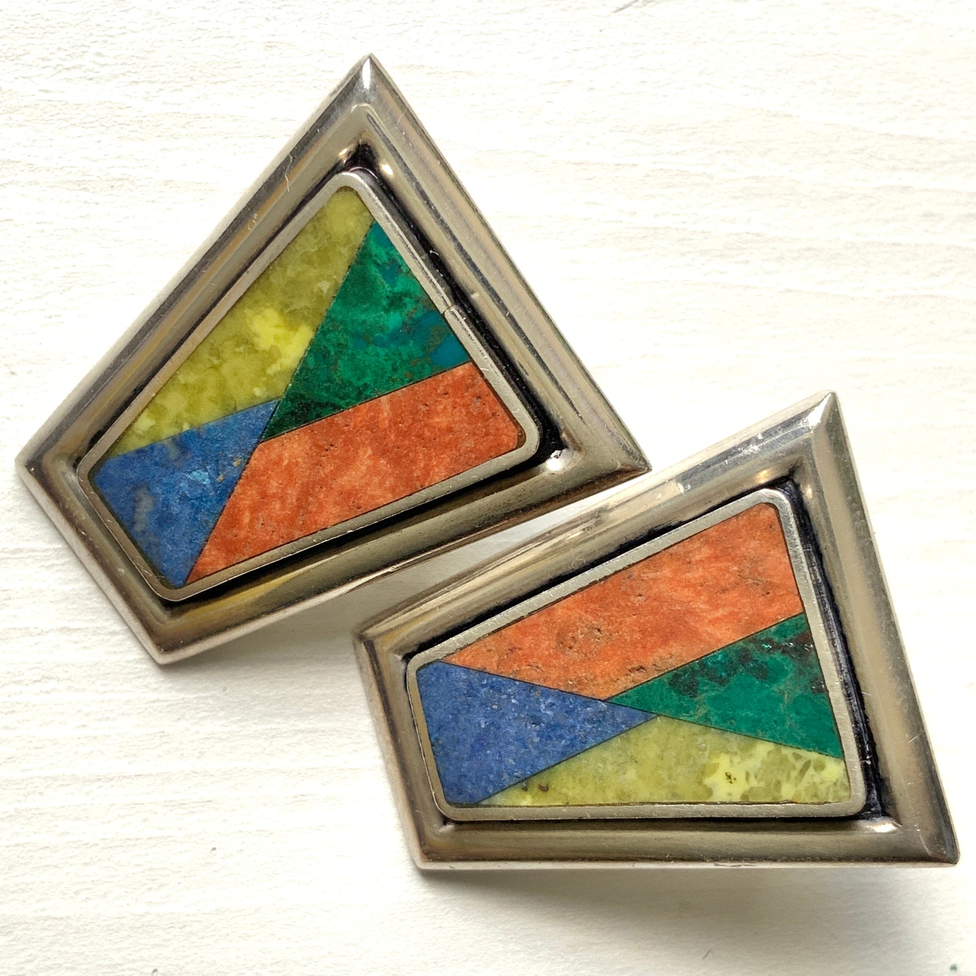 VINTAGE 1970's Multi Coloured Stone Inlay Trapezoid Shaped Silver Clip Earrings
