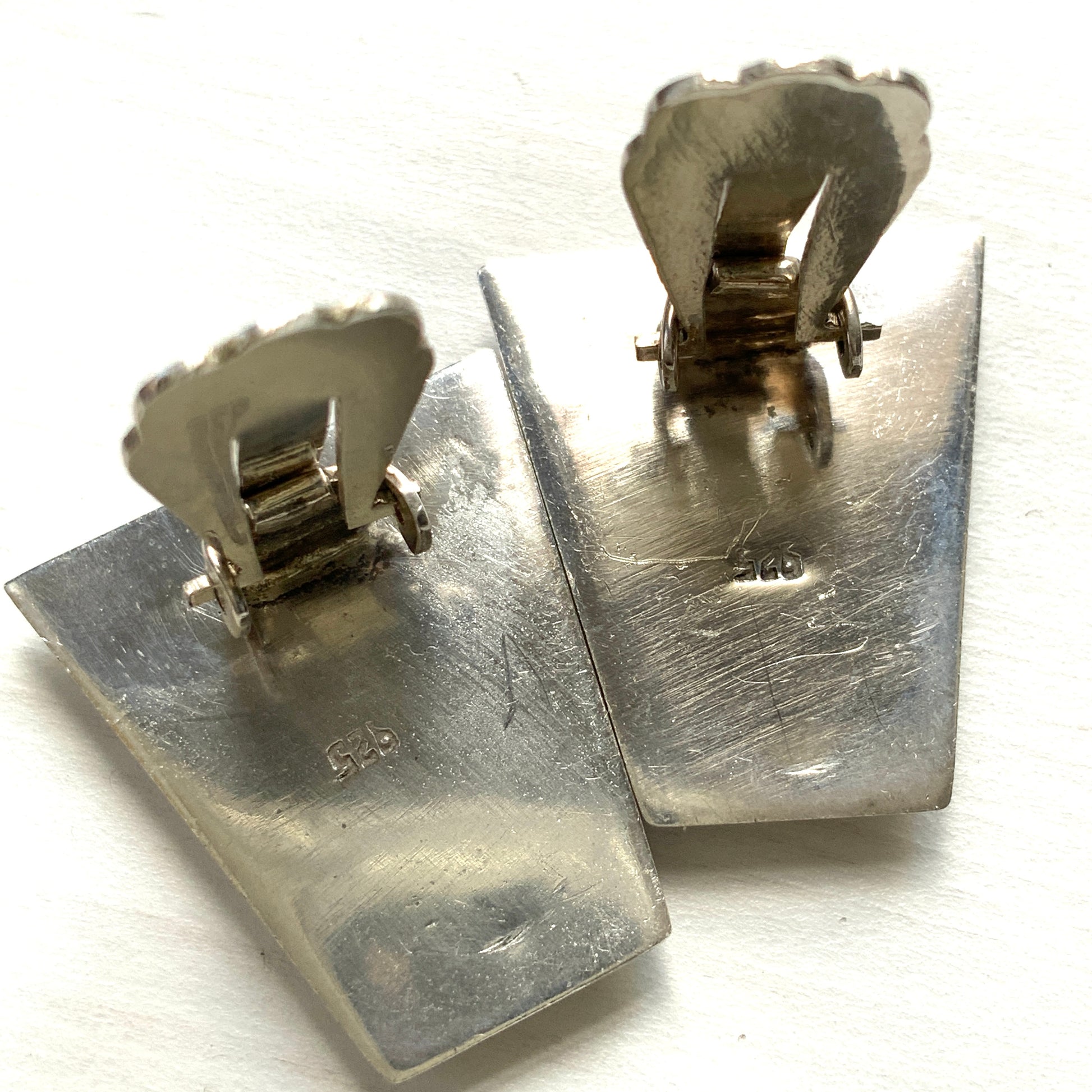 These clip earrings feature colorful stones inlaid into a trapezoidal silver base.