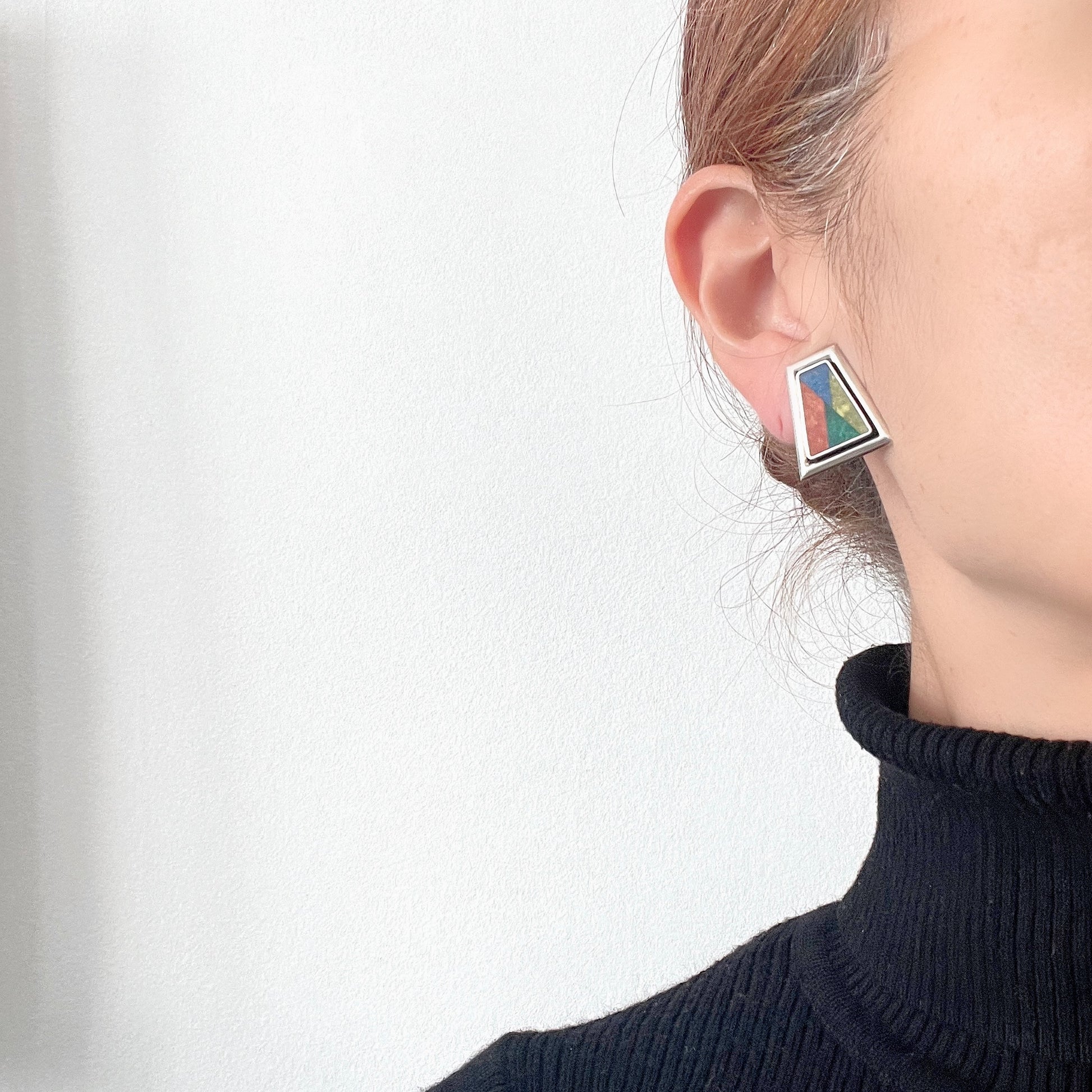 カラフルなストーンが台形のシルバーベースに象嵌細工されているクリップイヤリンング。