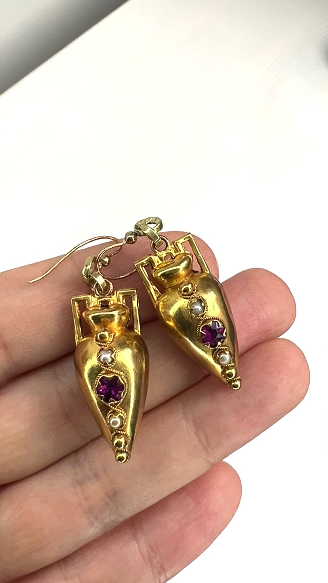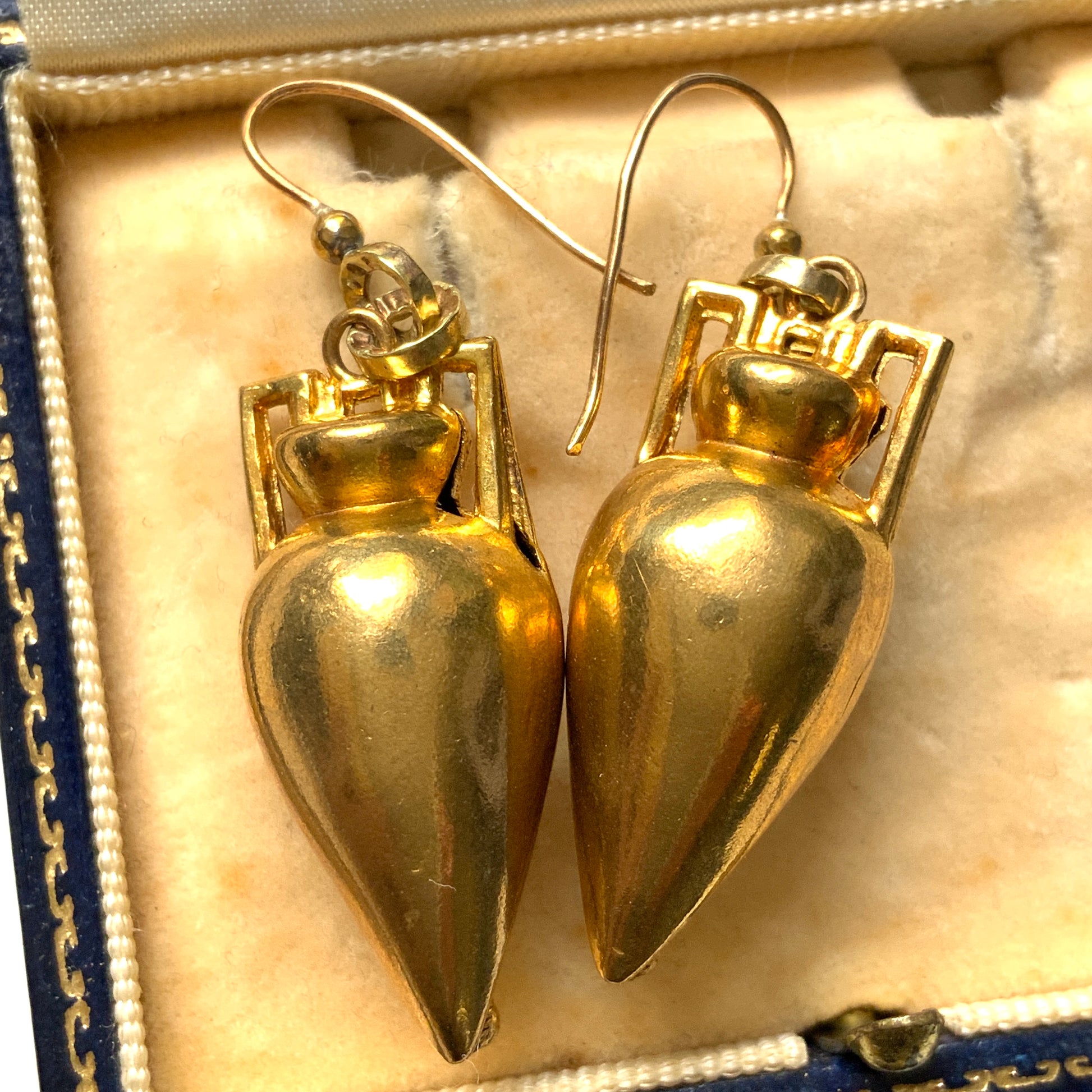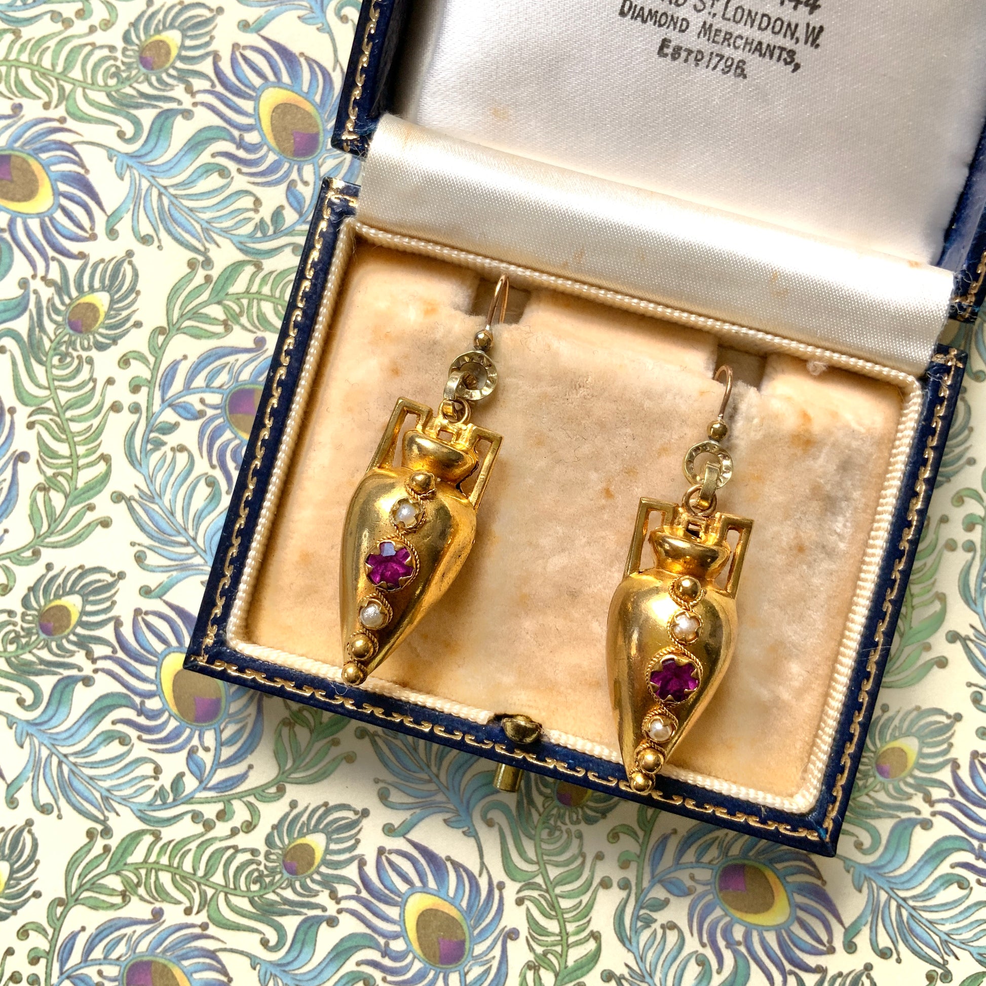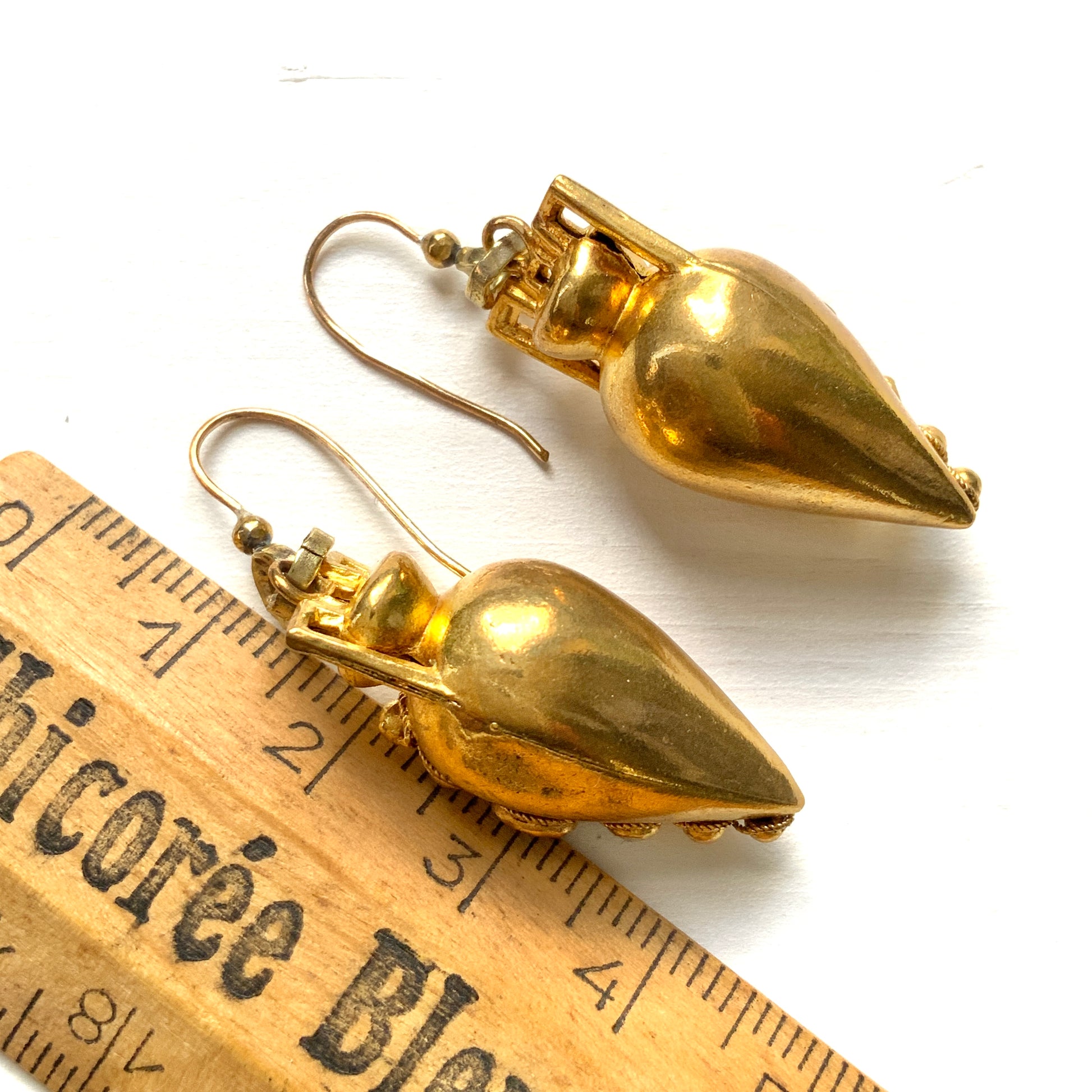 These earrings are part of the Etruscan Revival style that was popular during the Victorian era.