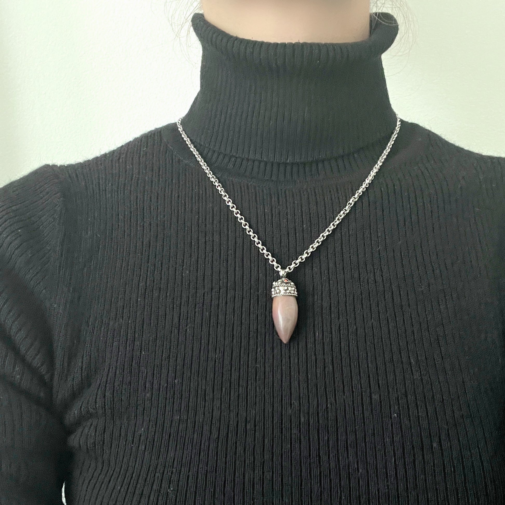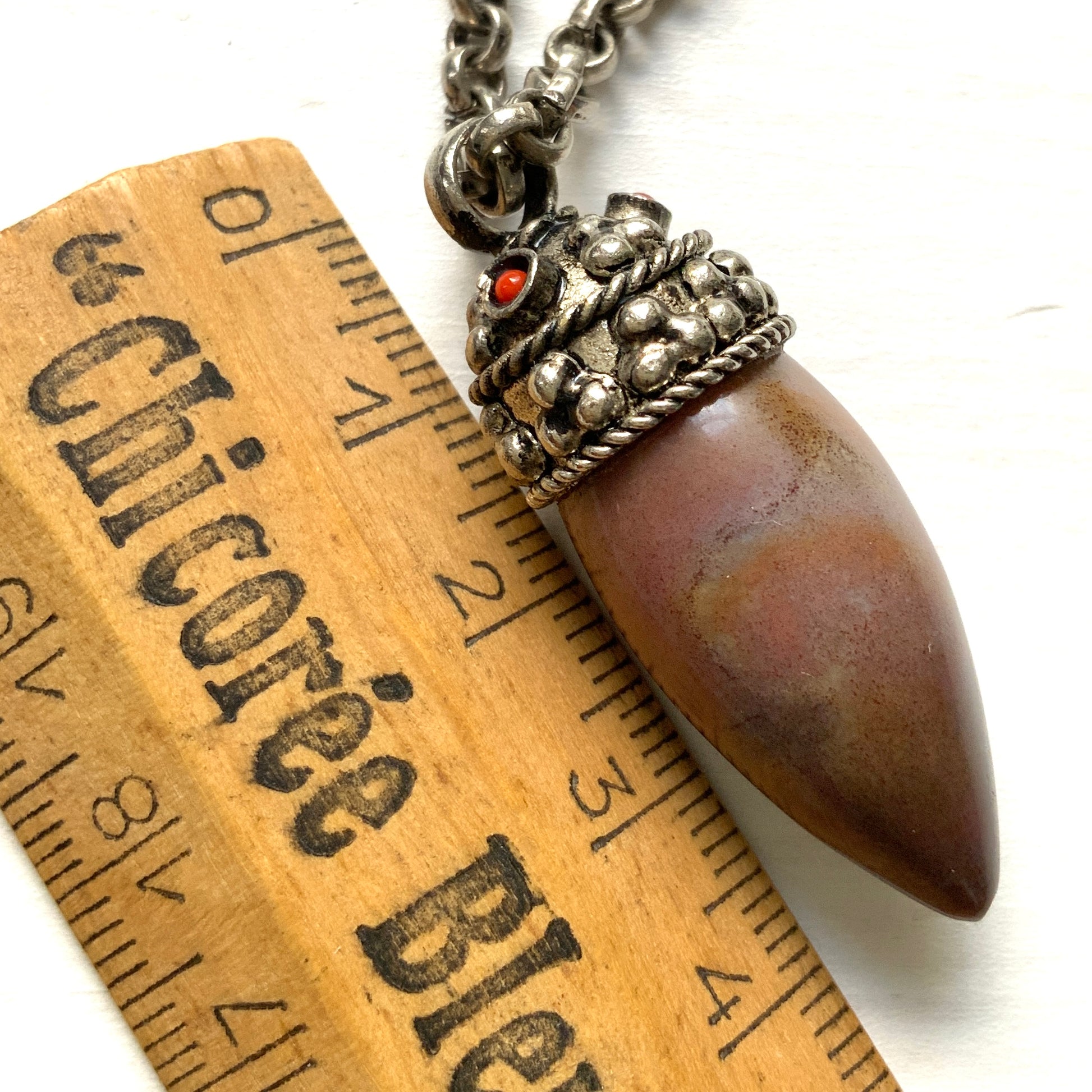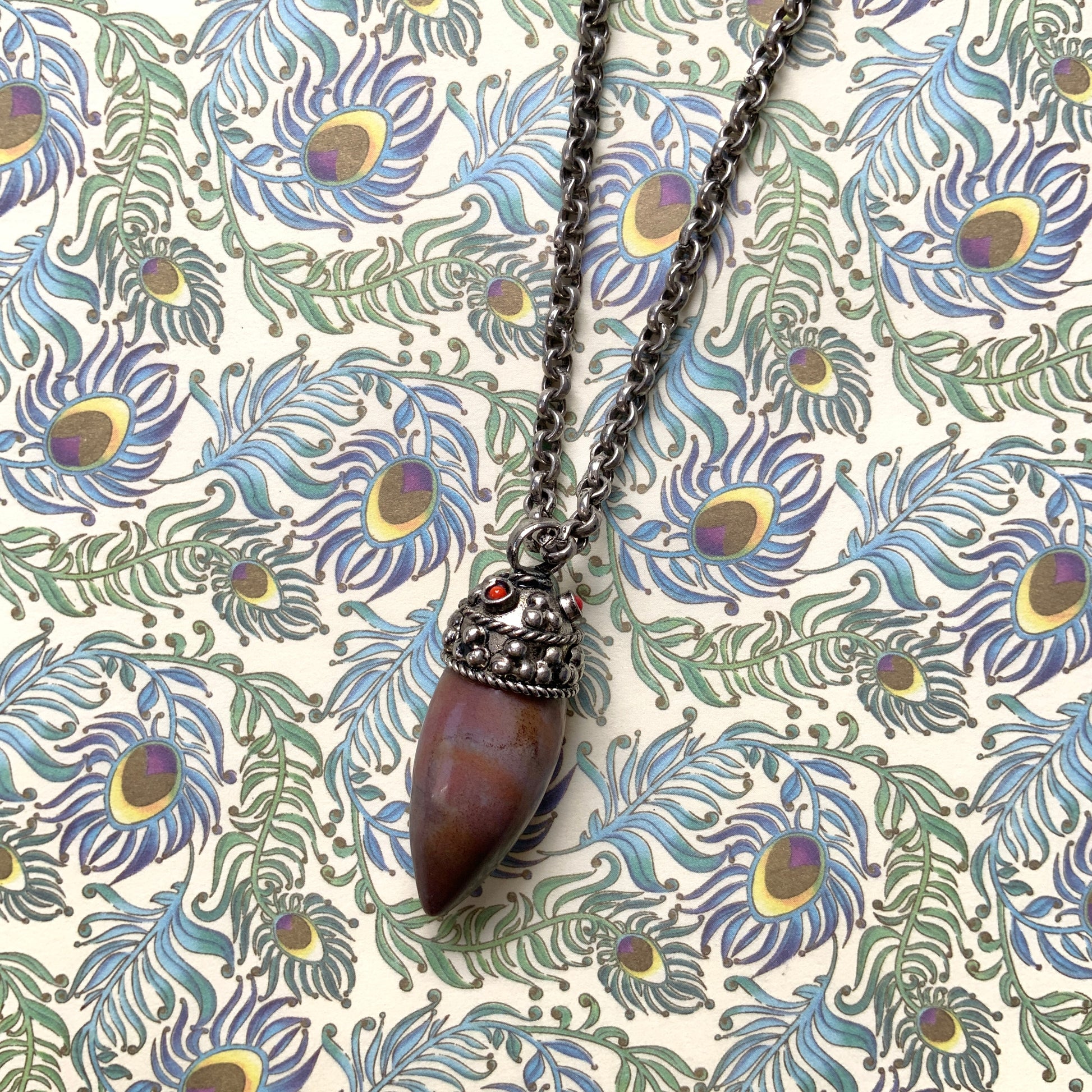 A spiky-shaped, subtly patterned brown stone pendant necklace.