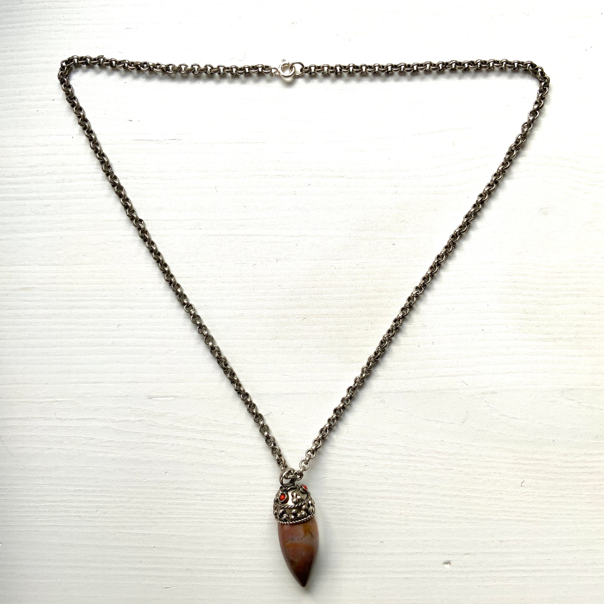スパイキーなシェイプの微かに模様の入った茶色の石のペンダントネックレス。
