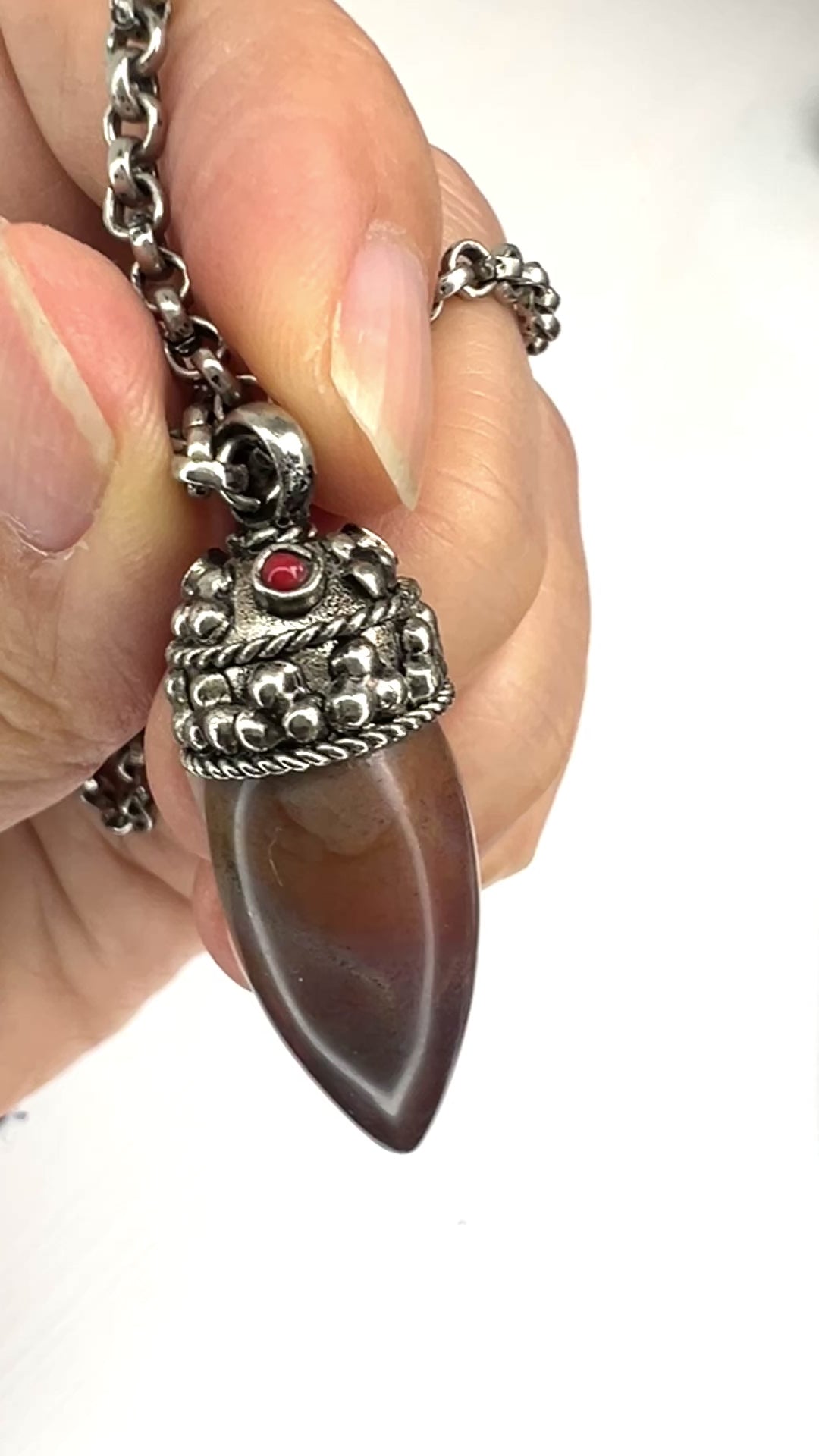 ヘッド部分にはインドやアジアンにも見えるシルバートーンの飾りがついており、赤い石がアクセントについています。