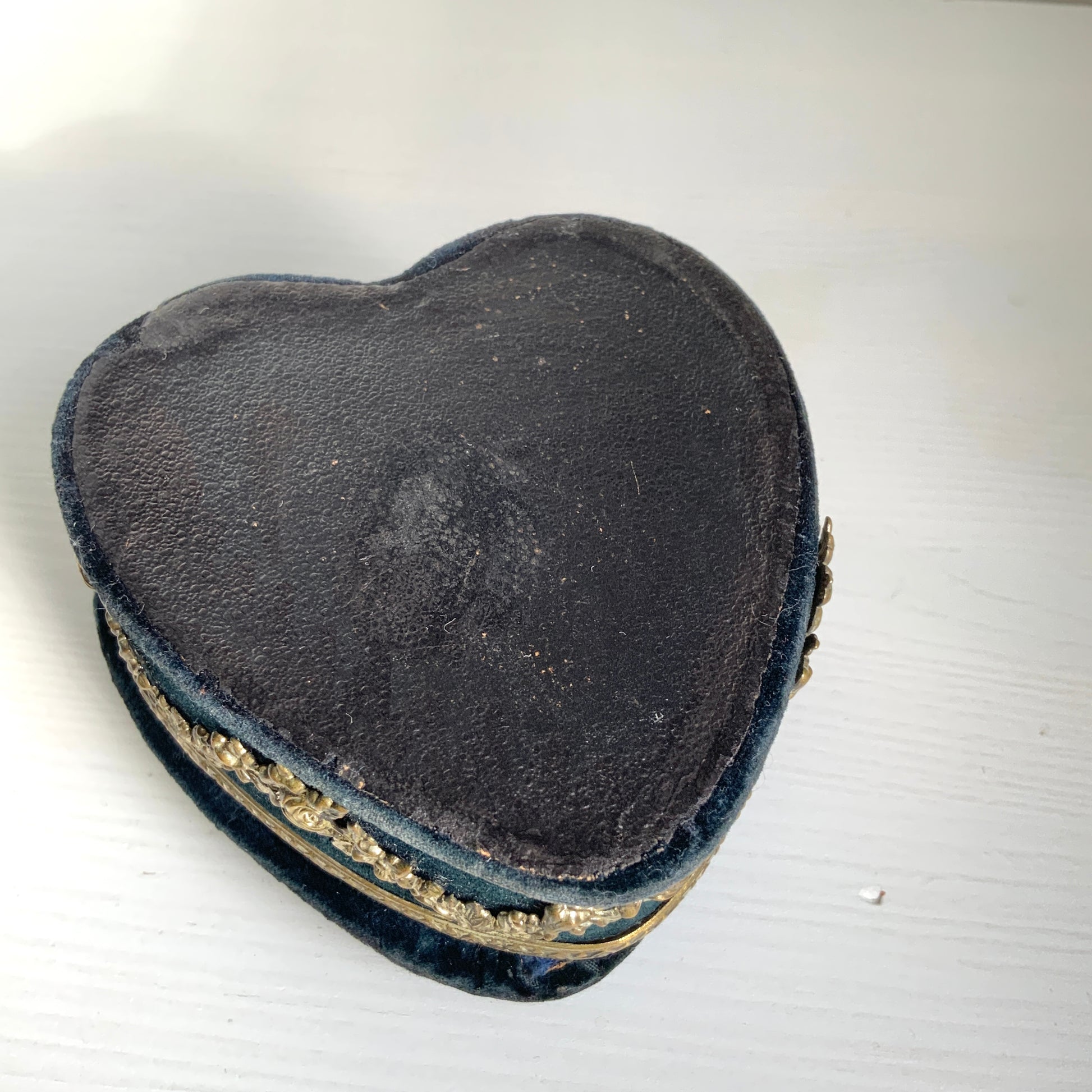 The velvet shows areas where the fabric has thinned slightly due to age. There is discolouration to the metal decoration, and one of the decorative elements sits slightly raised from the box. The satin lining on the inner lid shows signs of wear consistent with age. Otherwise, the box remains in very good condition.