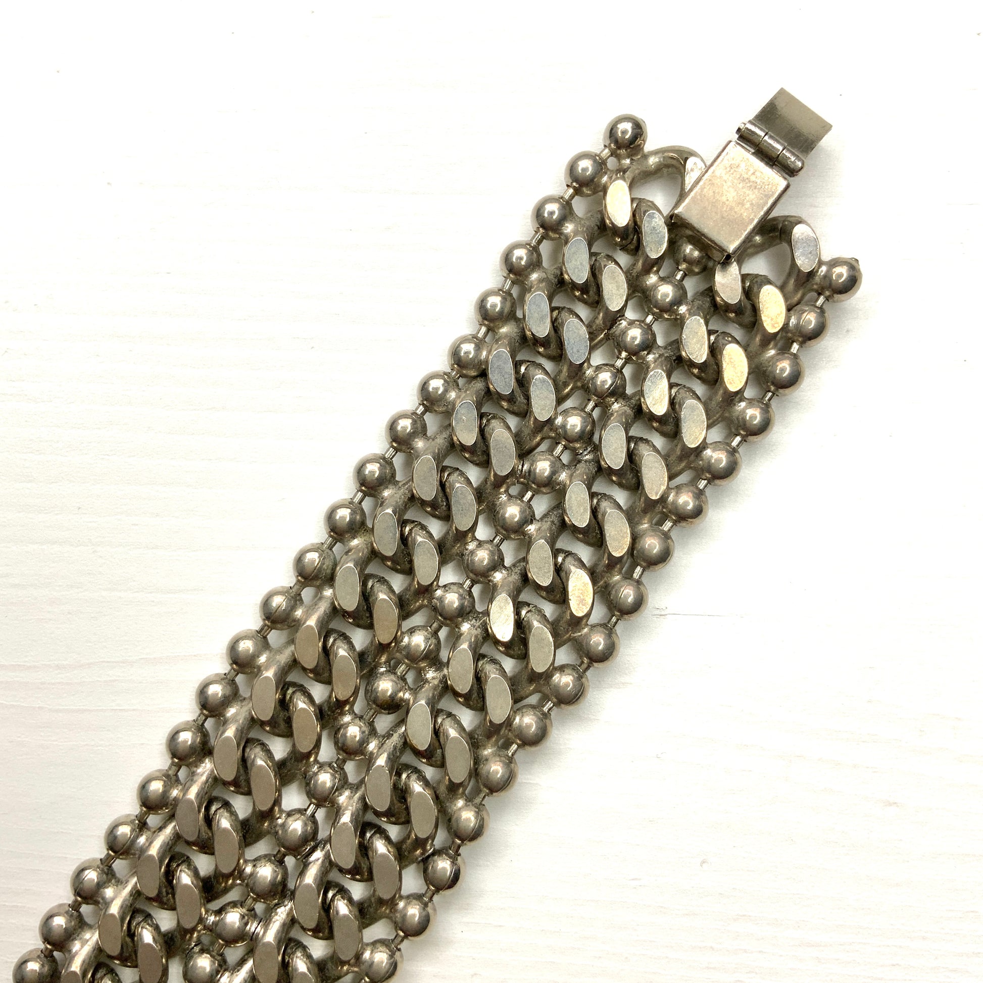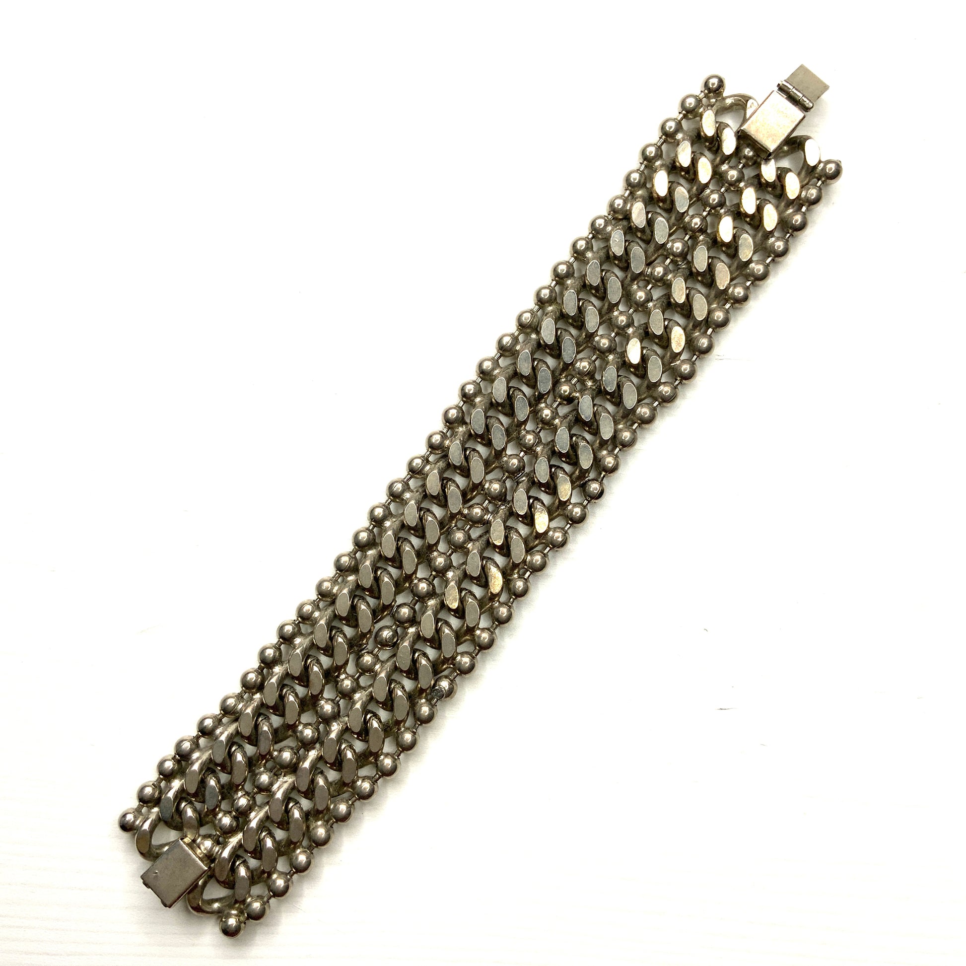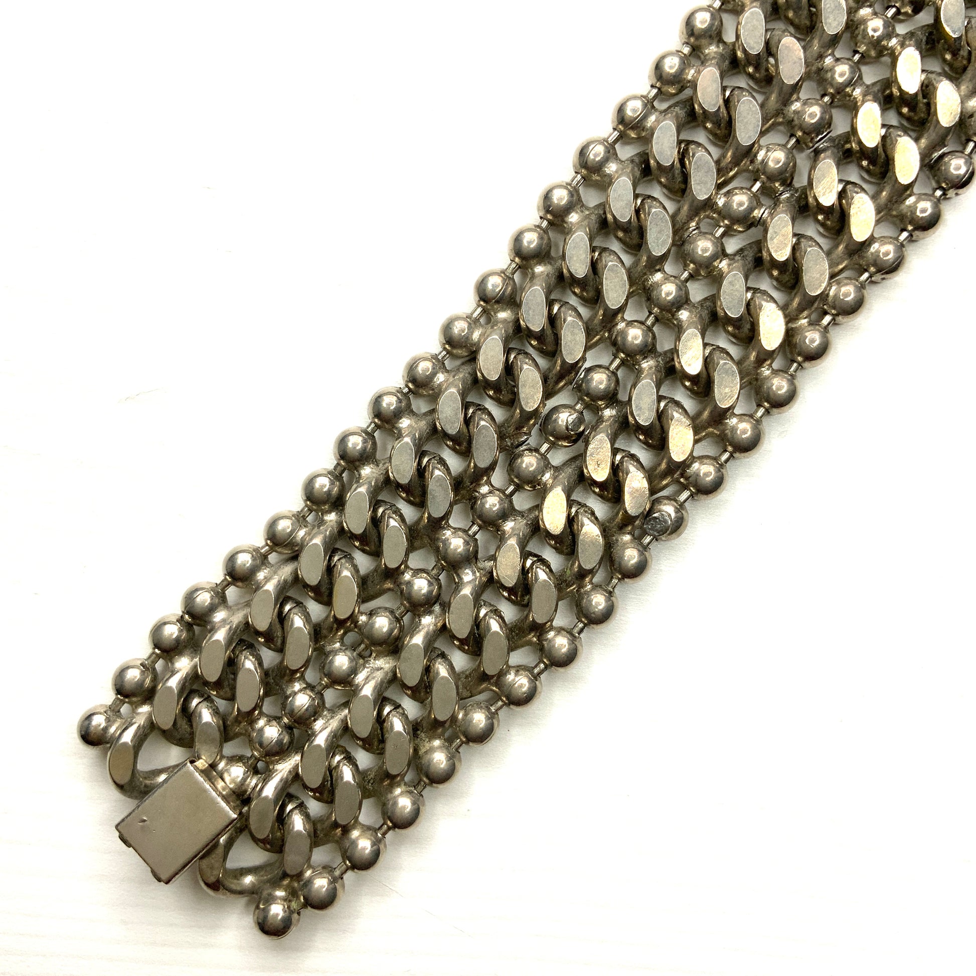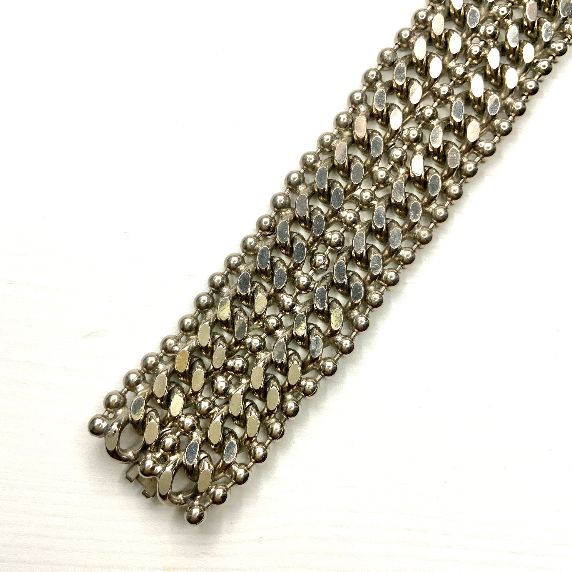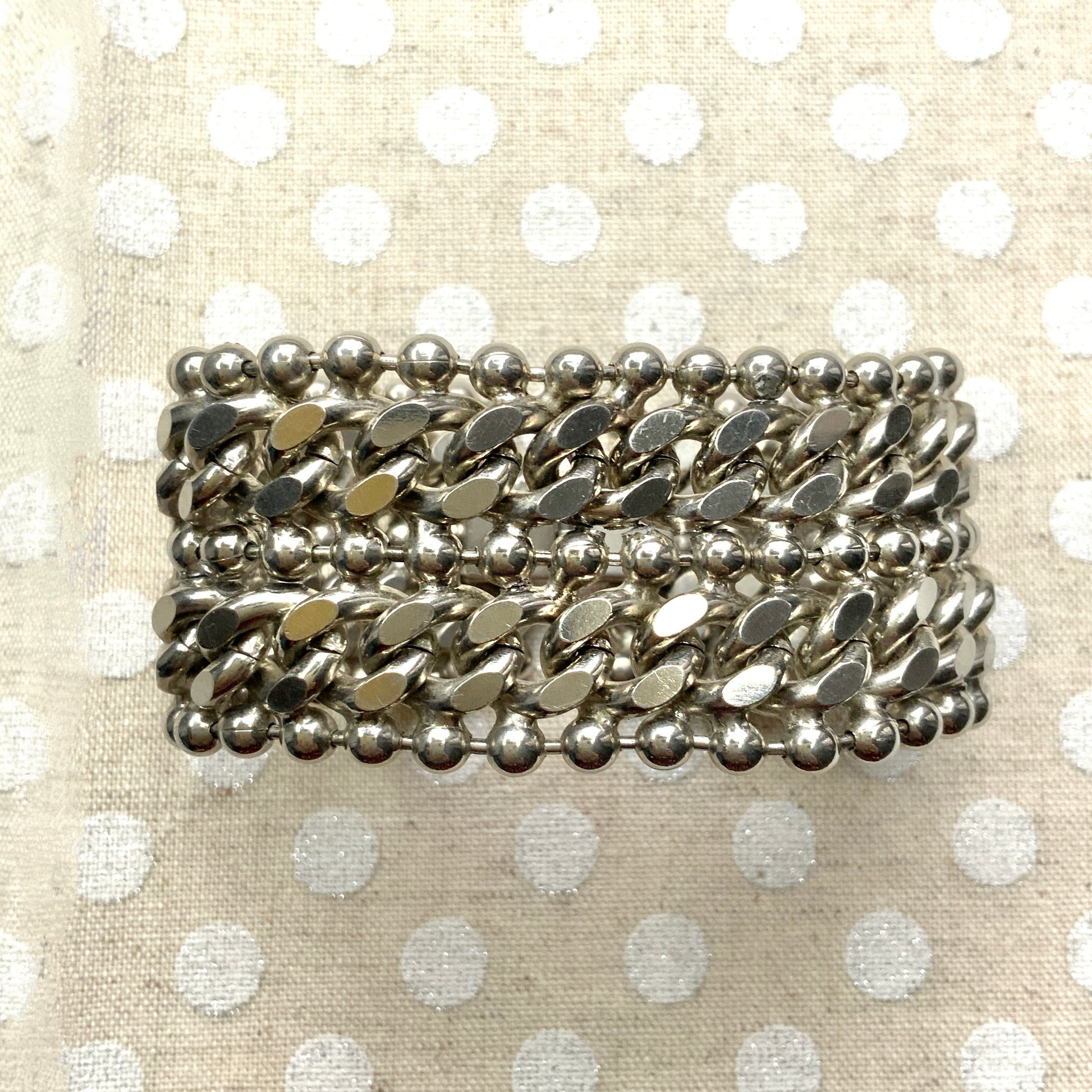 シルバートーンのチェーンを編み込んだ、重厚感のあるブレスレット。