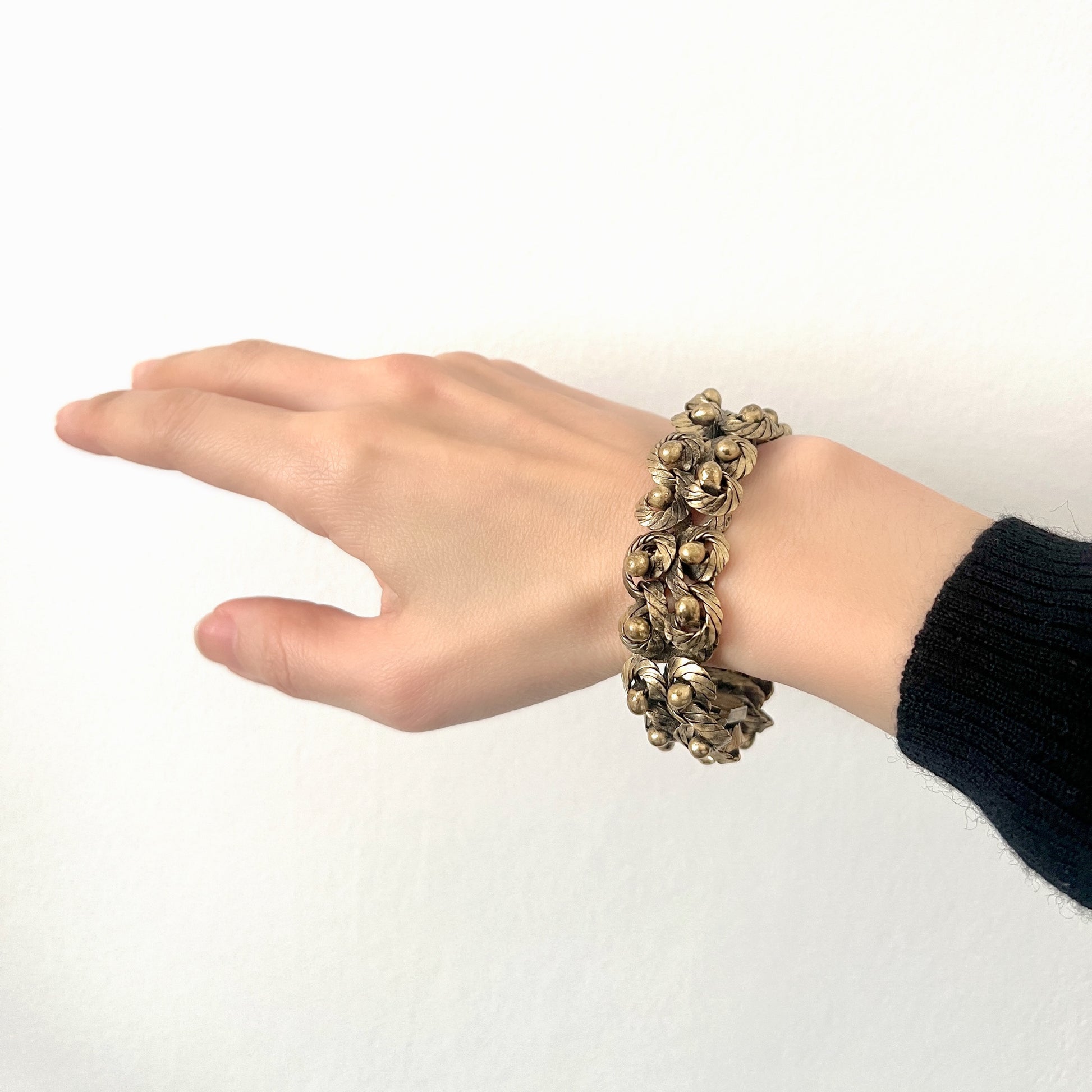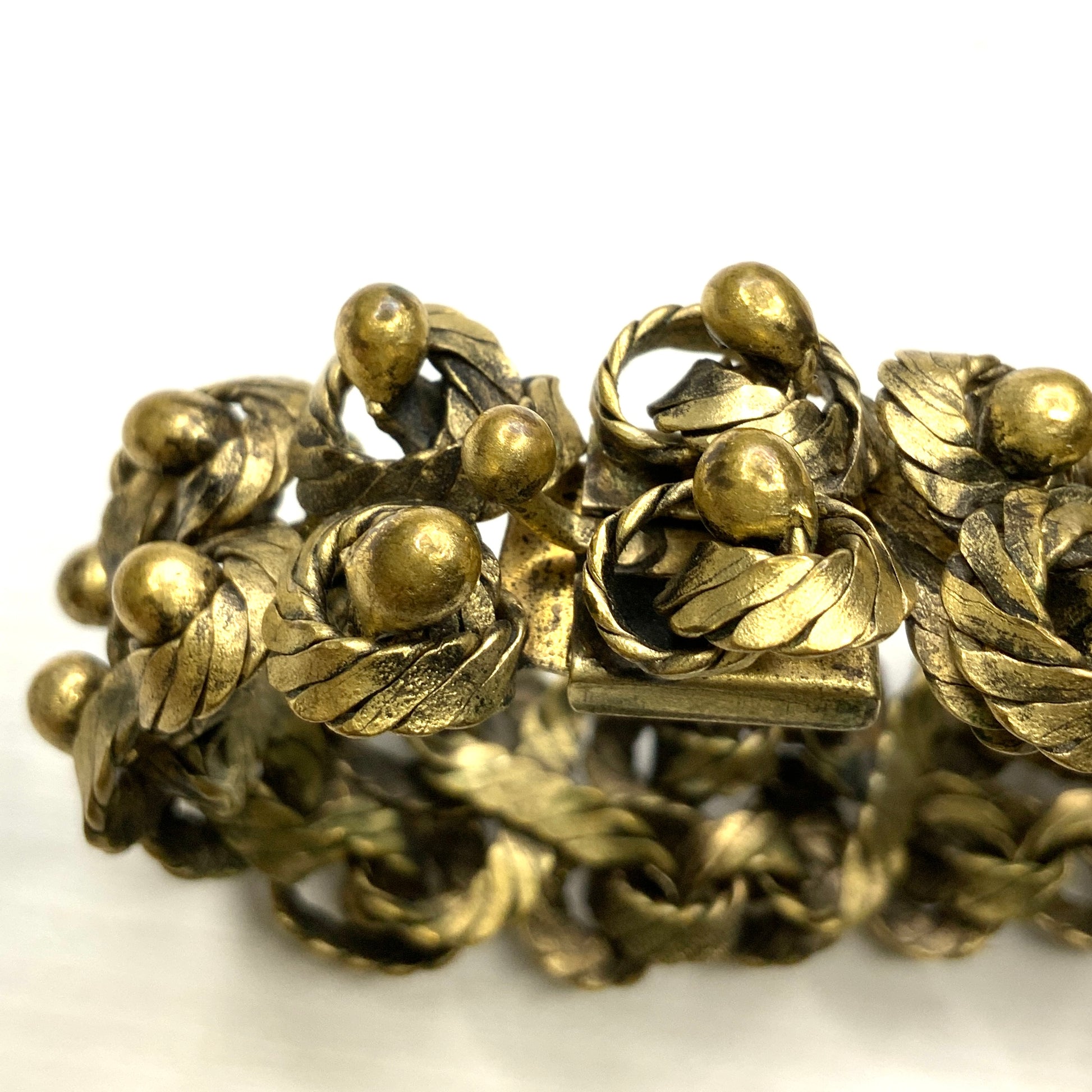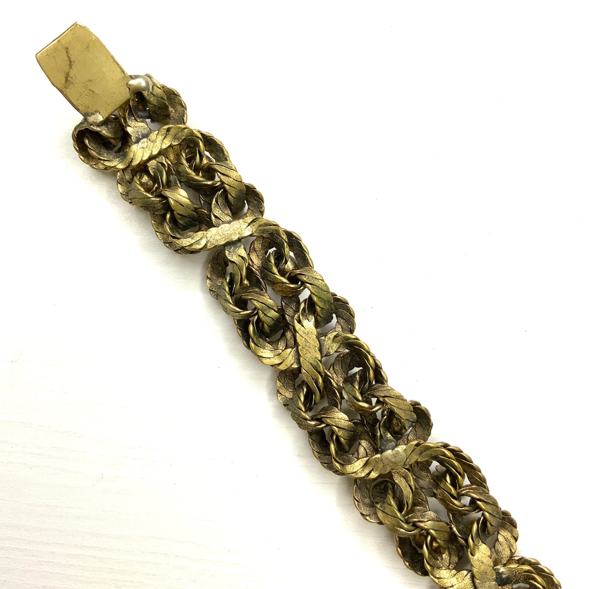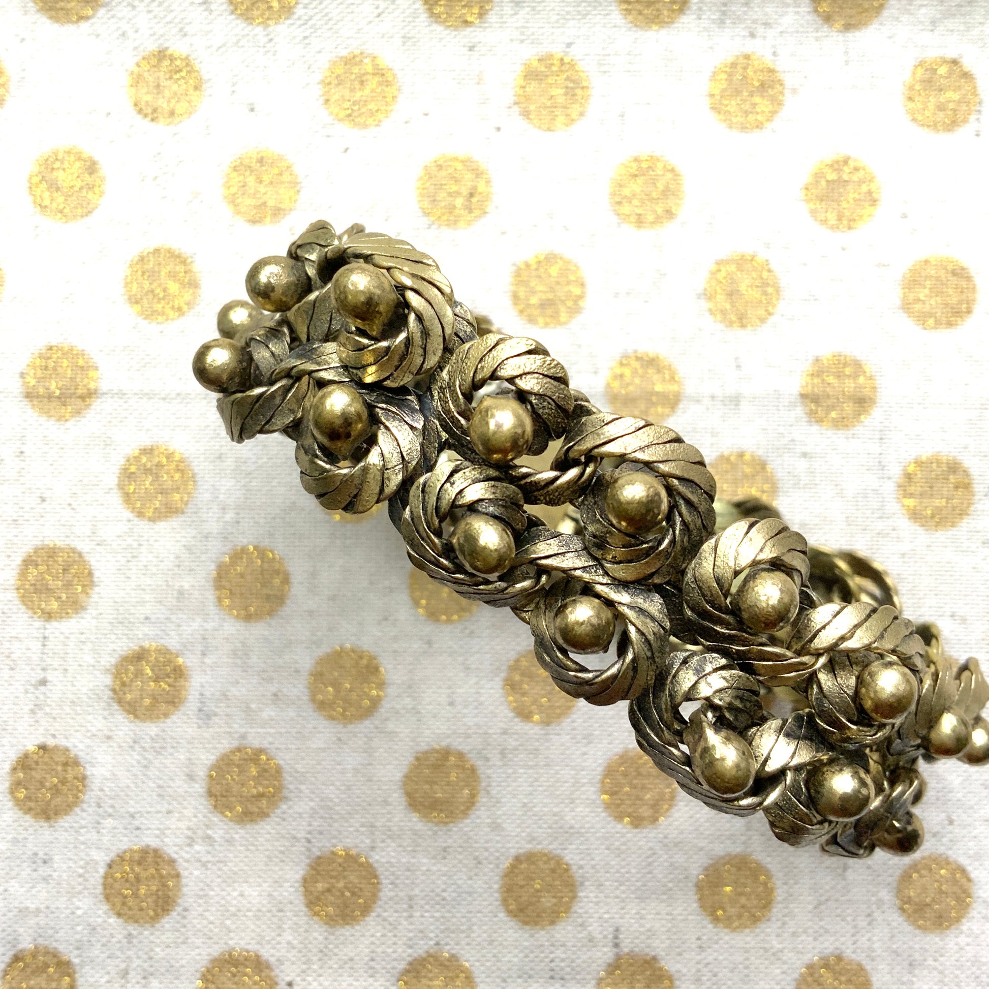 ねじれ模様が刻まれたゴールドトーンメタルが巻きついたユニークなデザインのブレスレット。