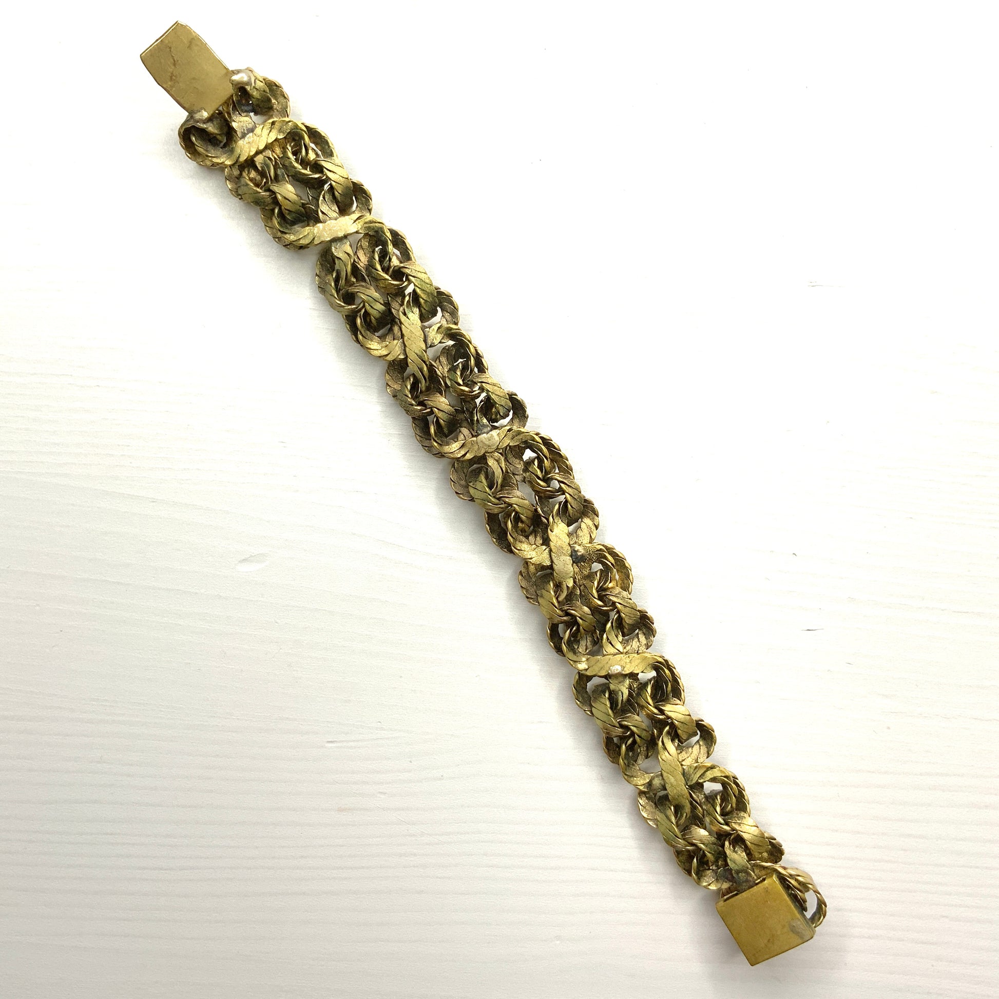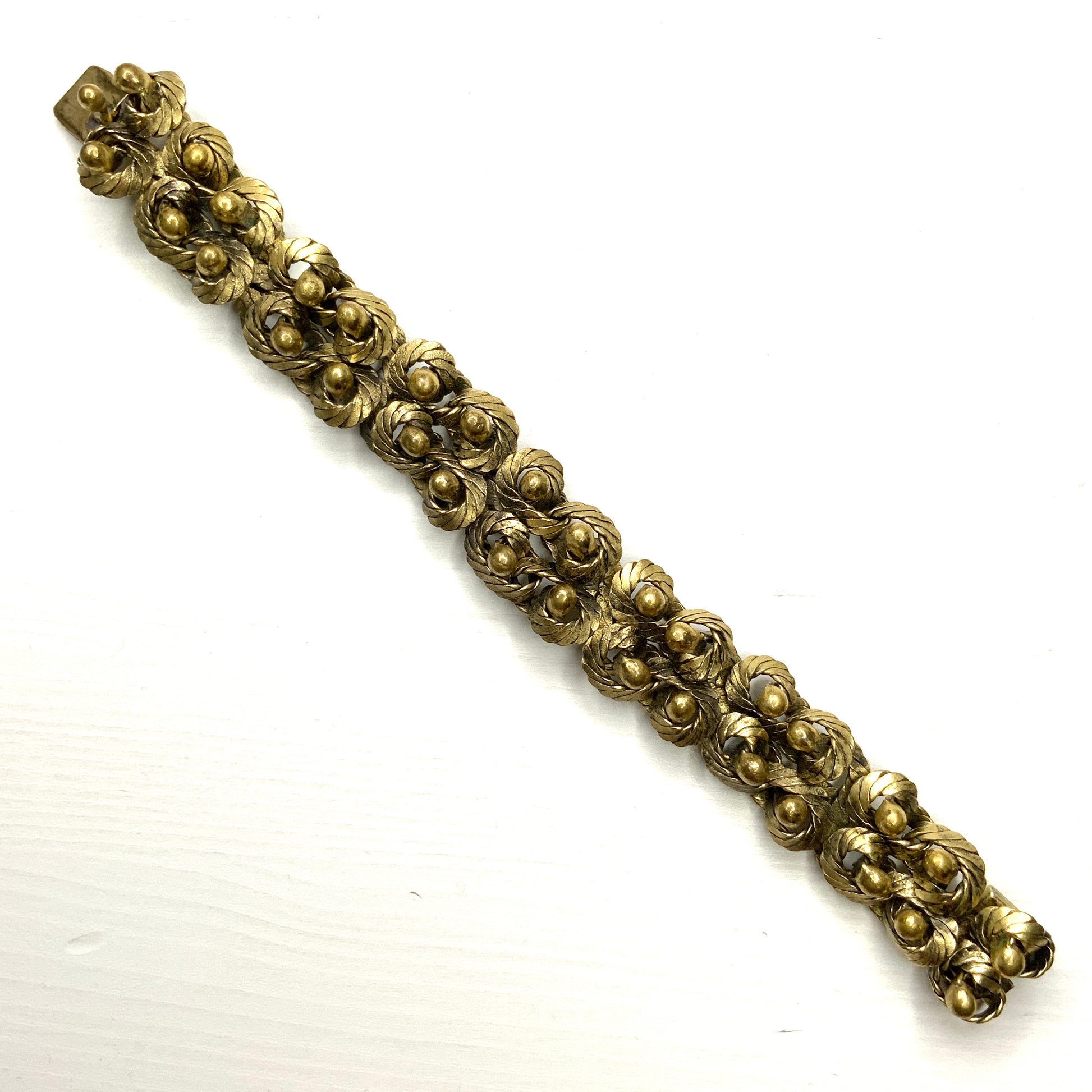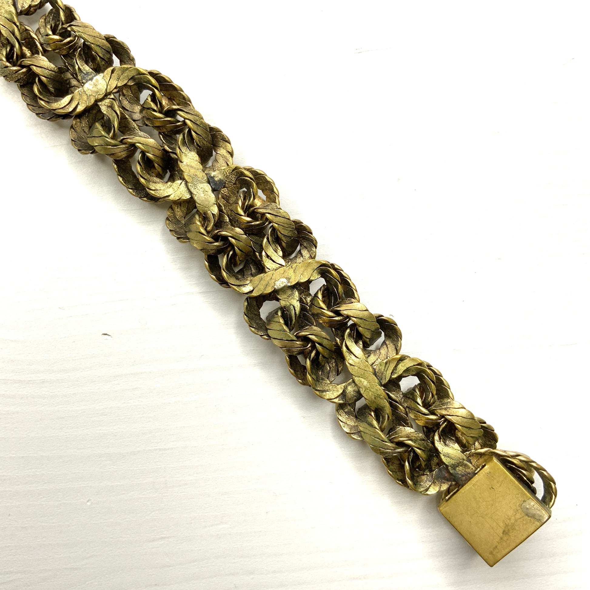 ねじれ模様が刻まれたゴールドトーンメタルが巻きついたユニークなデザインのブレスレット。
