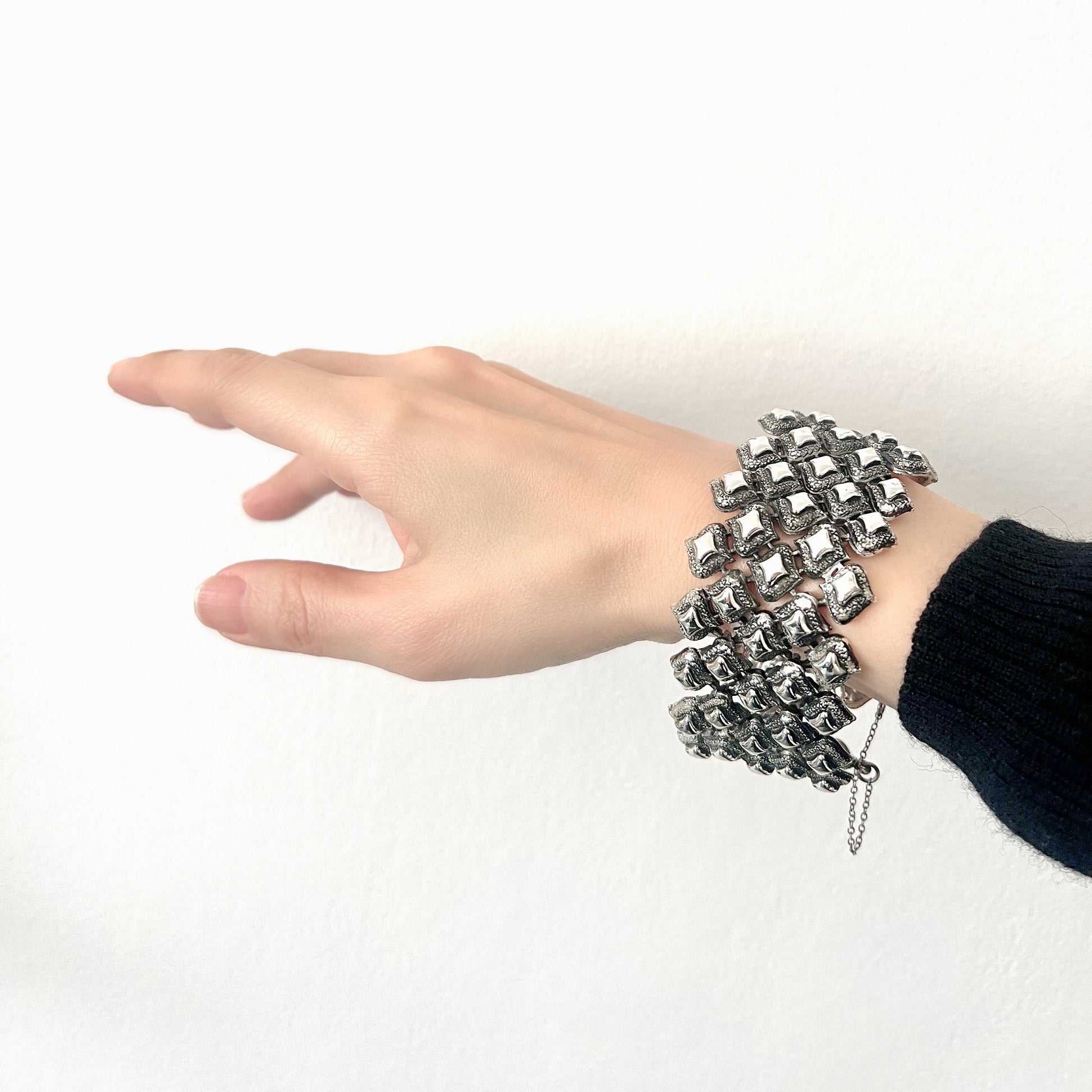 ダイヤ型のパーツがメッシュのように連なったワイドブレスレット。