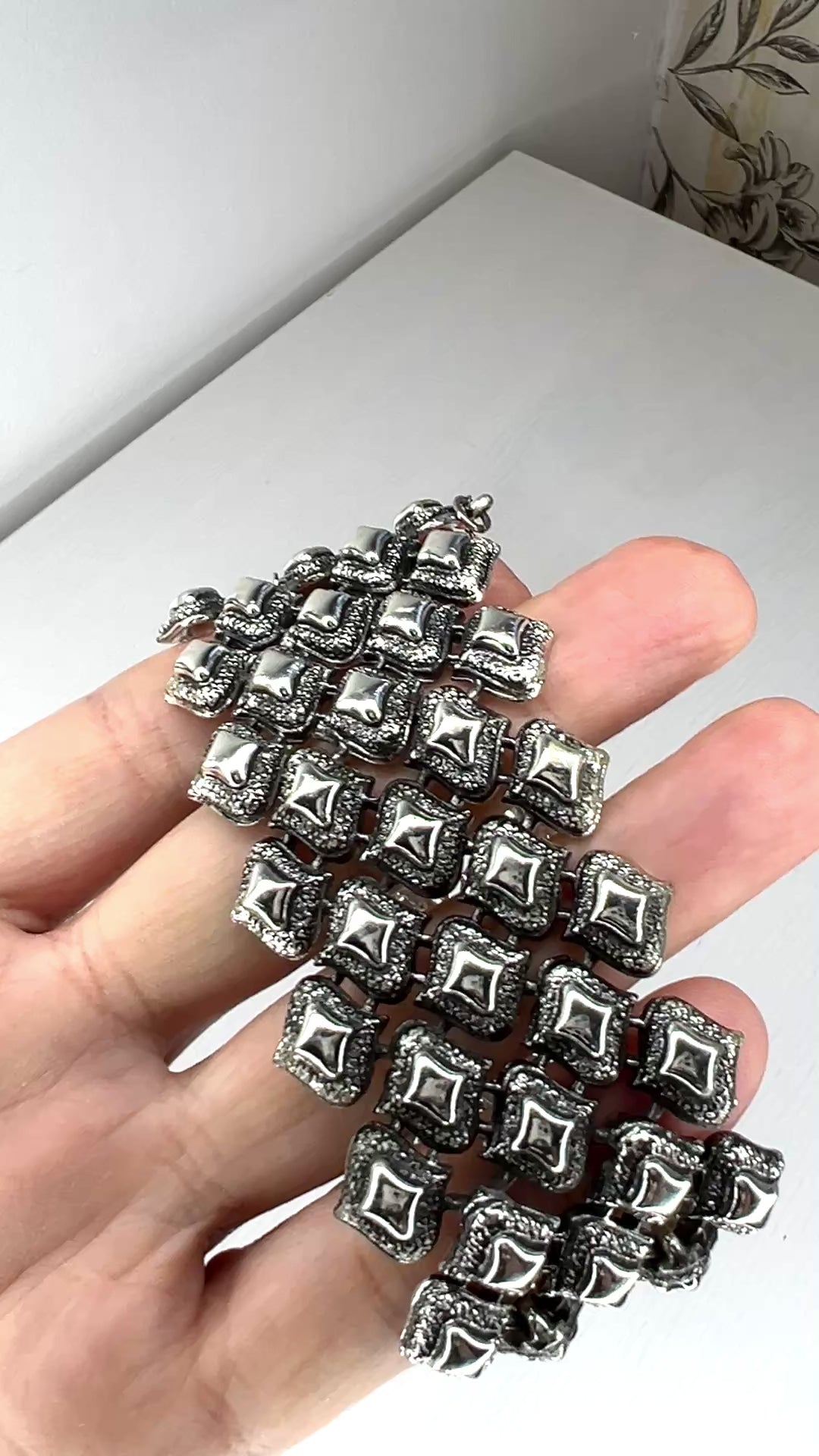 A wide bracelet with diamond-shaped parts linked together like a mesh.