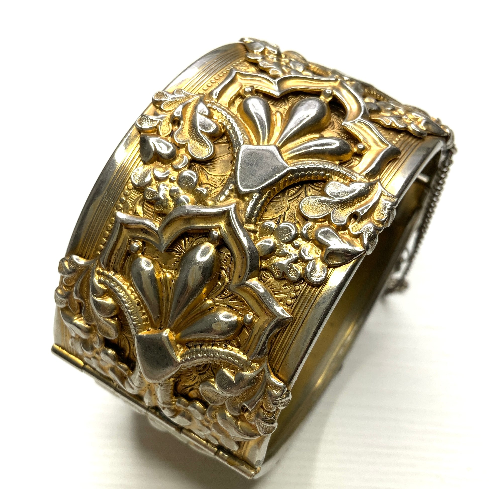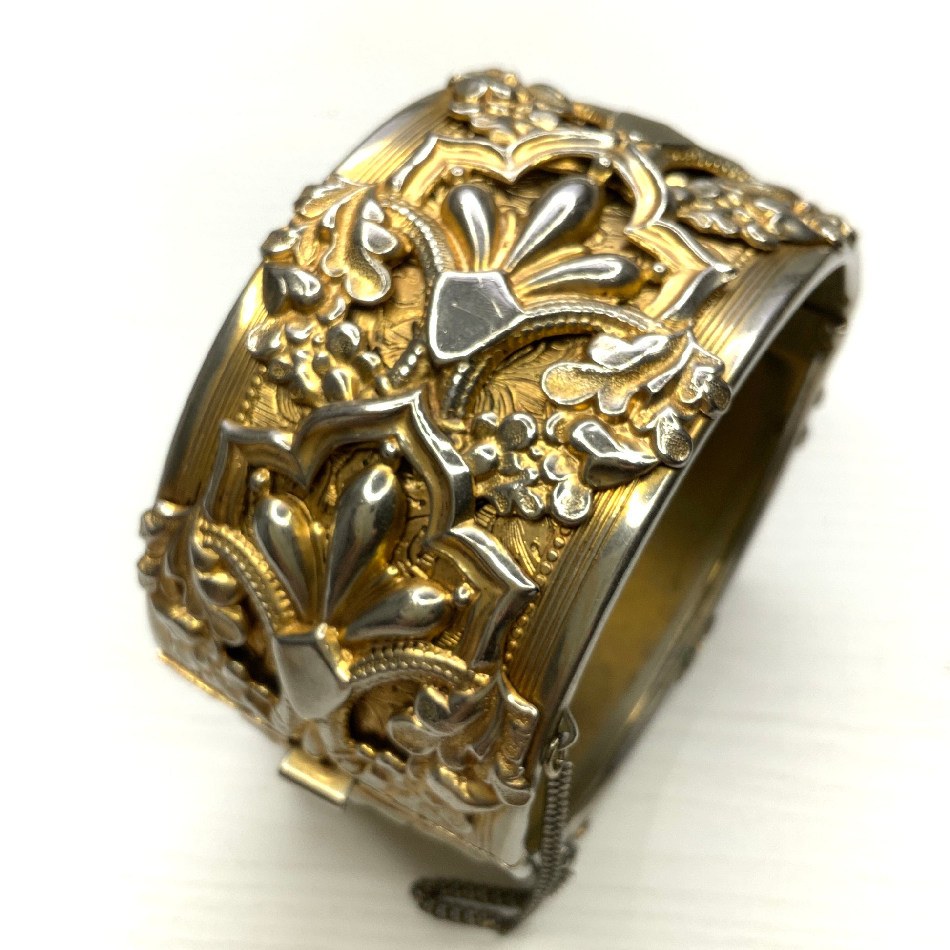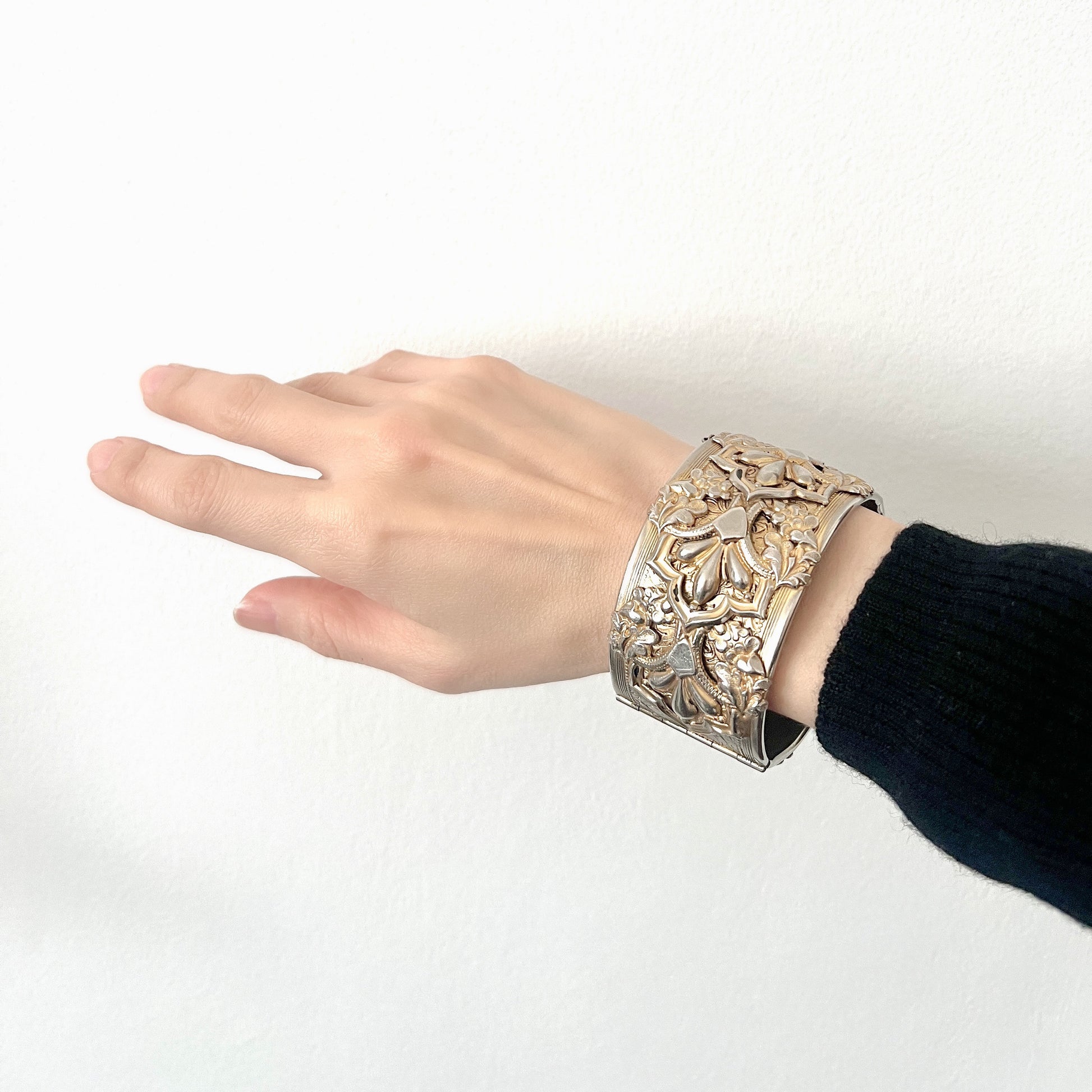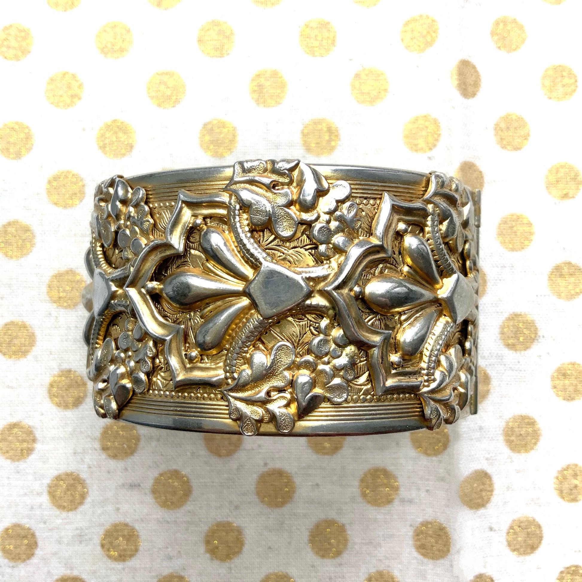美しい装飾のレポーズ(型押し)が施されたゴールドトーンのワイドバングル。