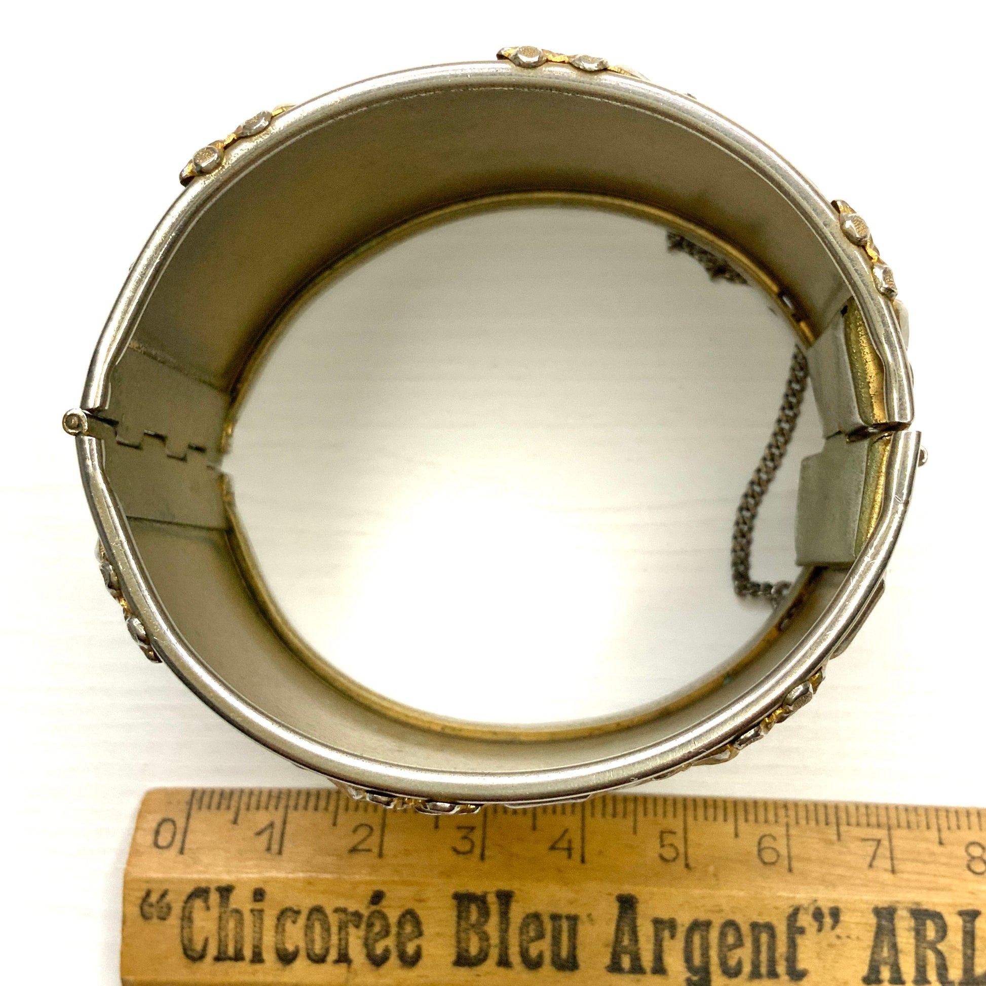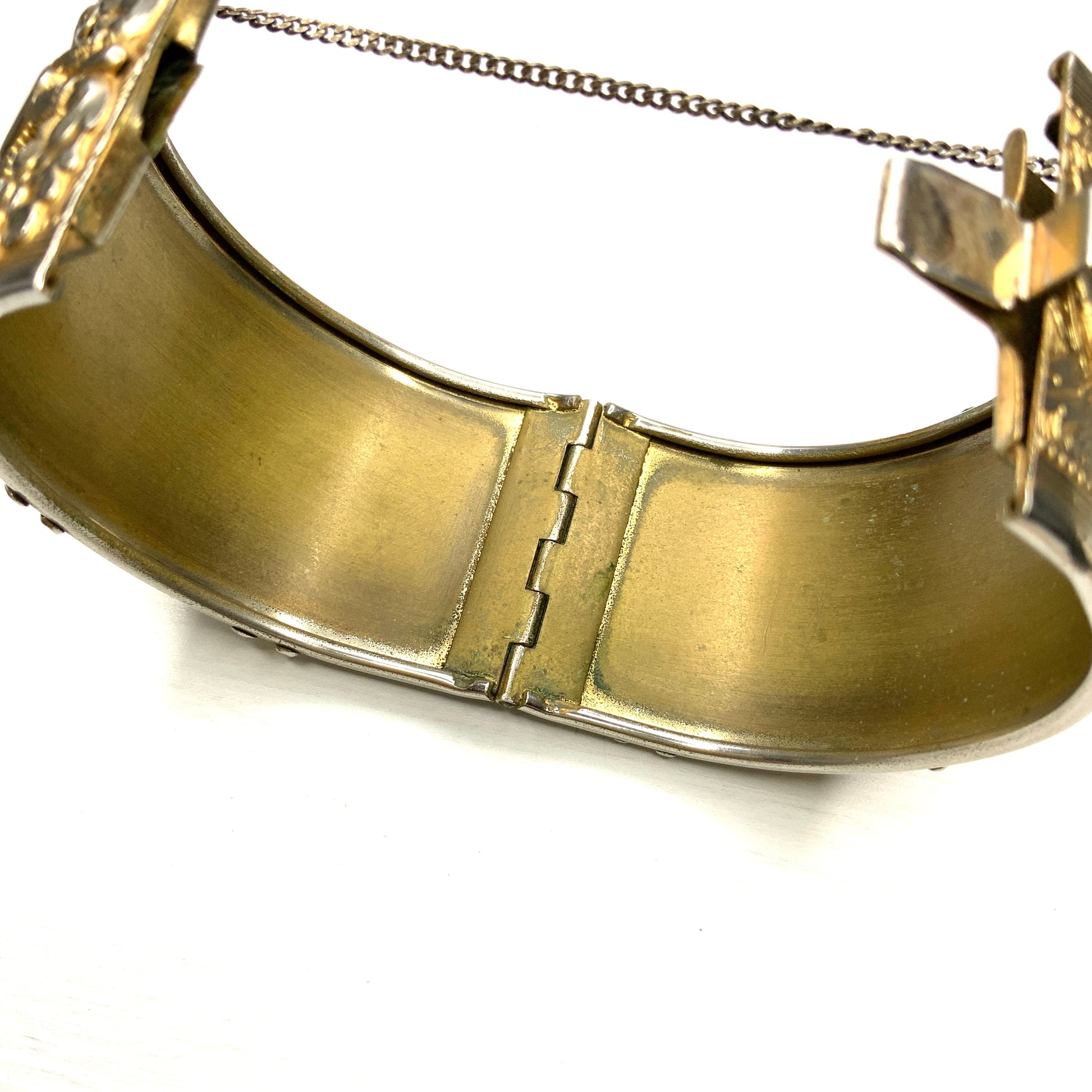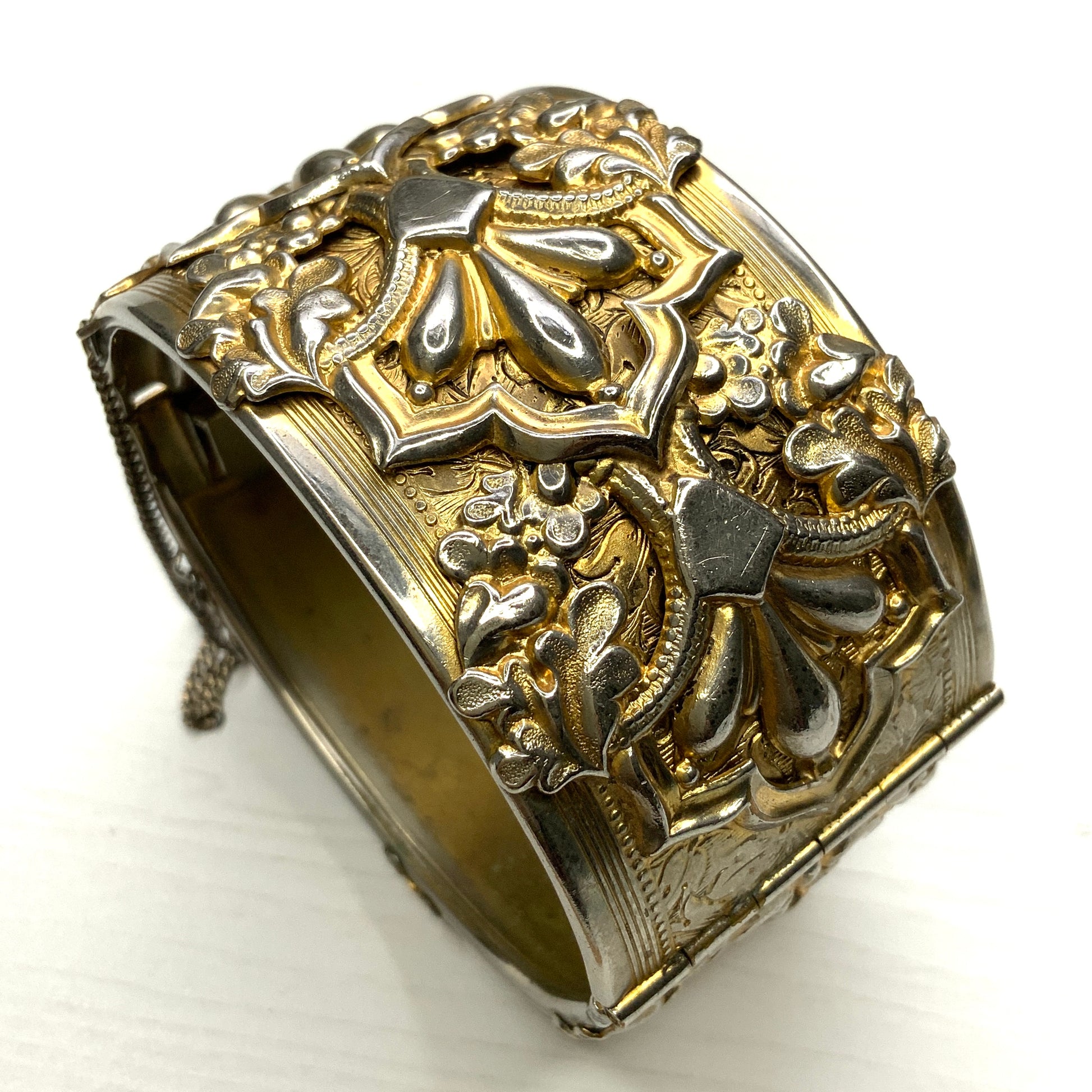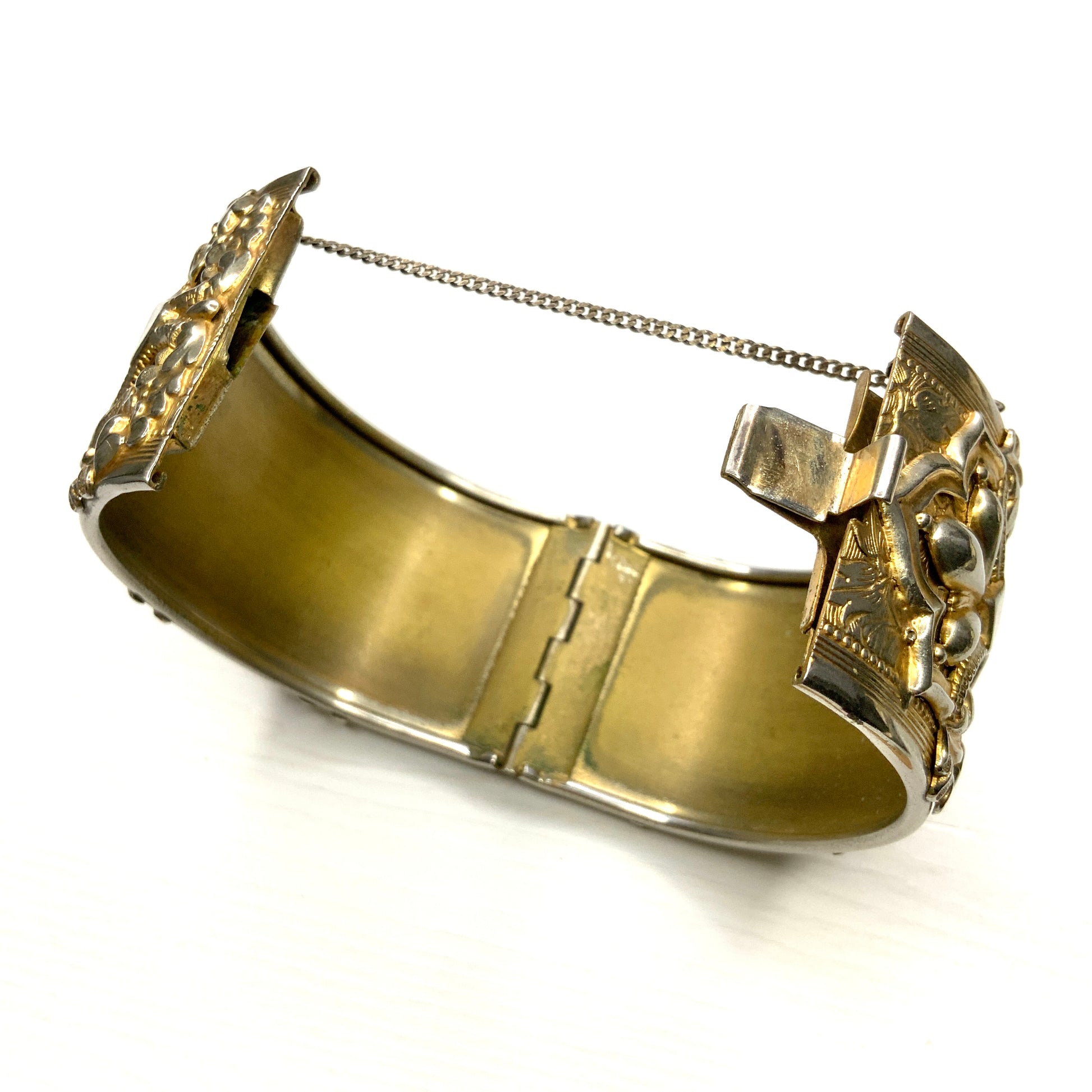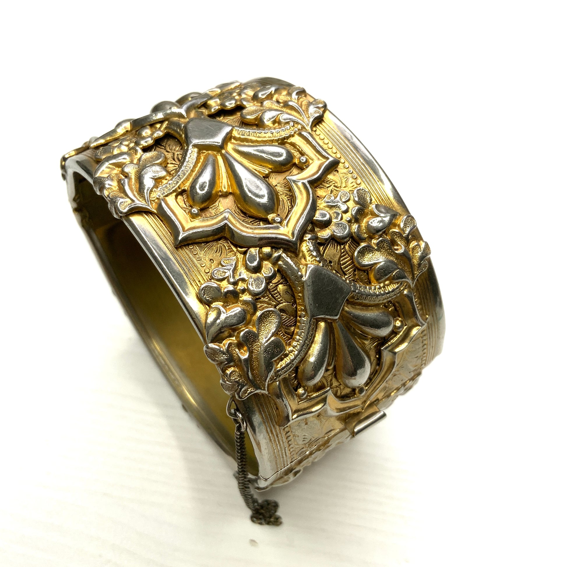 美しい装飾のレポーズ(型押し)が施されたゴールドトーンのワイドバングル。