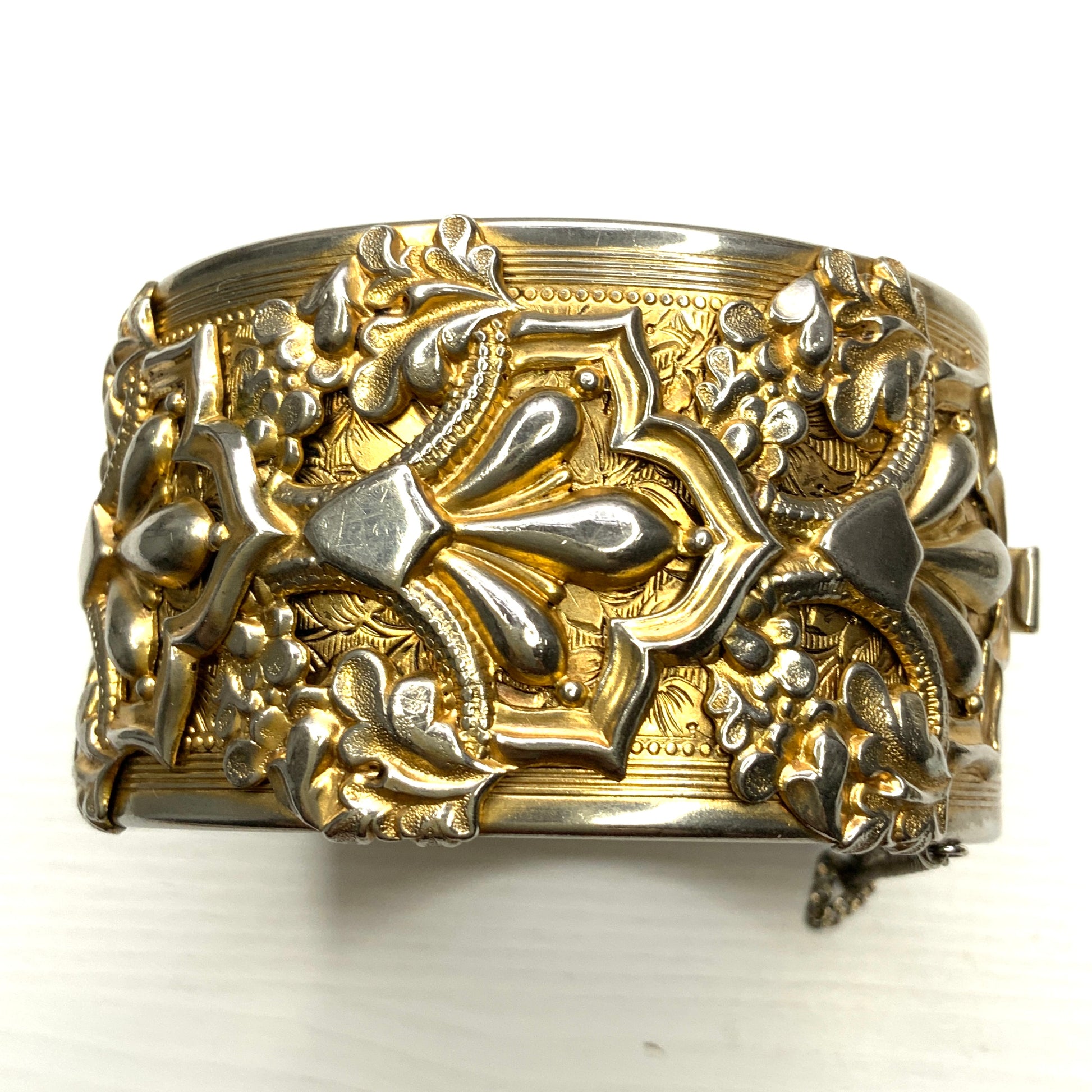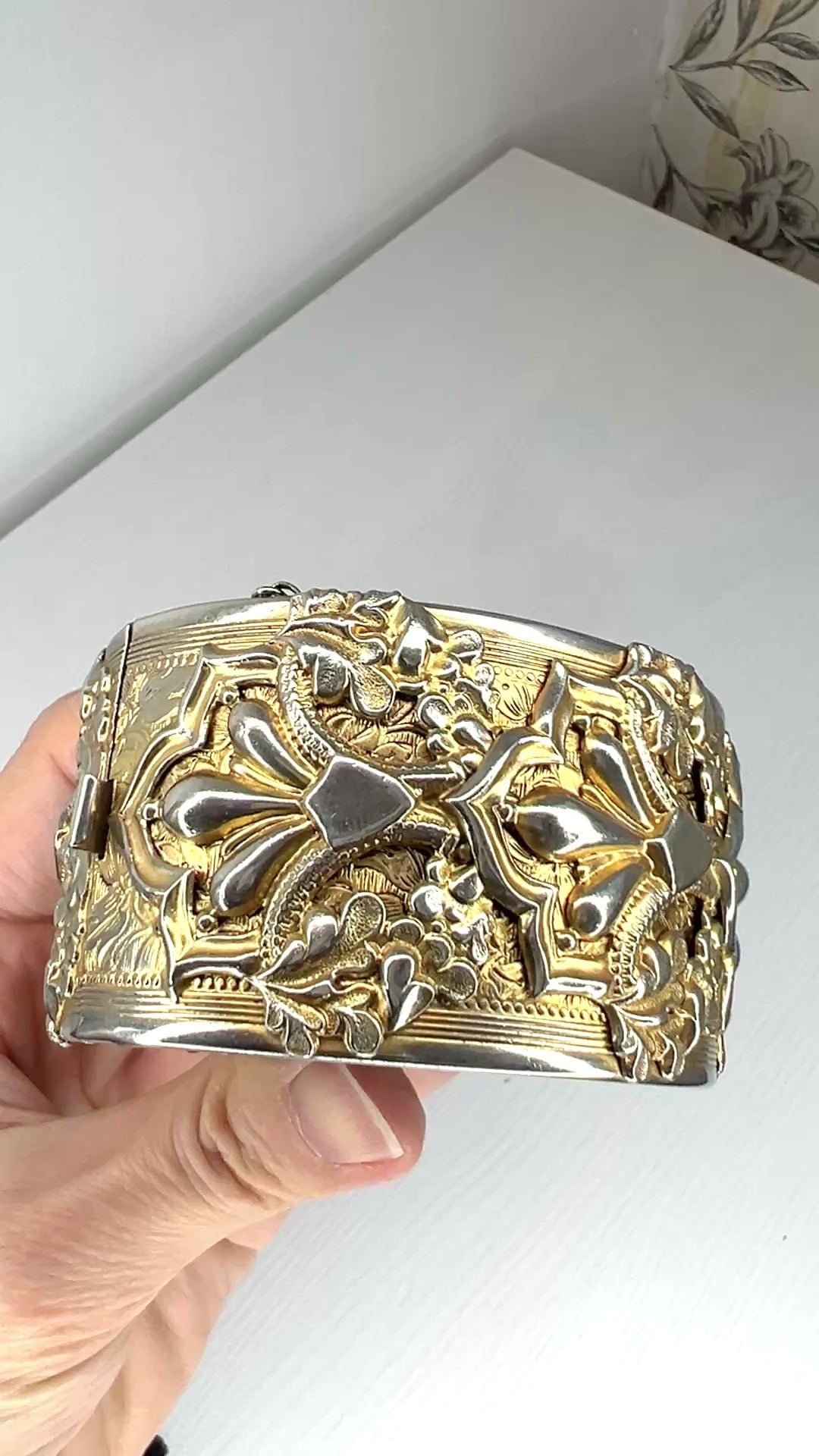 A gold-tone wide bangle adorned with beautiful repousse decoration. The base is engraved with a stunning botanical pattern, with a unique repousse design added on top.