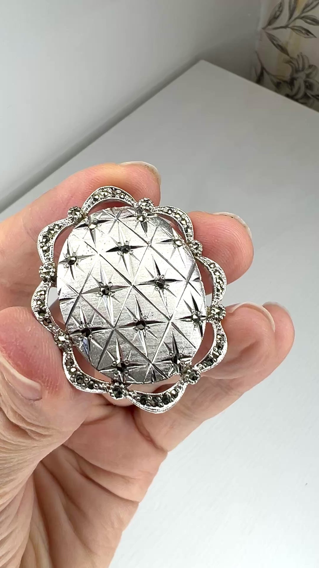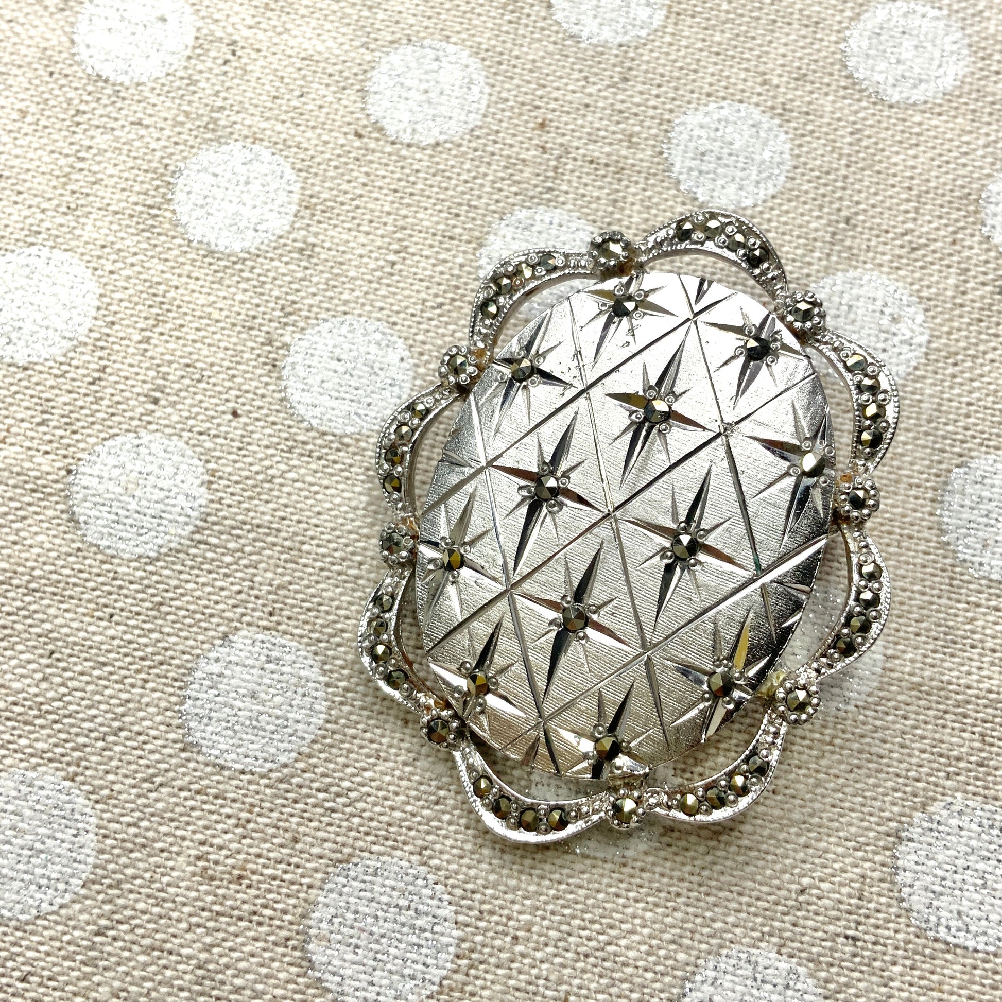 Marcasites sparkle in the center of the starbursts and on the borders that decorate the oval.