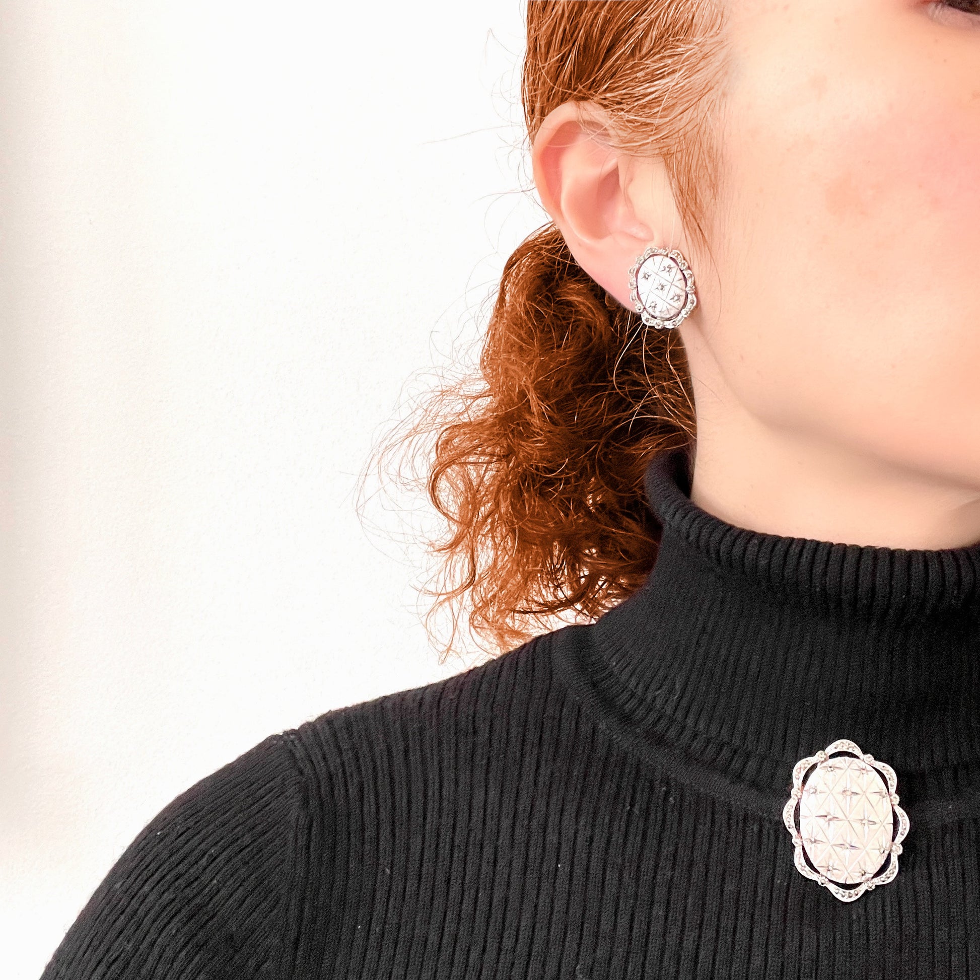 スターバーストの柄が刻み込まれたシルバートーンの楕円のクリップイヤリング。