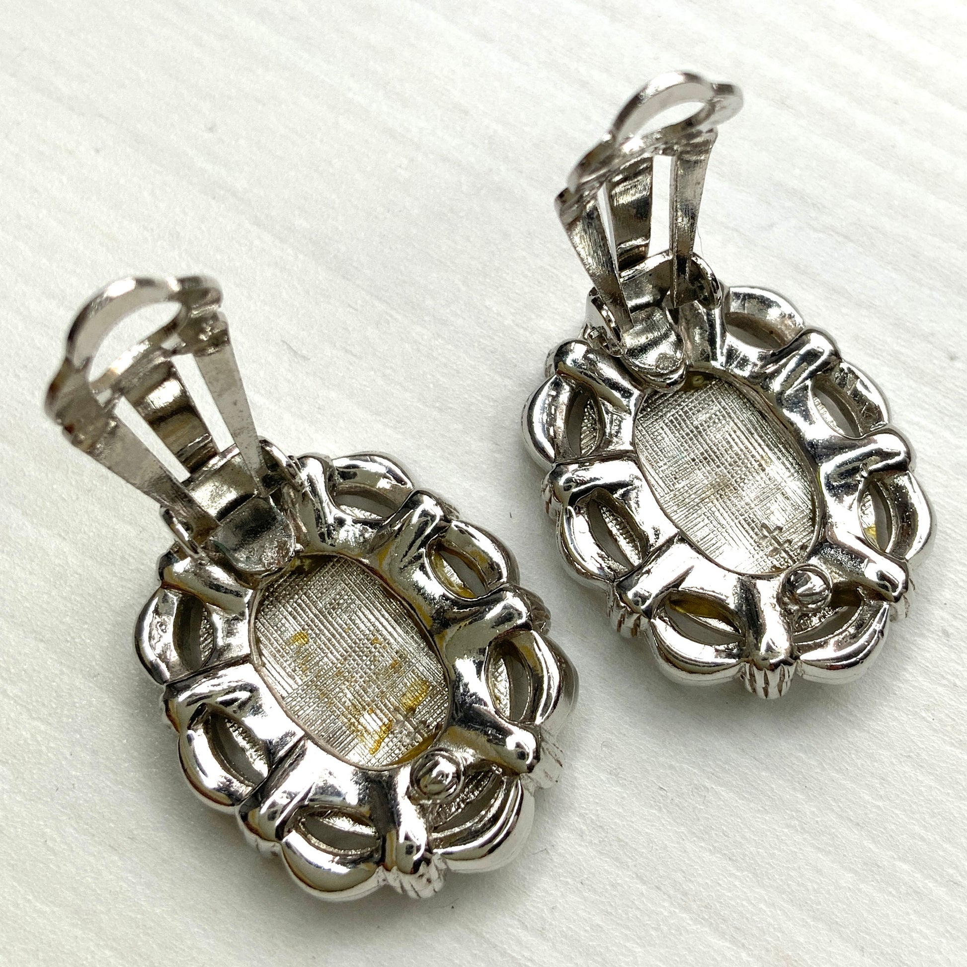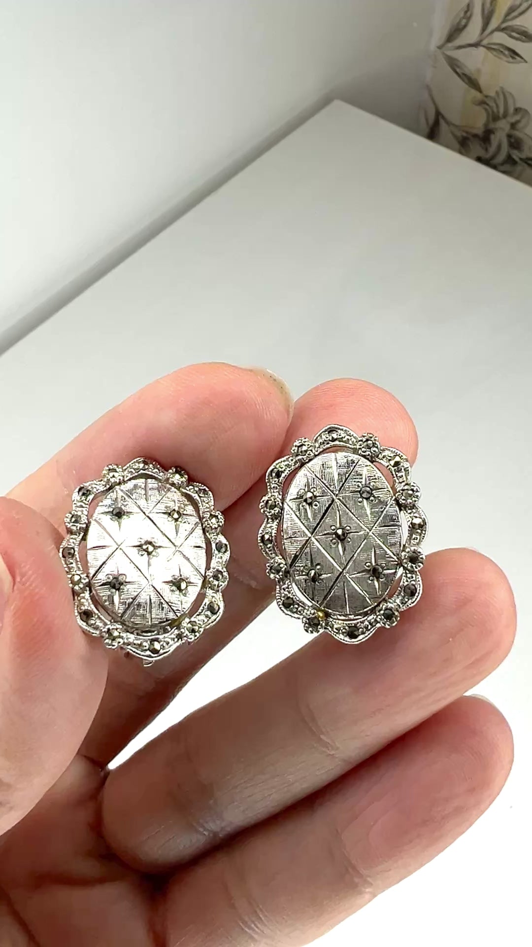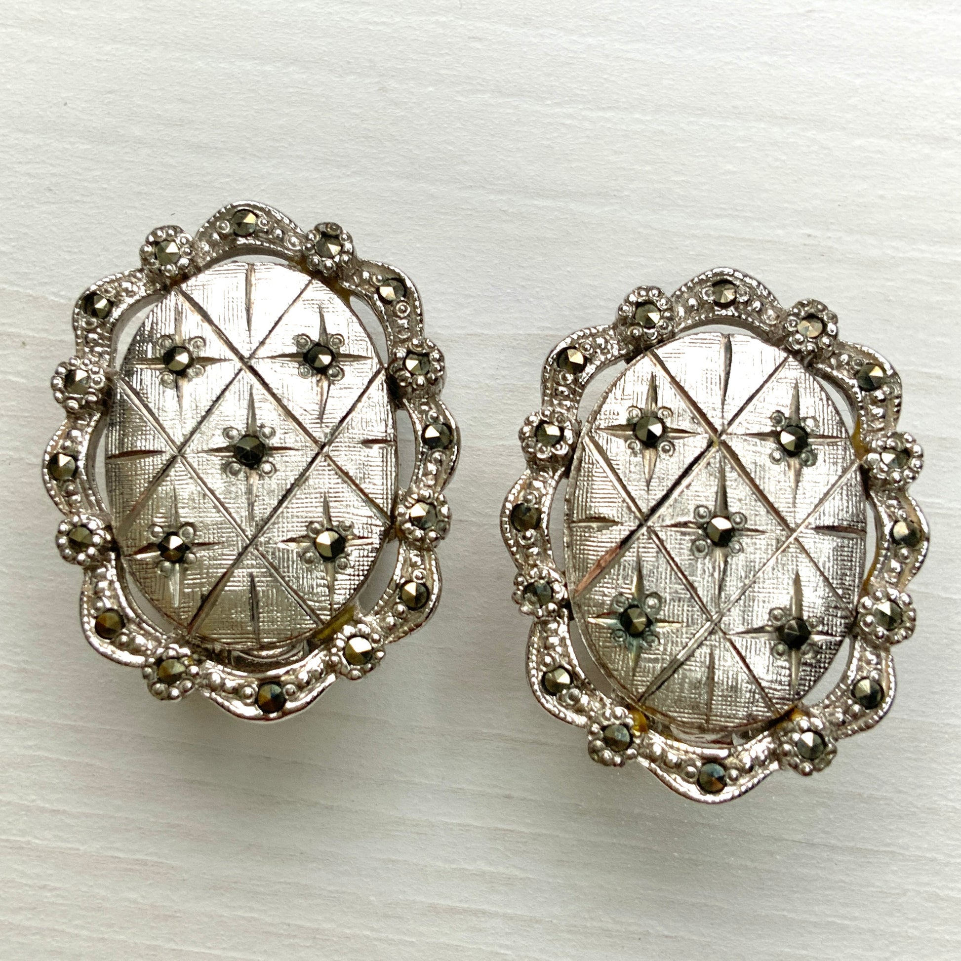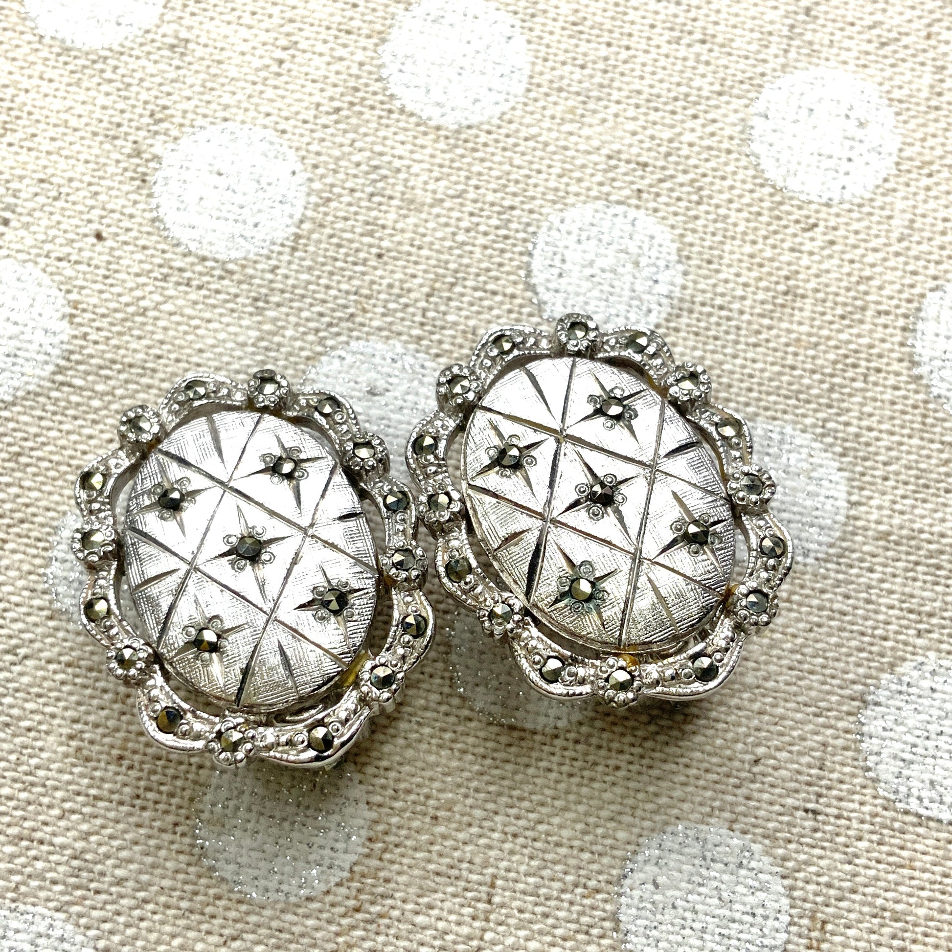 VINTAGE 1950's SPHINX Silver Tone Oval Starburst & Marcasite Clip Earrings