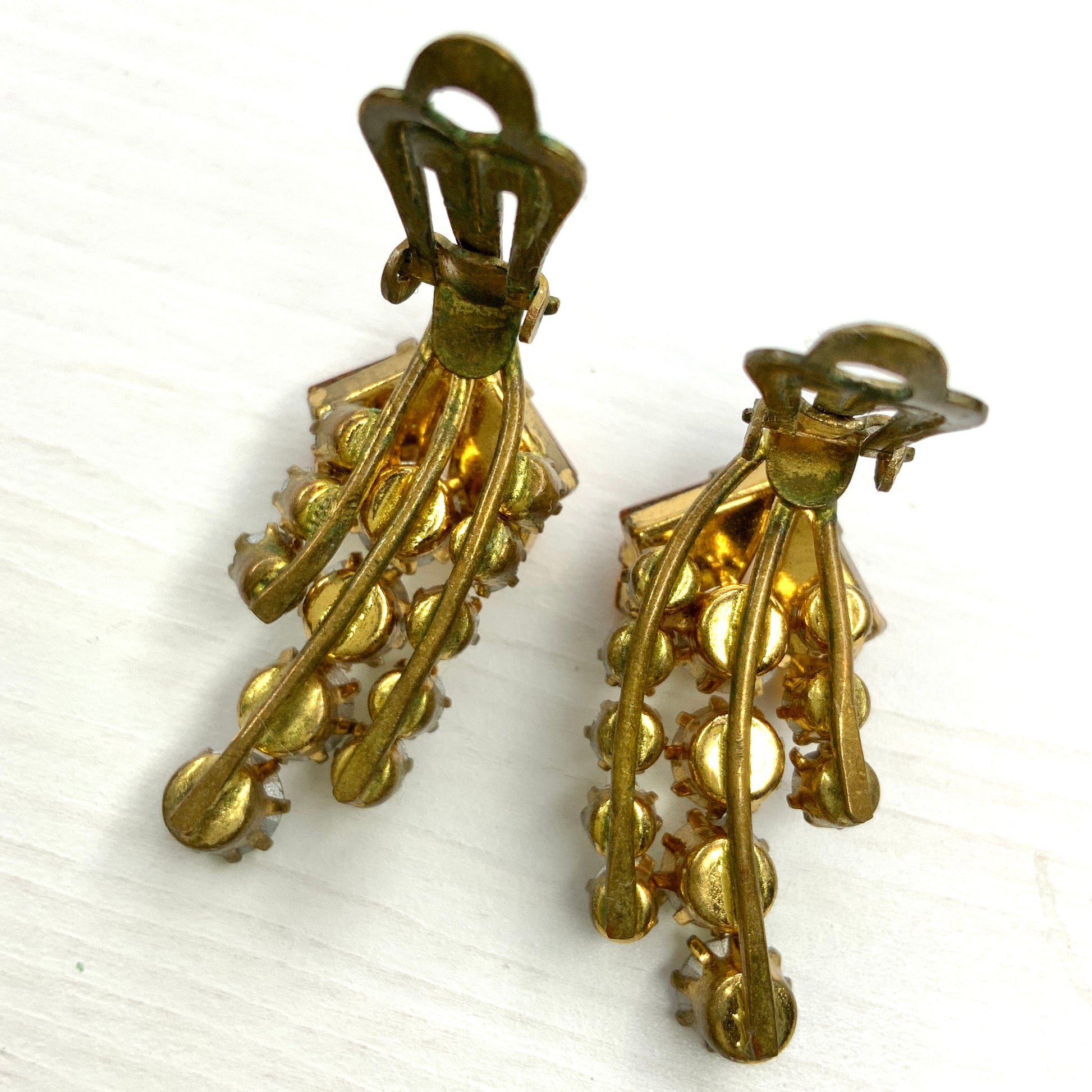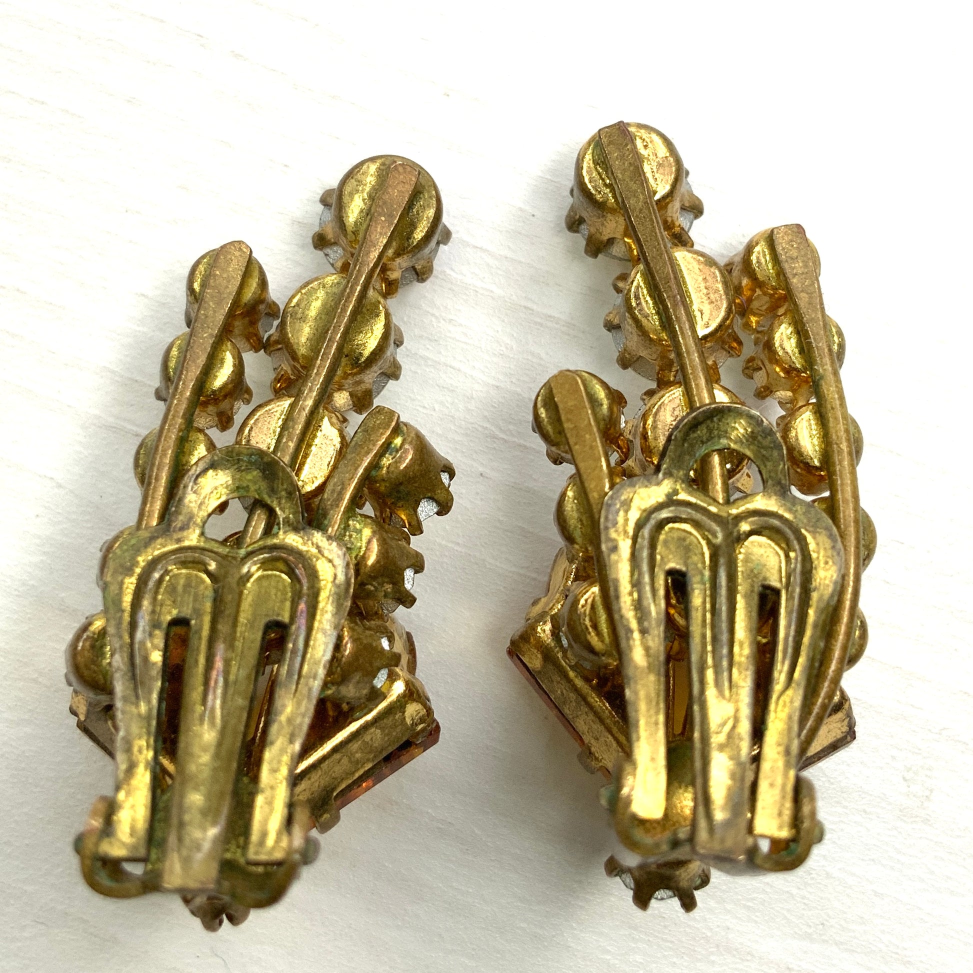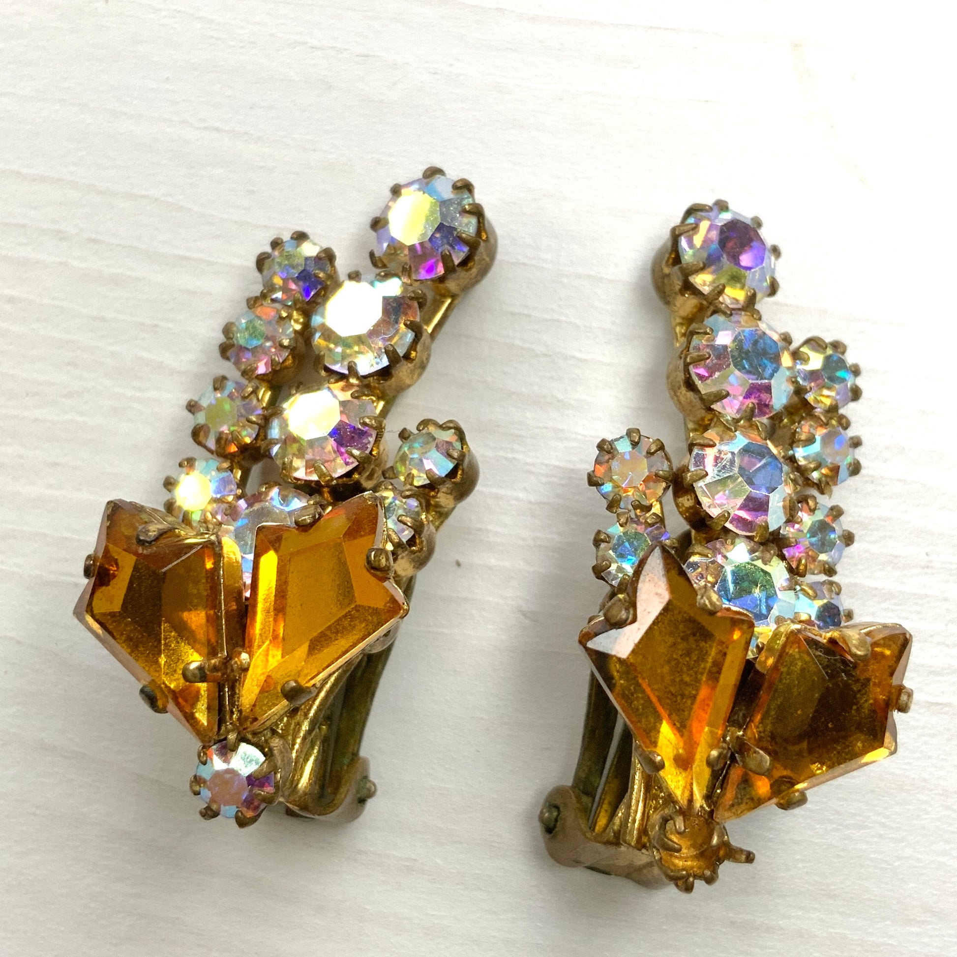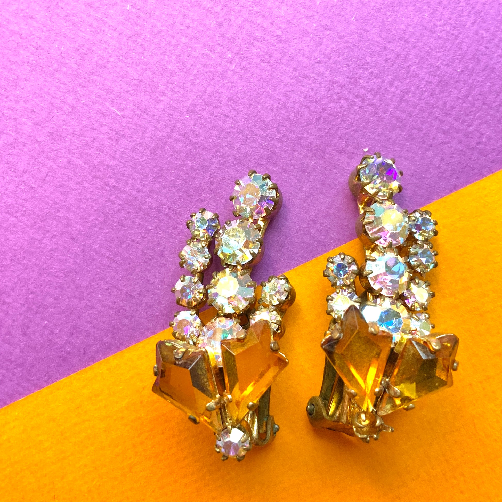 VINTAGE 1950-60's Yellow Mirror Glass & Aurora Borealis Clip Earrings