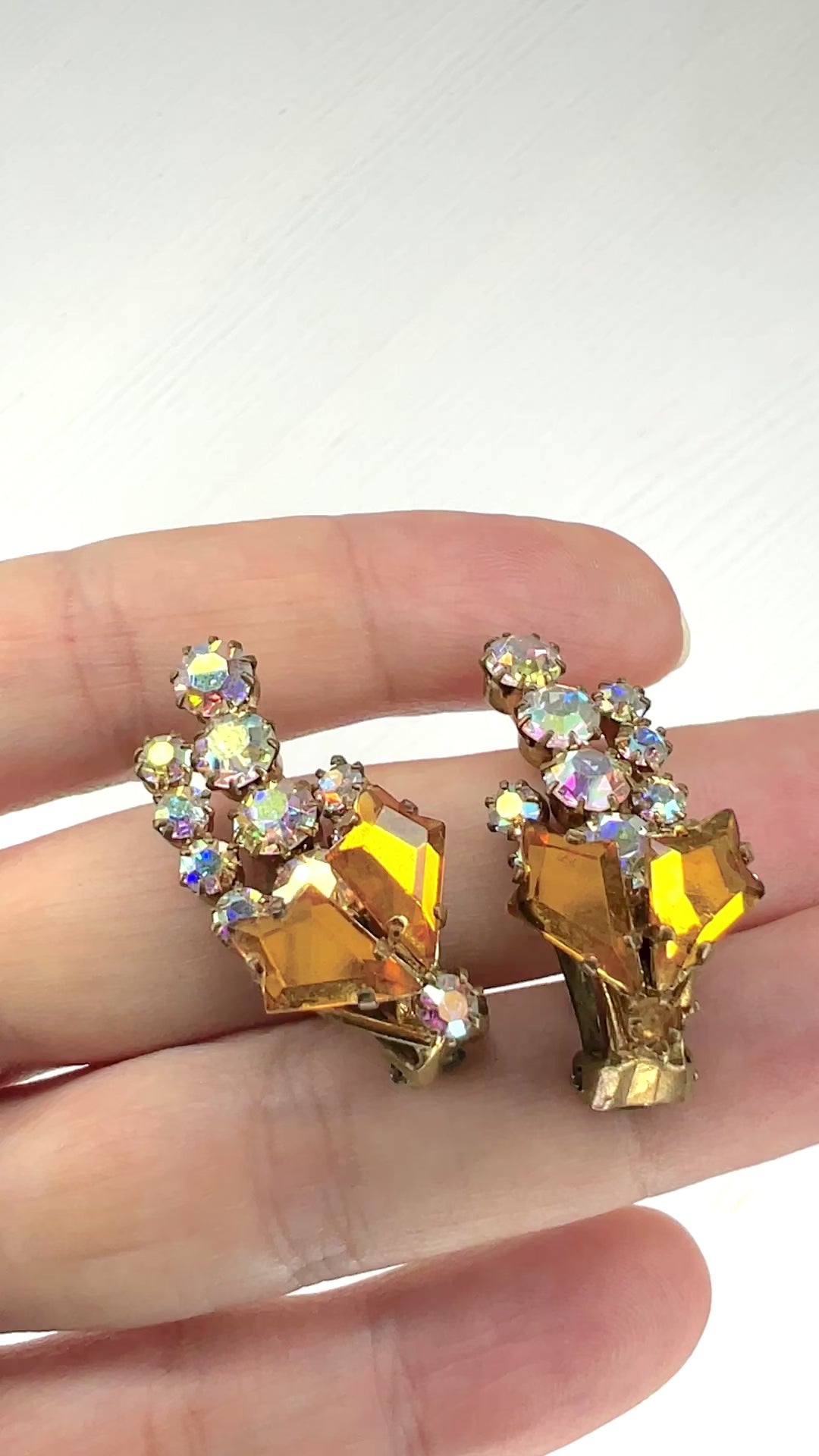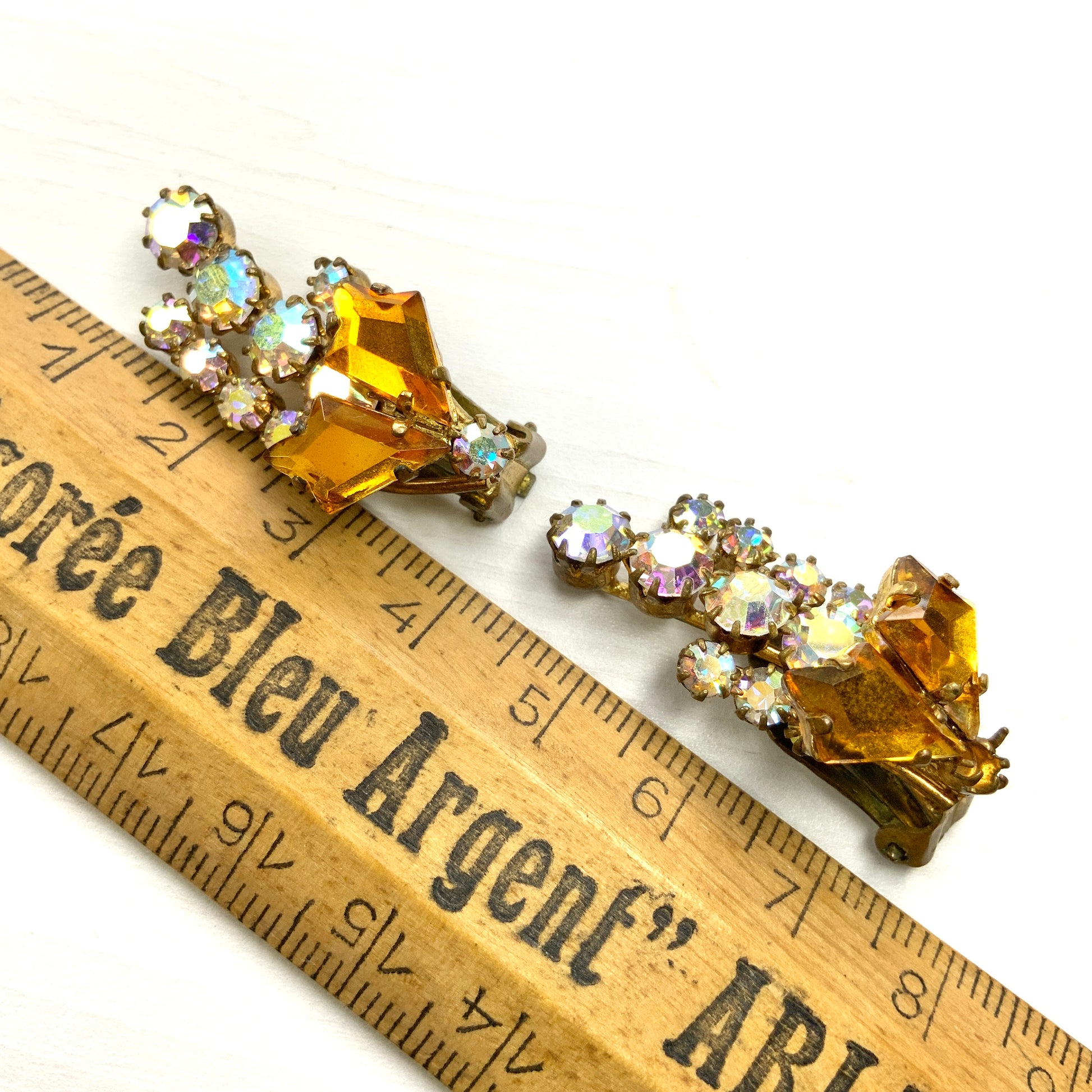 These clip earrings feature a deep yellow/amber coloured mirror glass that resembles orange, with sparkling white aurora borealis.