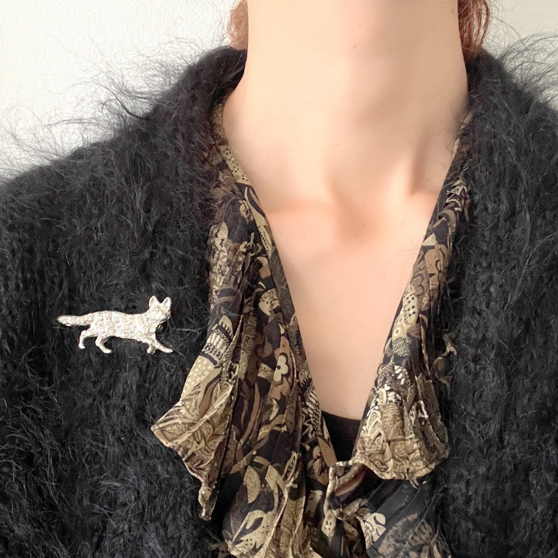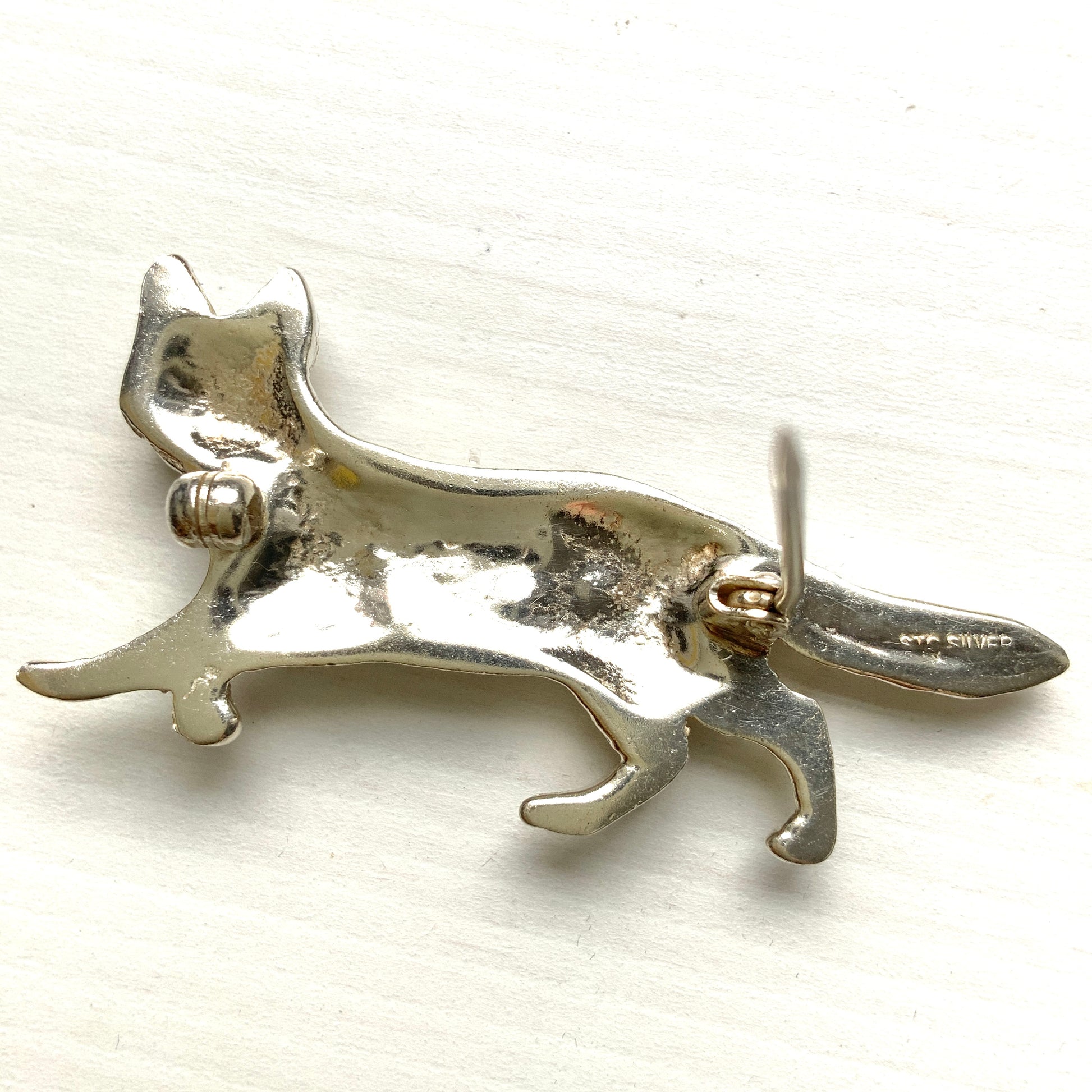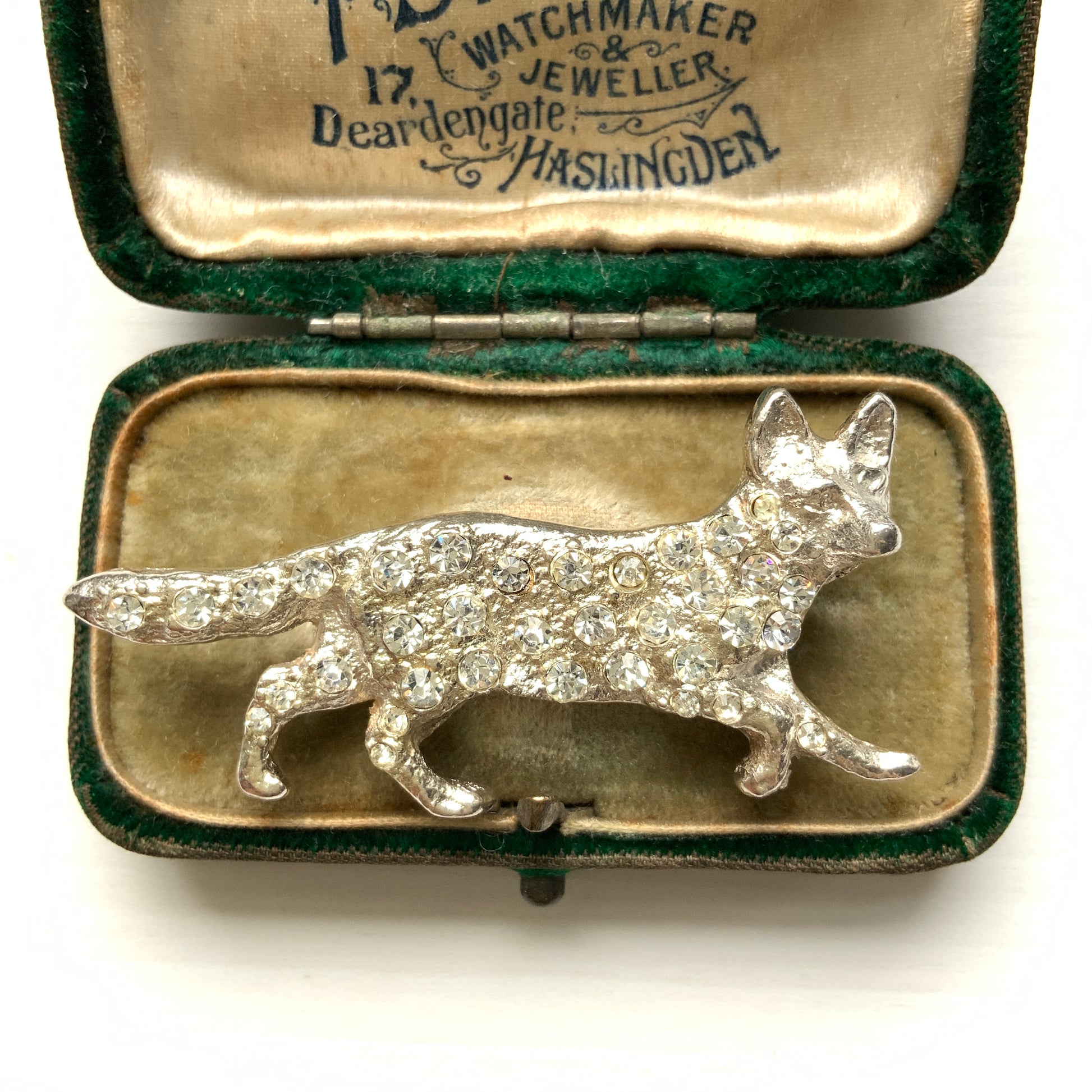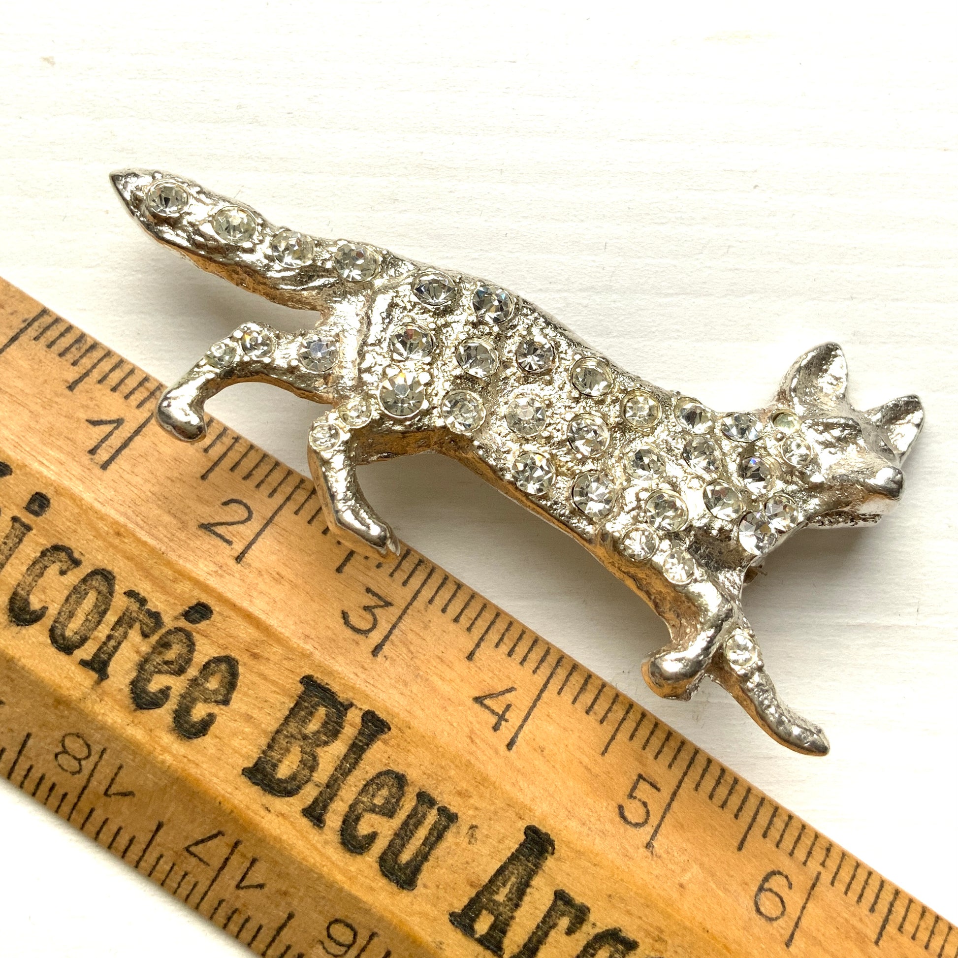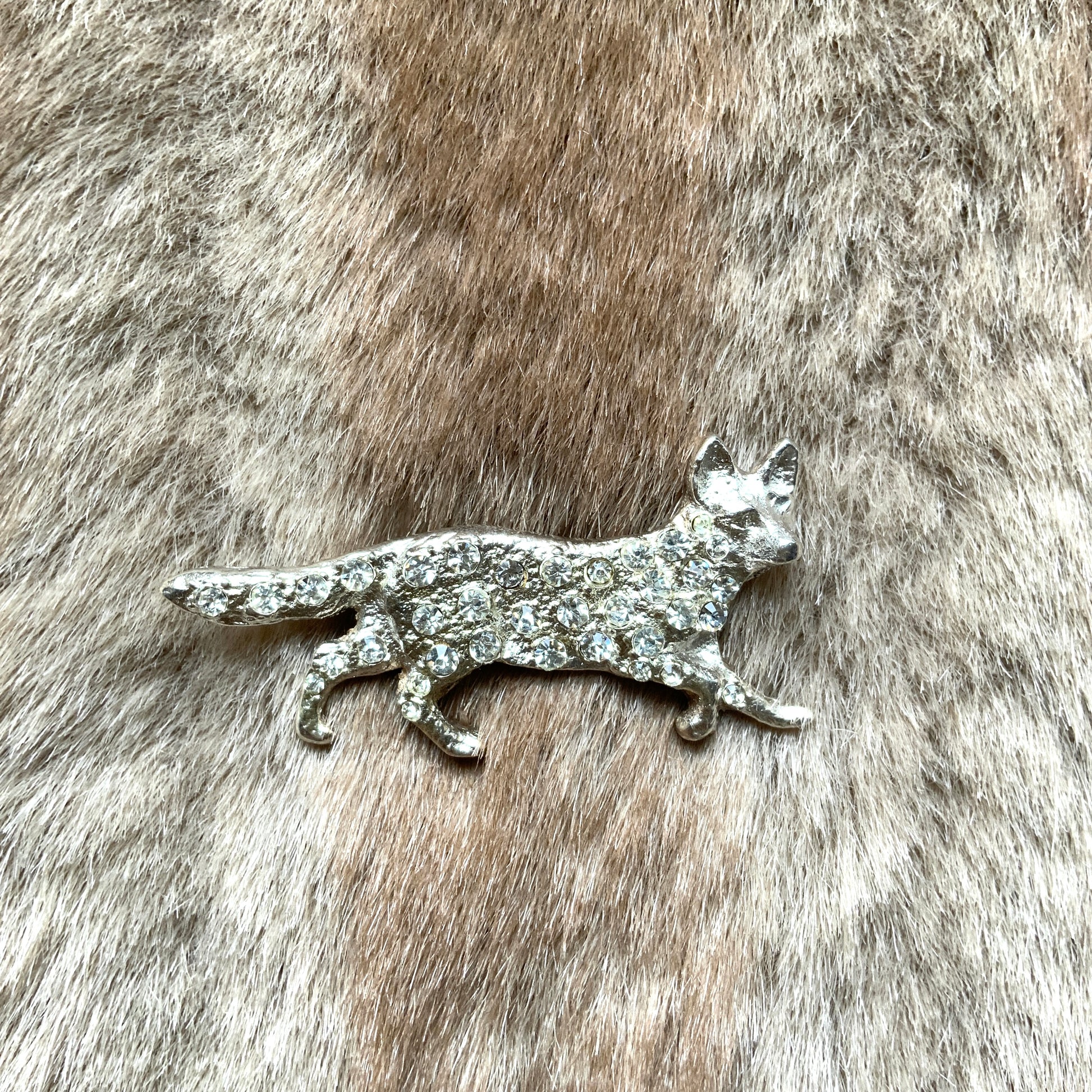 A silver fox brooch studded with rhinestones.
