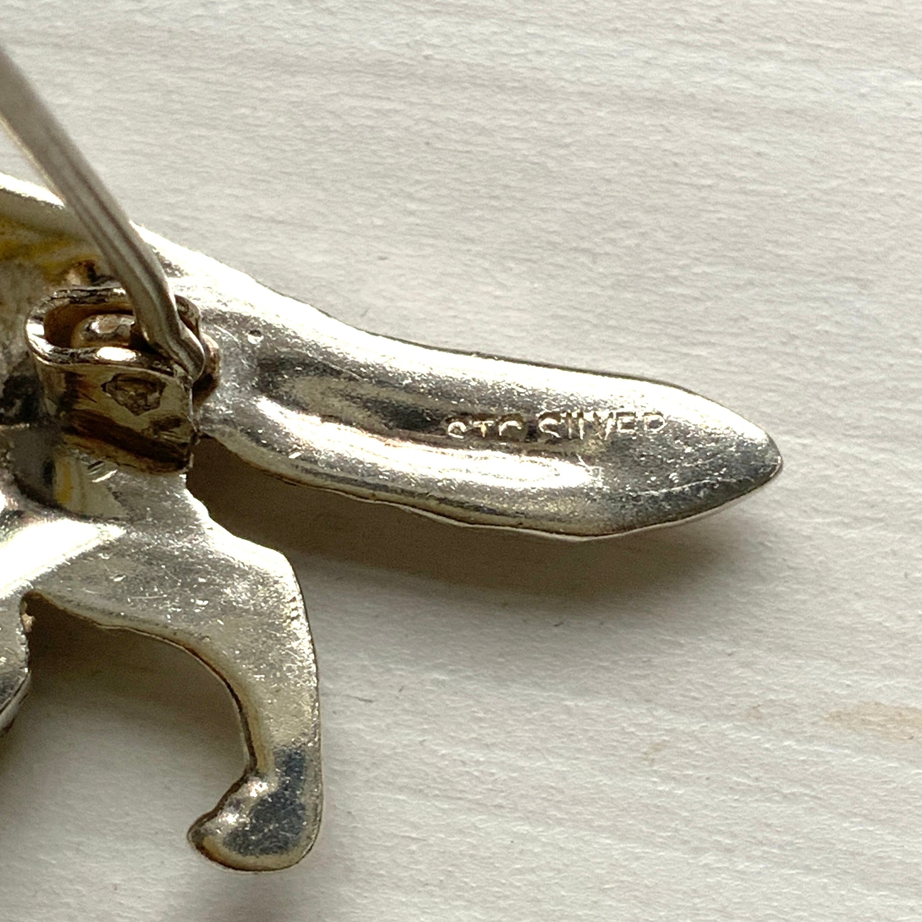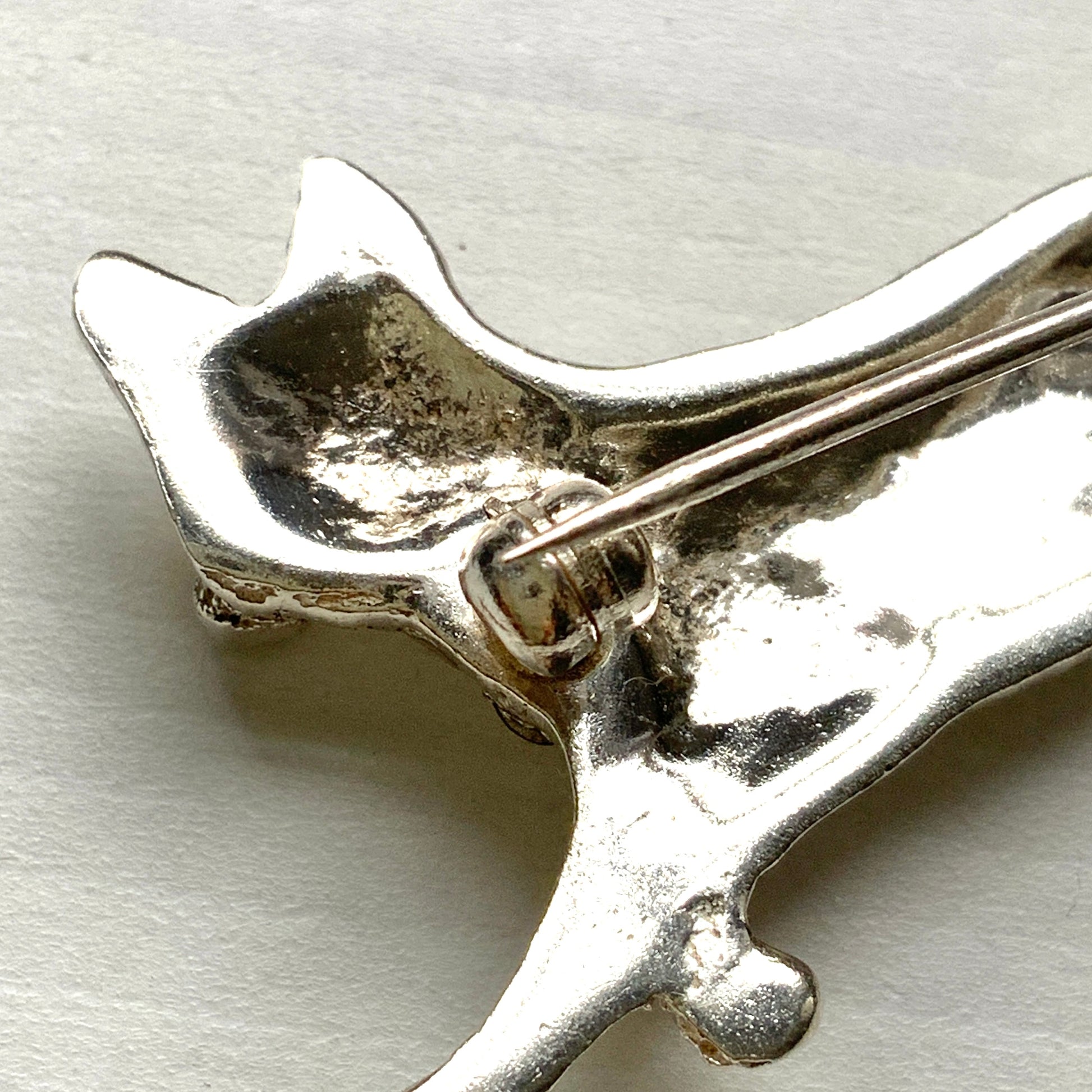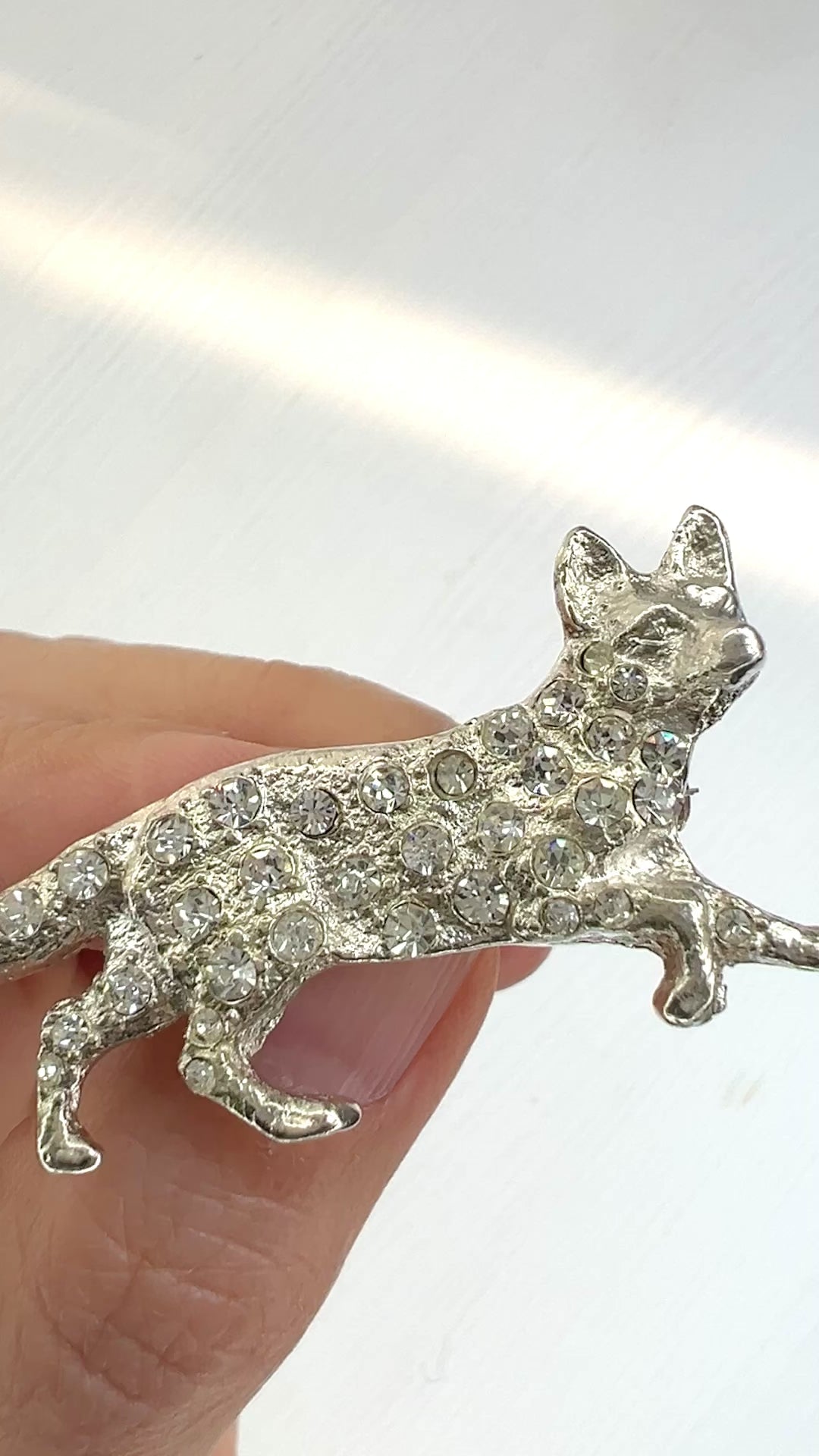 ラインストーンが散りばめられたキツネのシルバーブローチ。