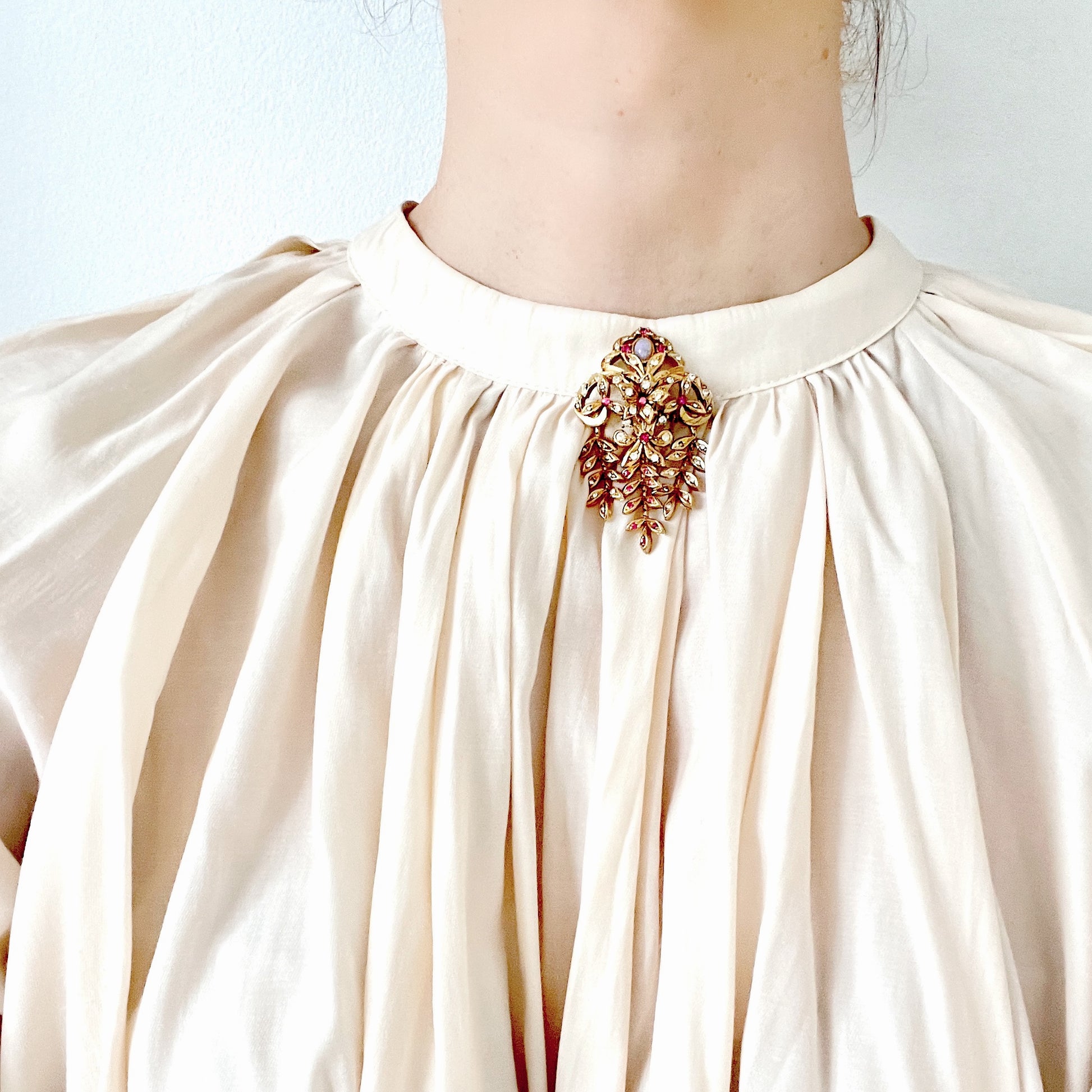 美しいゴールドトーンの優雅なボタニカルデザインに、ピンクとクリアのラインストーンをあしらったブローチ。