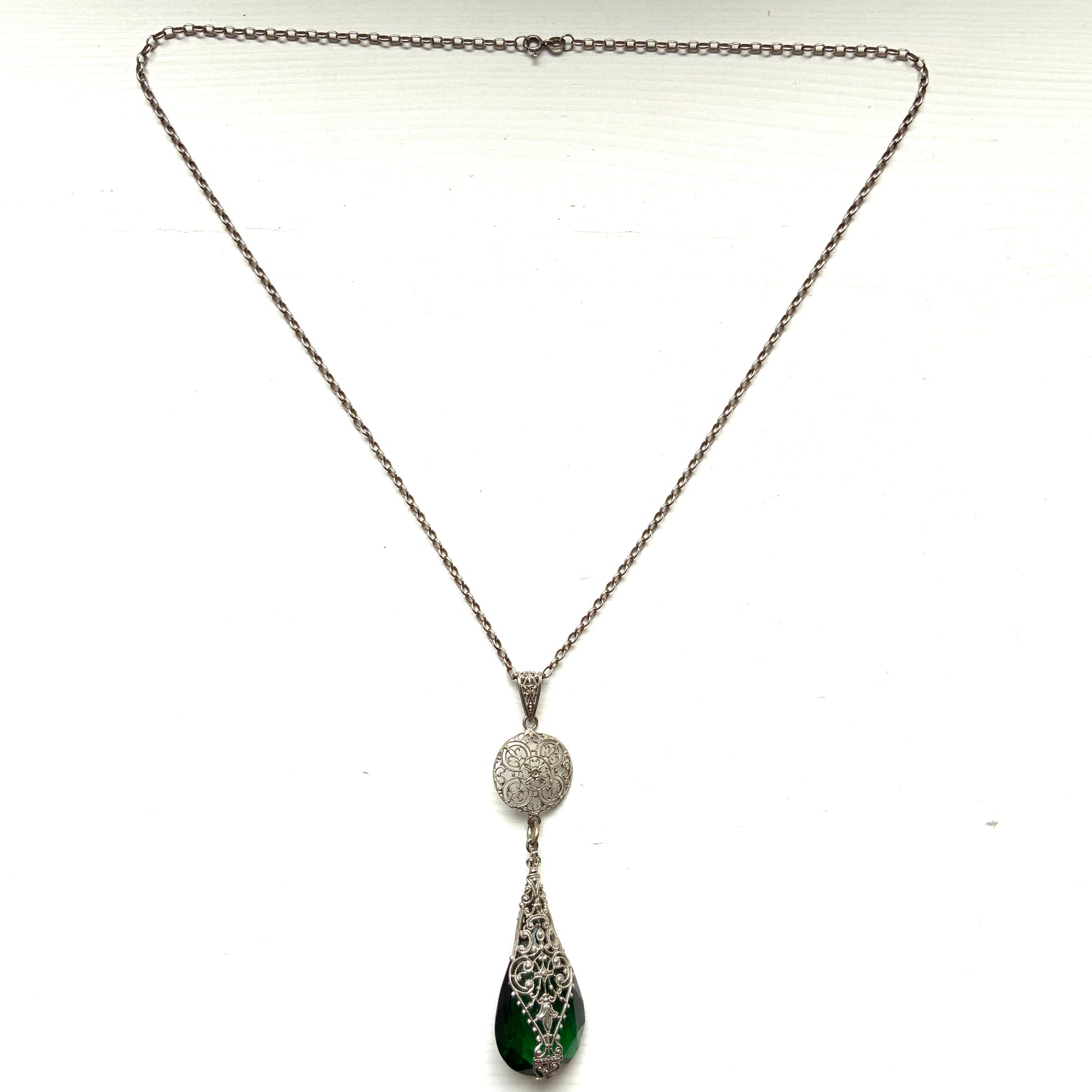 VINTAGE ART DECO Green Teardrop Glass Pendant Necklace with Silver Tone Filigree