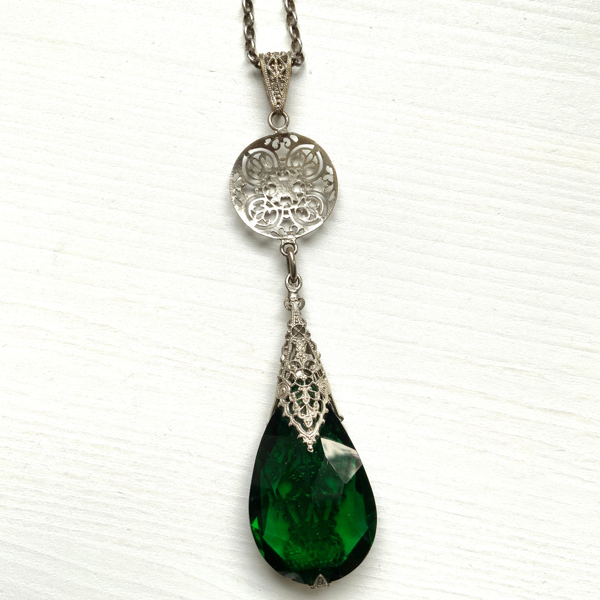 A pendant necklace featuring a deep forest-green teardrop glass adorned with delicate silver-tone filigree.