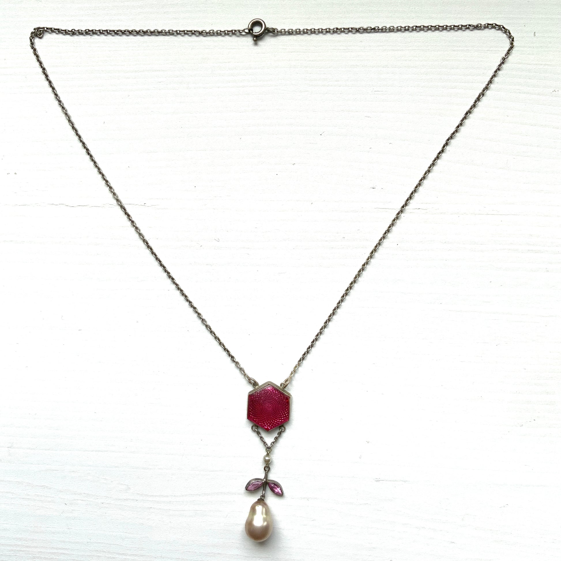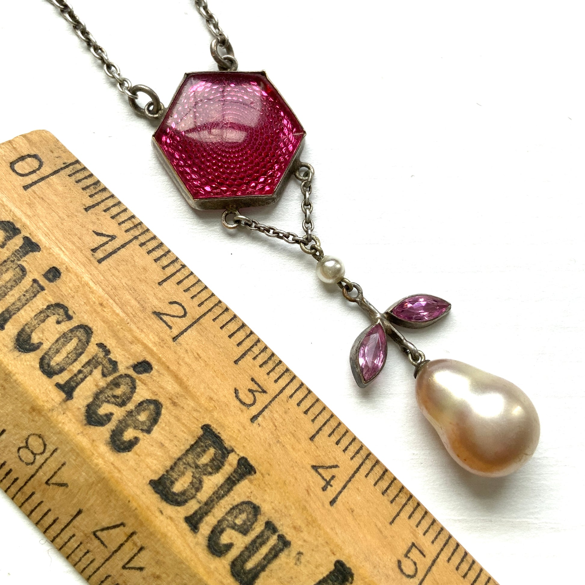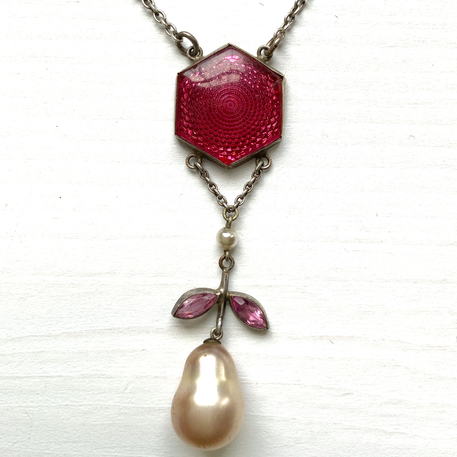 A lavalier-style necklace featuring a hexagonal pink glass with guilloché-style reverse carving, accented by a charming baroque glass pearl teardrop.