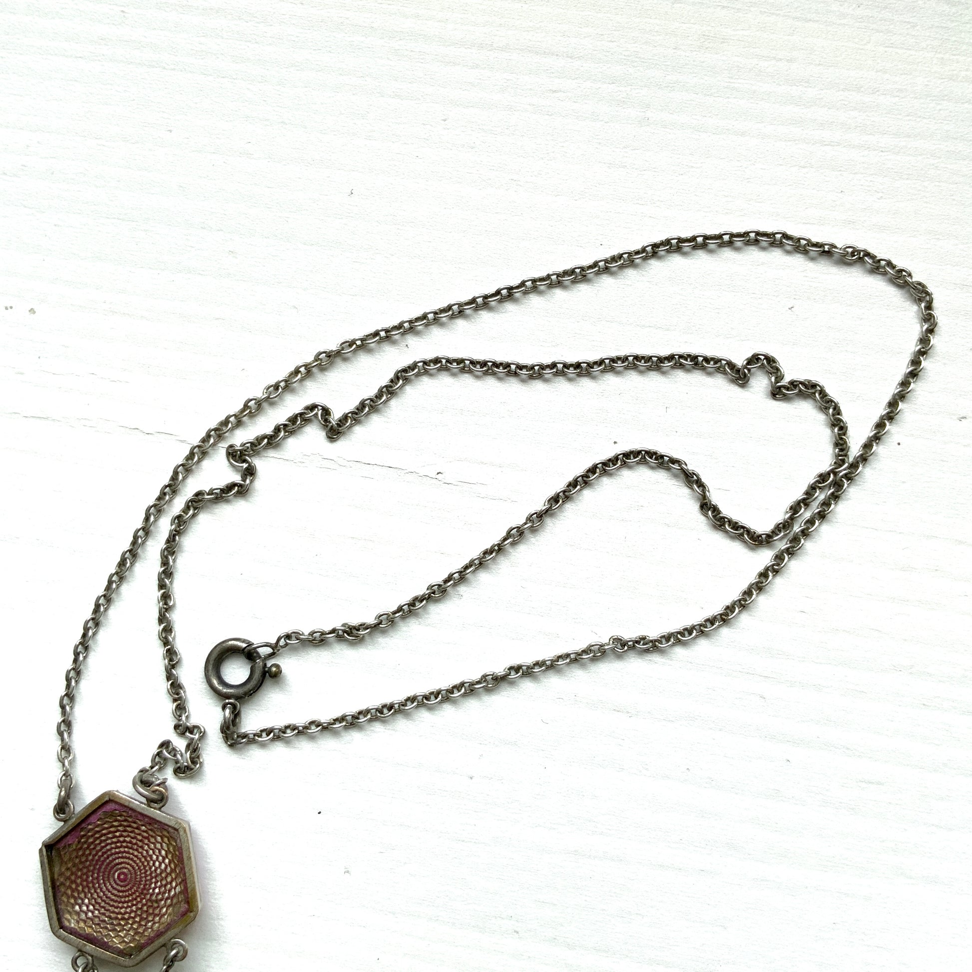 ギローシュエナメルのような模様が裏彫りされたピンクの六角形グラスに、かわいらしいバロックパールのティアドロップが揺れるラヴァリエスタイルのネックレス。