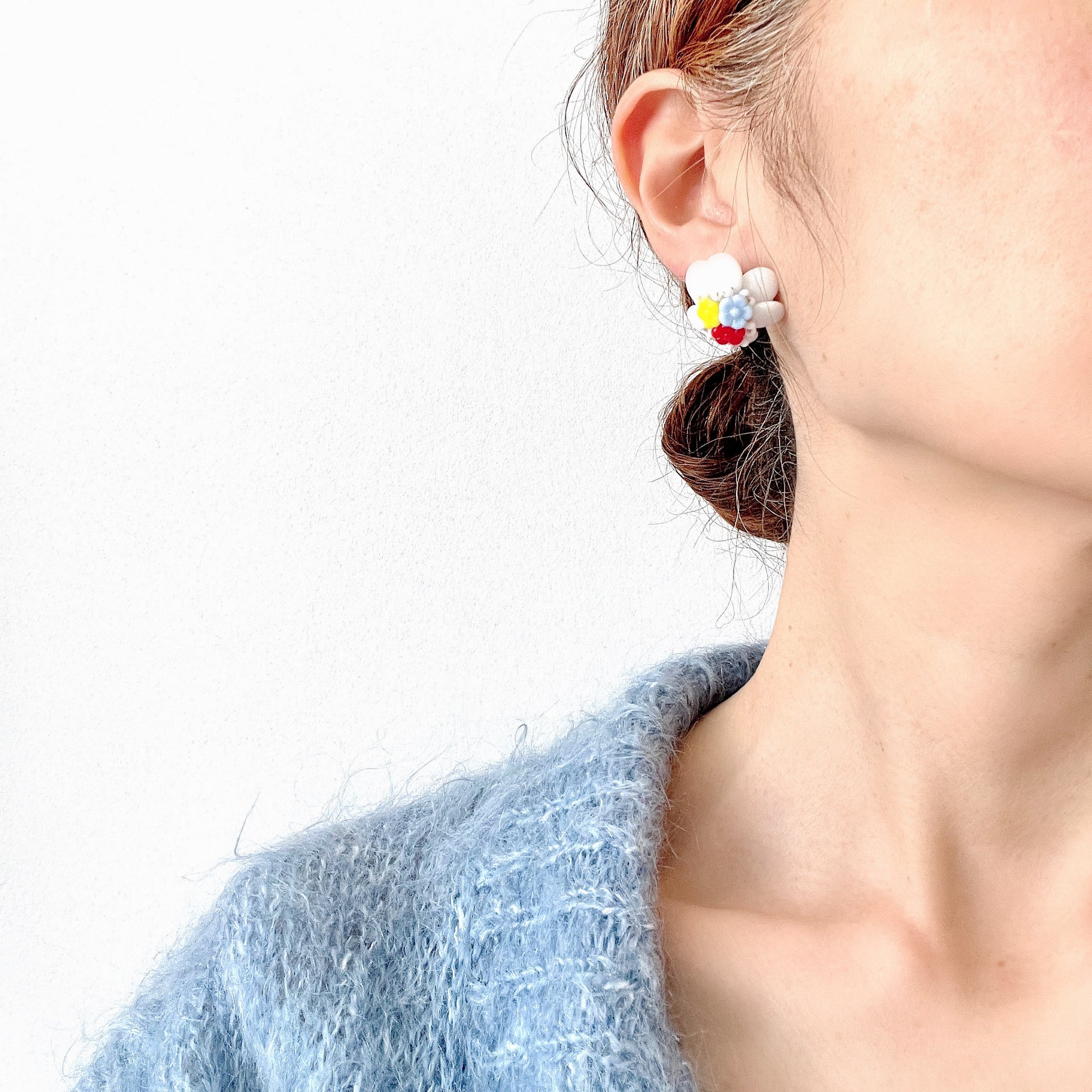 ターコイズブルーにパープルっぽいカラーのマーブル模様の入ったオーバルカボションの周りを、ゴールドトーンの小さなお花で飾ったクリップイヤリング。