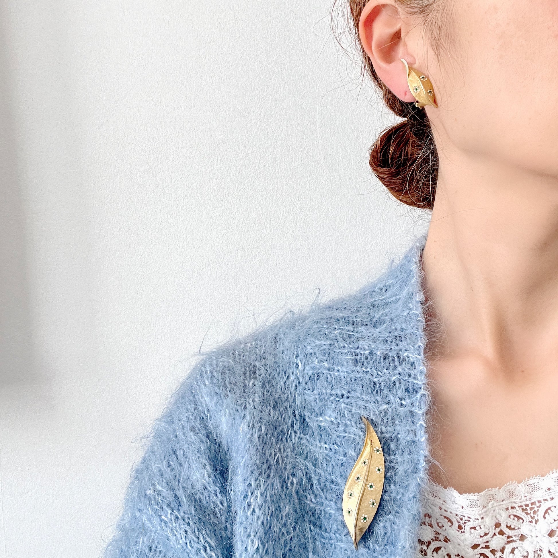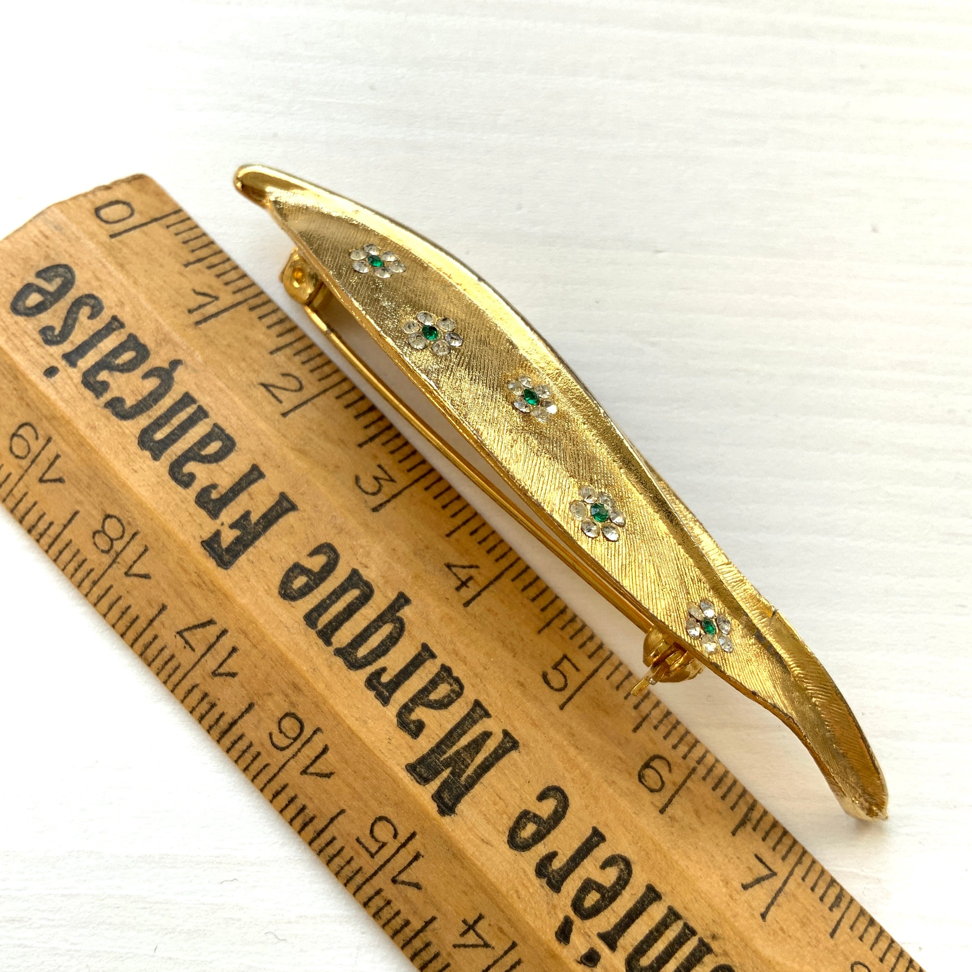 ゴールドトーンのリーフに、ラインストーンの小さなかわいいお花があしらわれたブローチ。