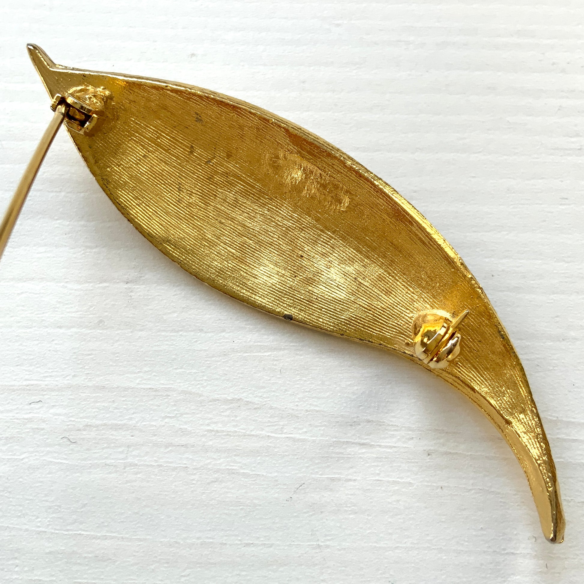 There are very minor surface scratches on the metal and slight wear to the gold tone in a few small areas. The pin is very slightly off-straight, but still works perfectly. (See photo 7) Otherwise, the piece is in excellent vintage condition.
