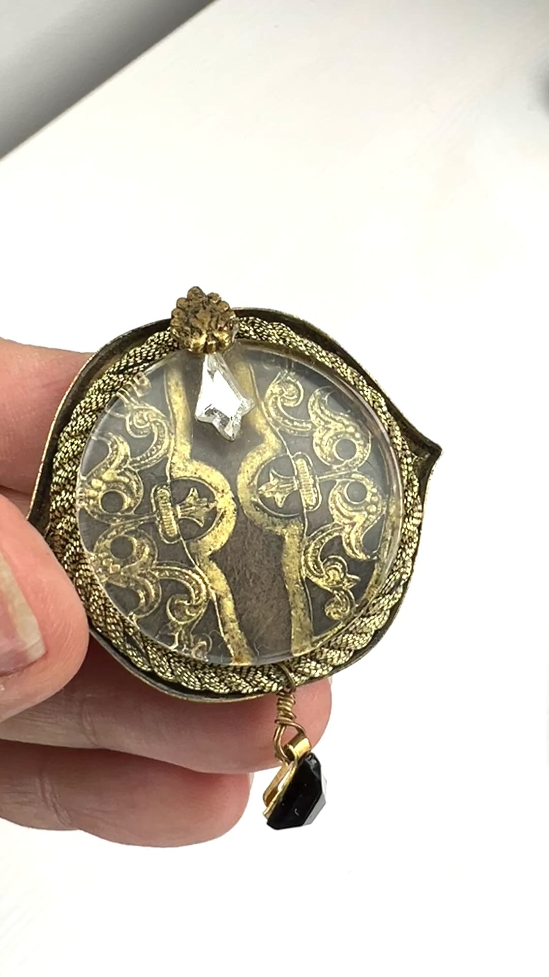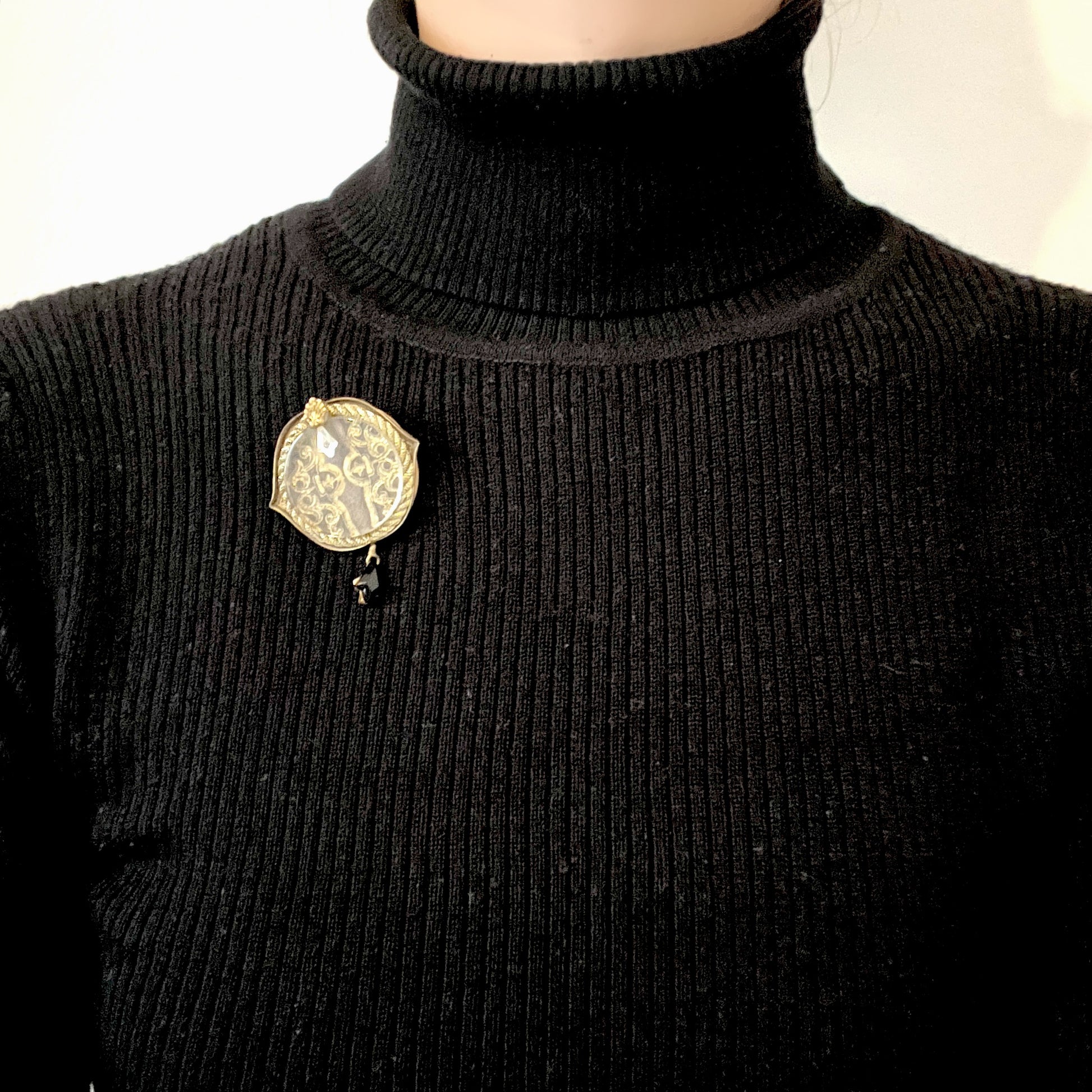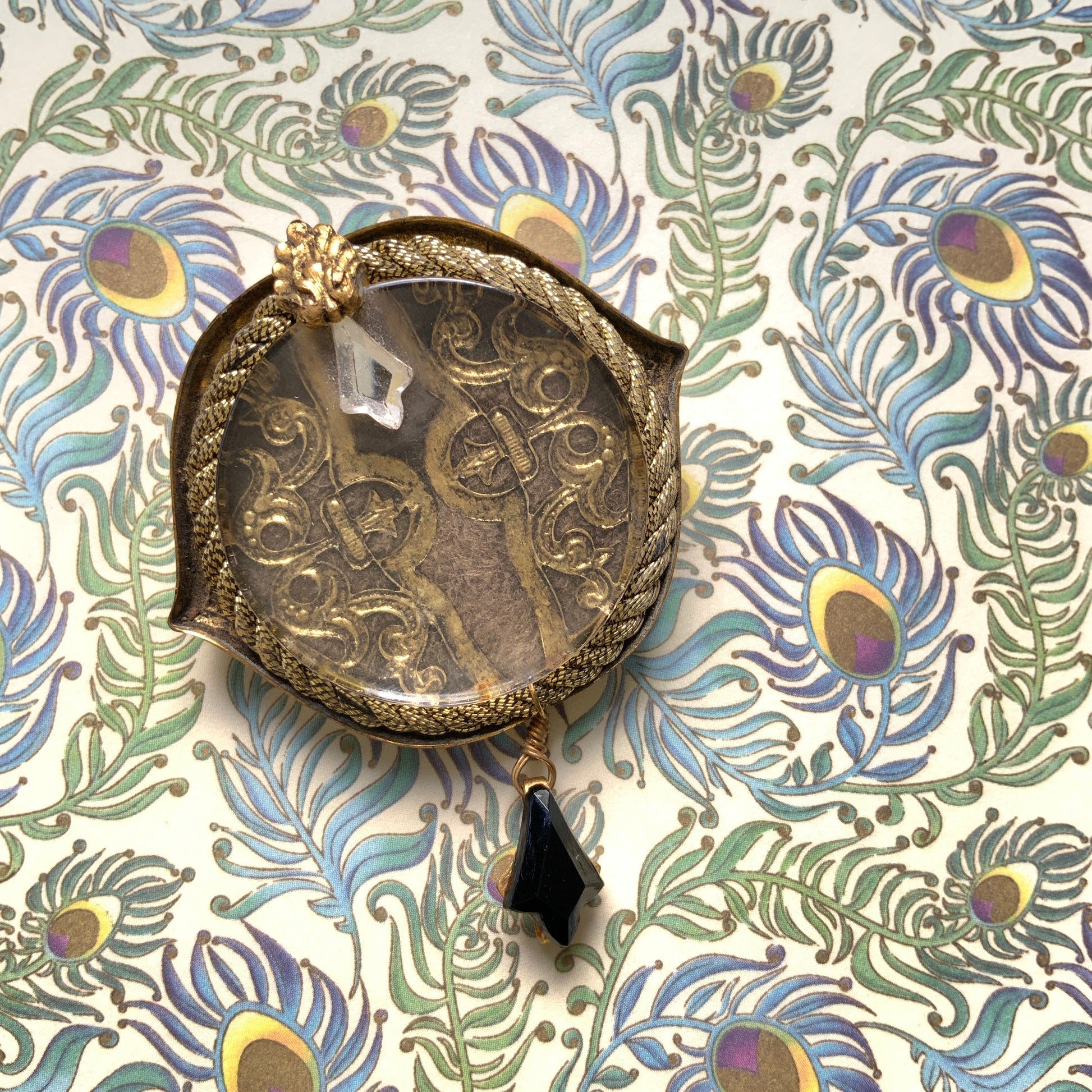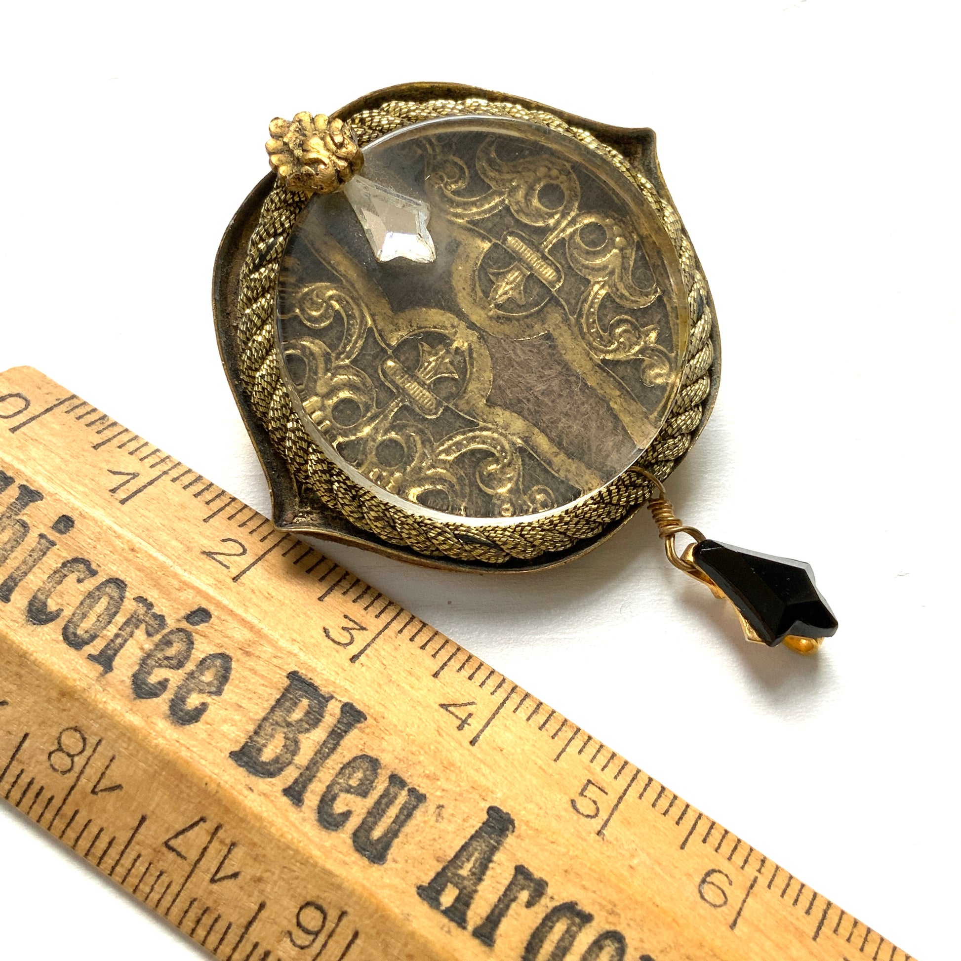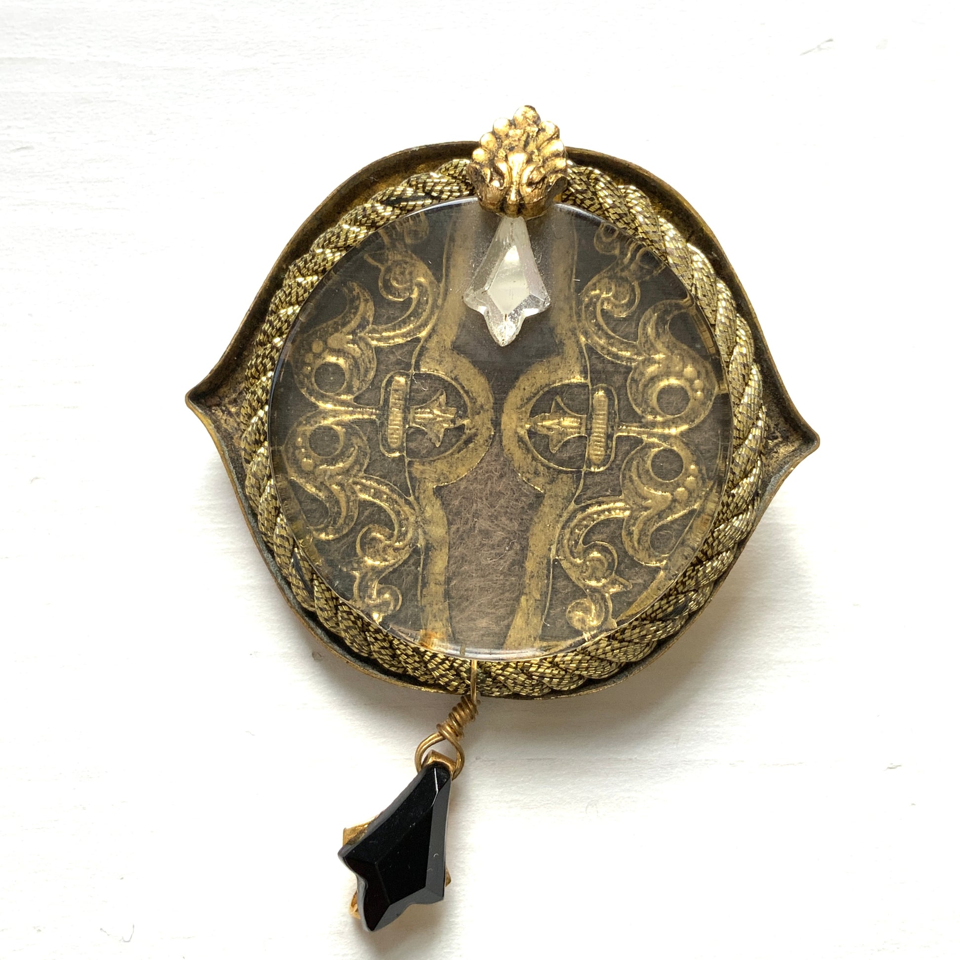 おそらくスエード生地の上にゴールドトーンのメタルや紐を組み合わせたユニークなデザインのブローチ。