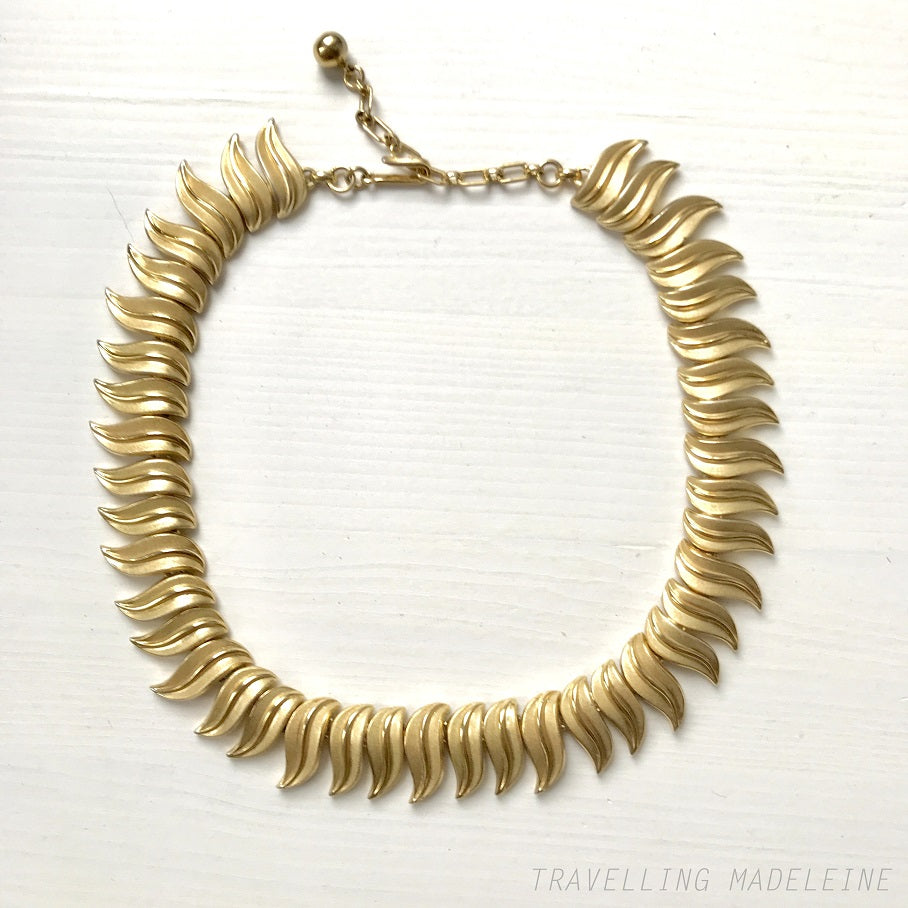 トリファリによる、流れるようなデザインが美しい黄金色のリーフのネックレス。