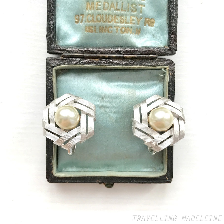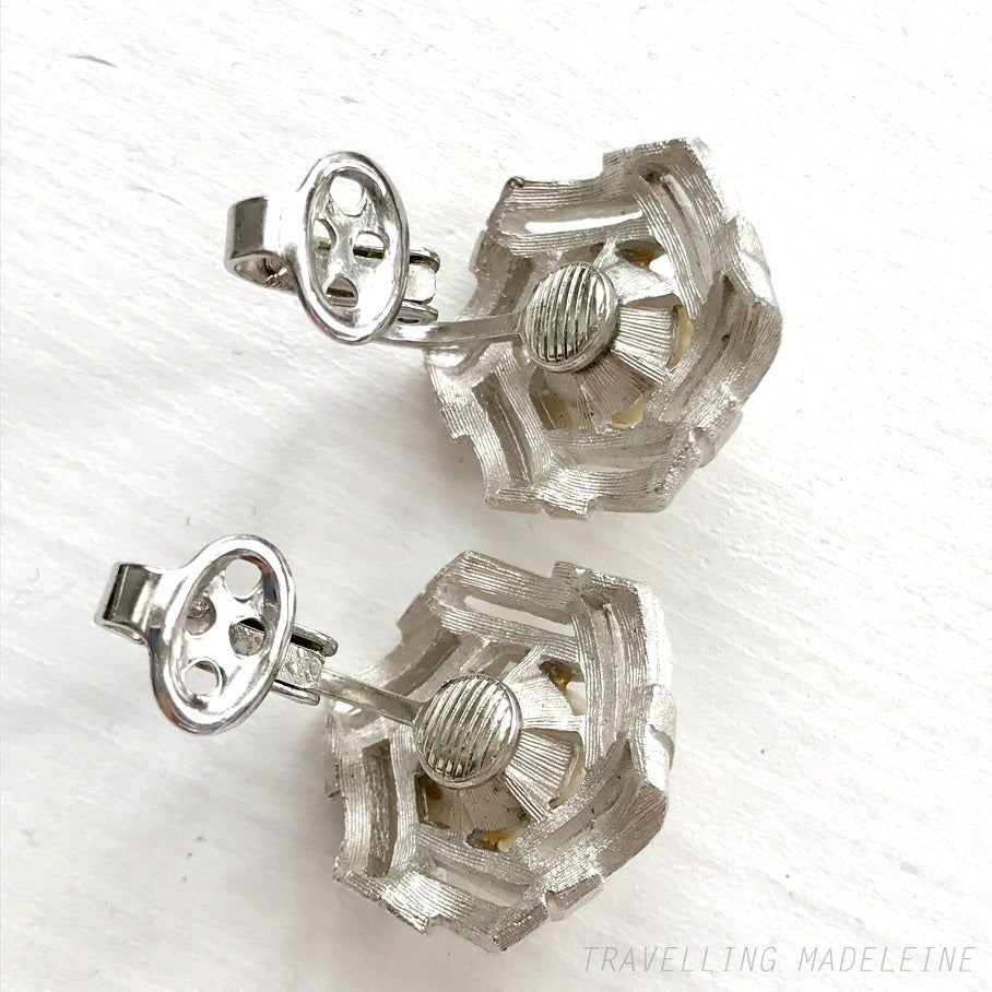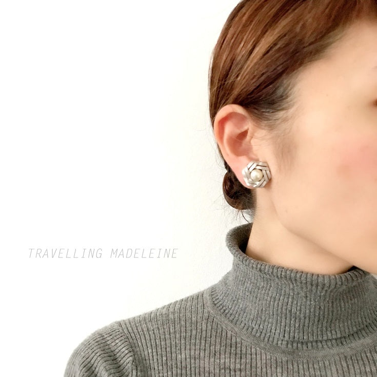 六角形に編みこんだシルバートーンメタルにパールを埋め込んだ、トリファリのクリップイヤリング。