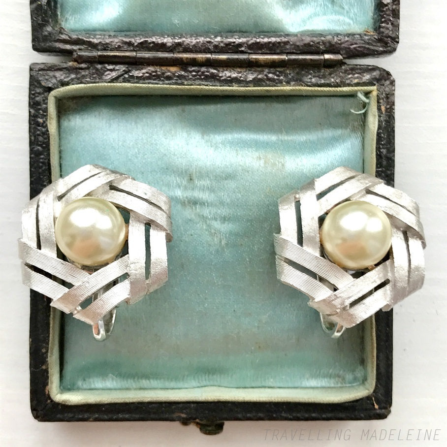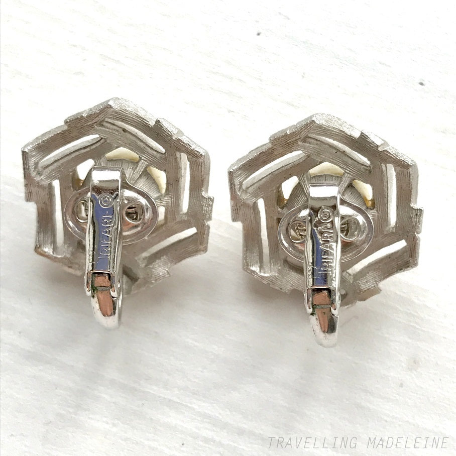 VINTAGE 1950-60's TRIFARI Silver Tone Hexagon & Pearl Clip Earrings