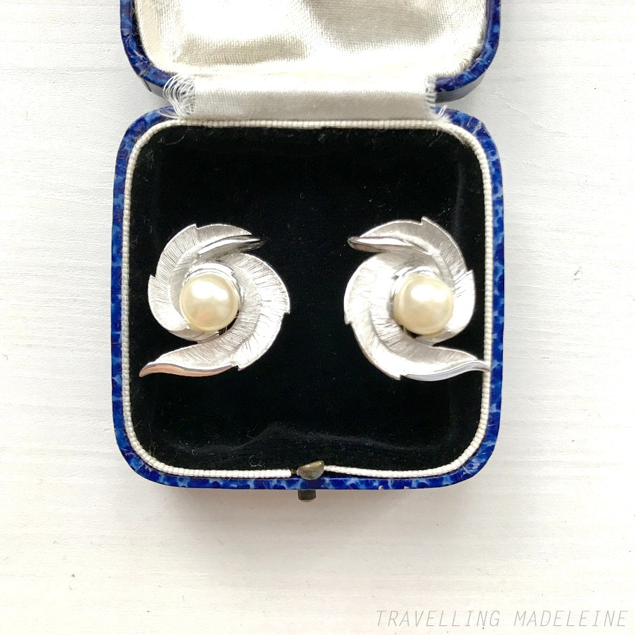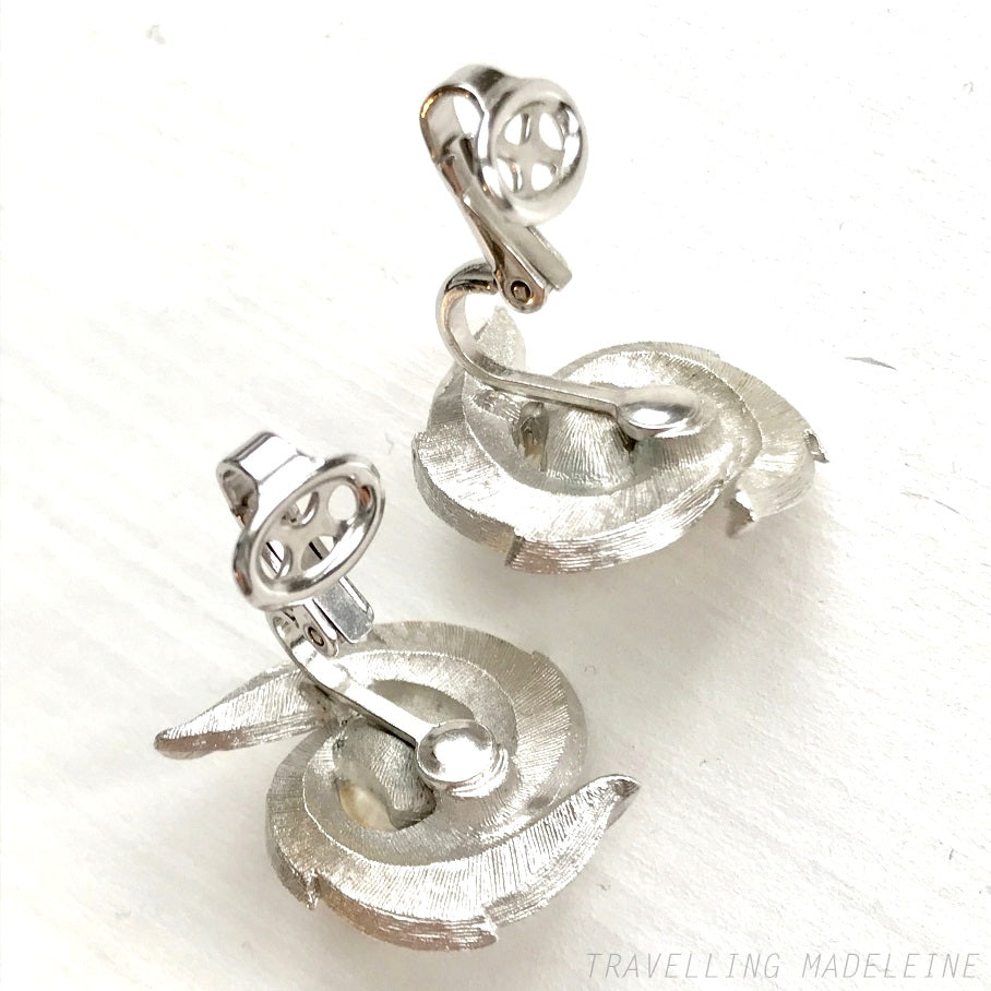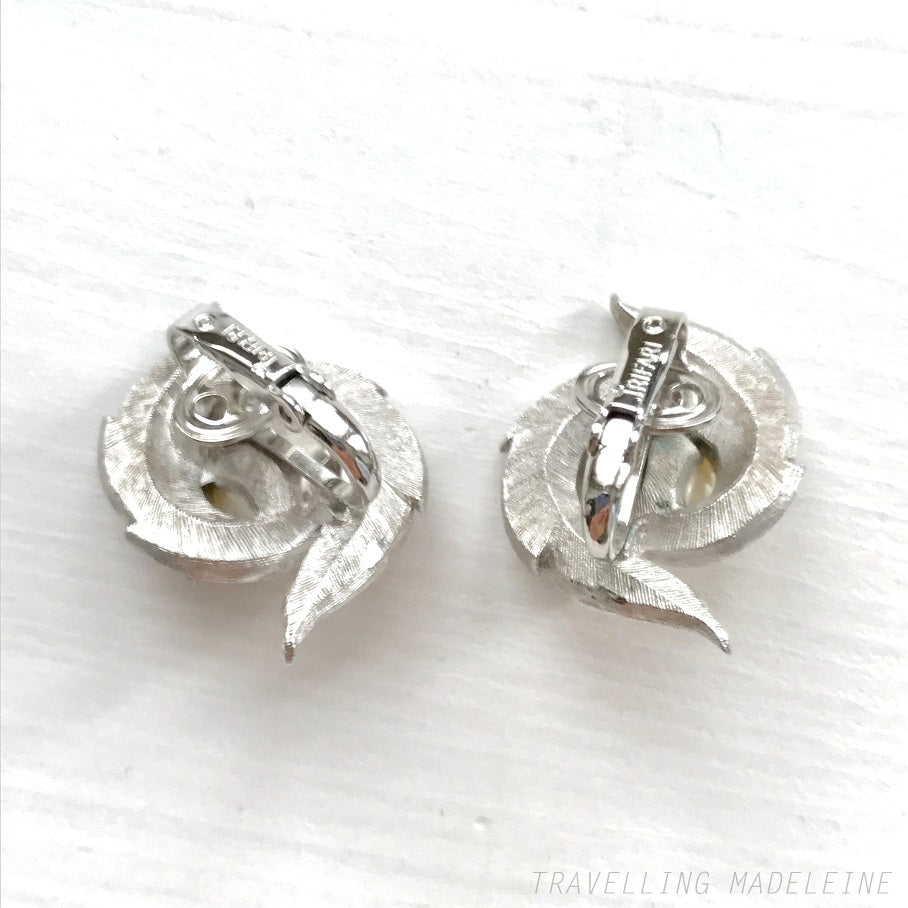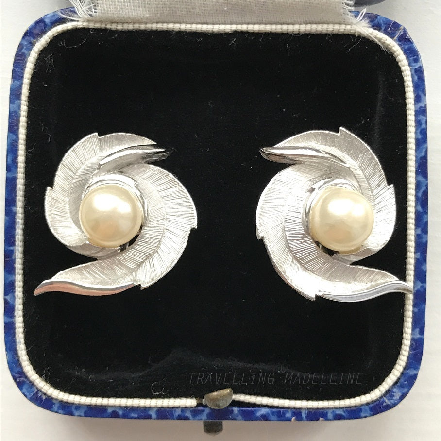 VINTAGE 1950-60's TRIFARI Silver Tone Swirl Leaves & Pearl Clip Earrings