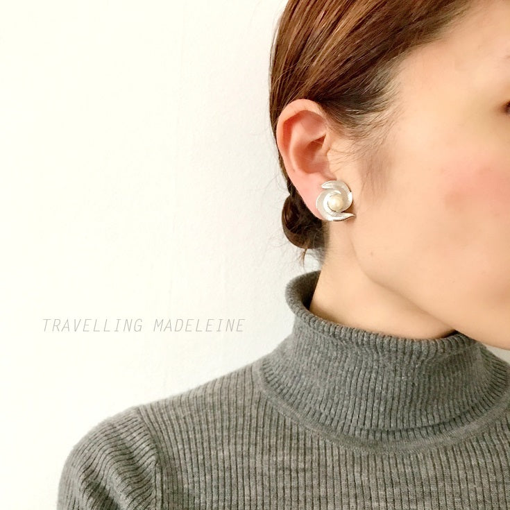 シルバートーンのリーフにグラスパールがくるまっている、トリファリのイヤリング。