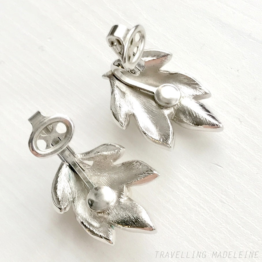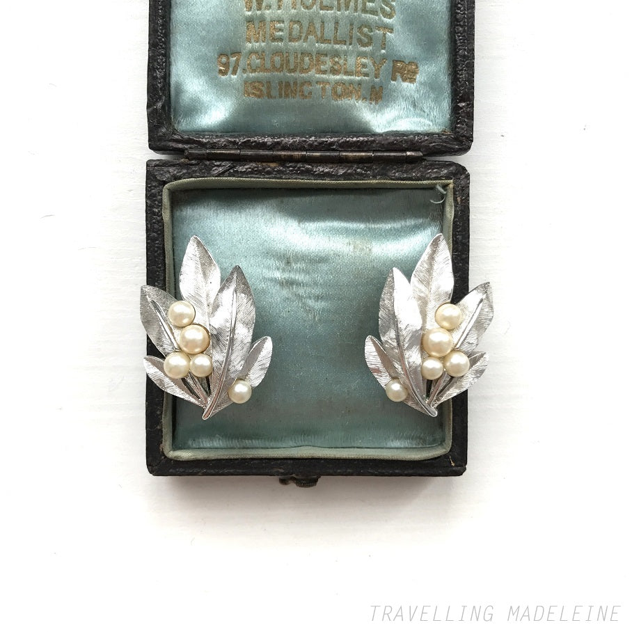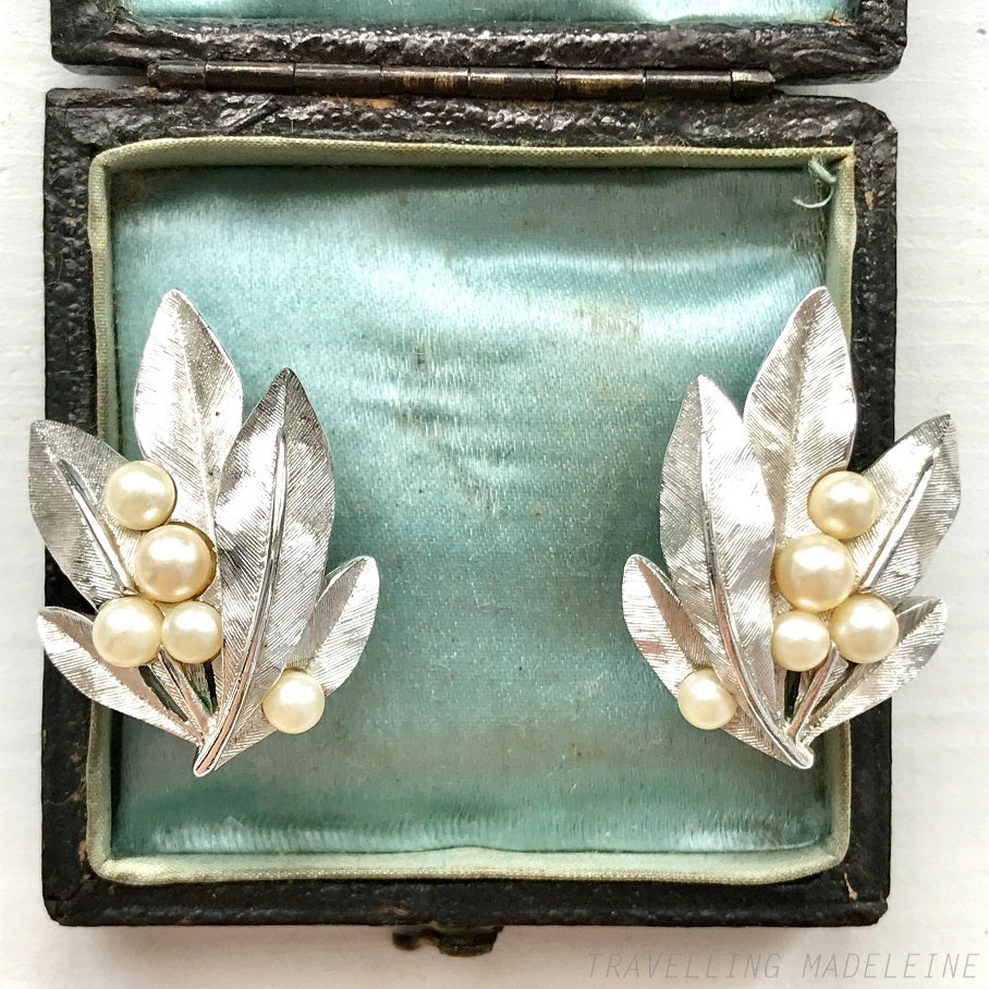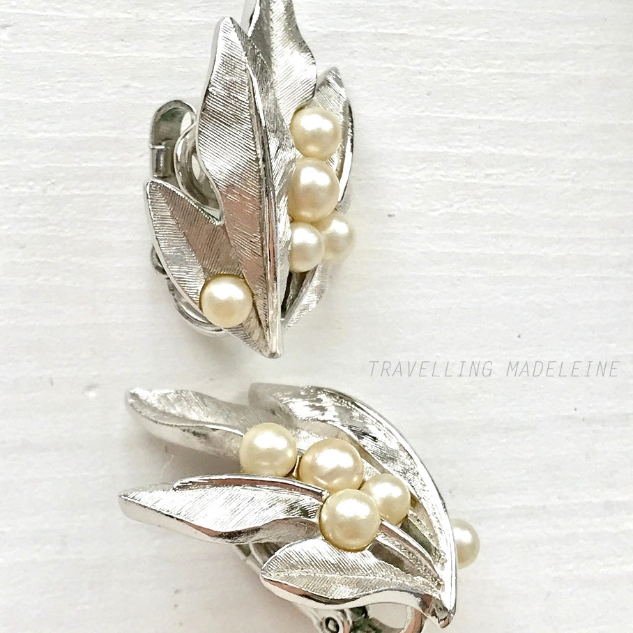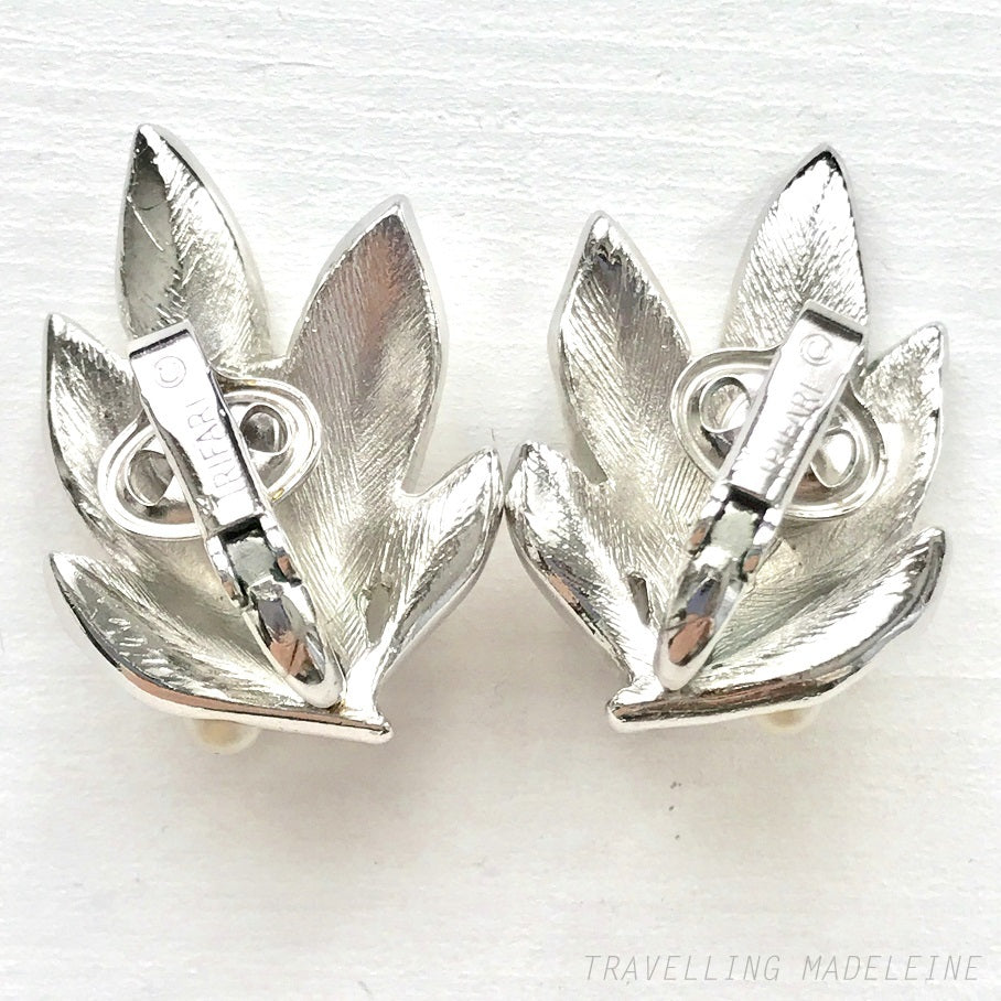 VINTAGE 1960's TRIFARI Silver Tone Leaves & Pearl Clip Earrings